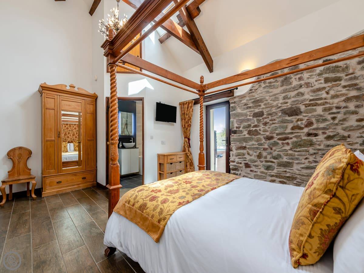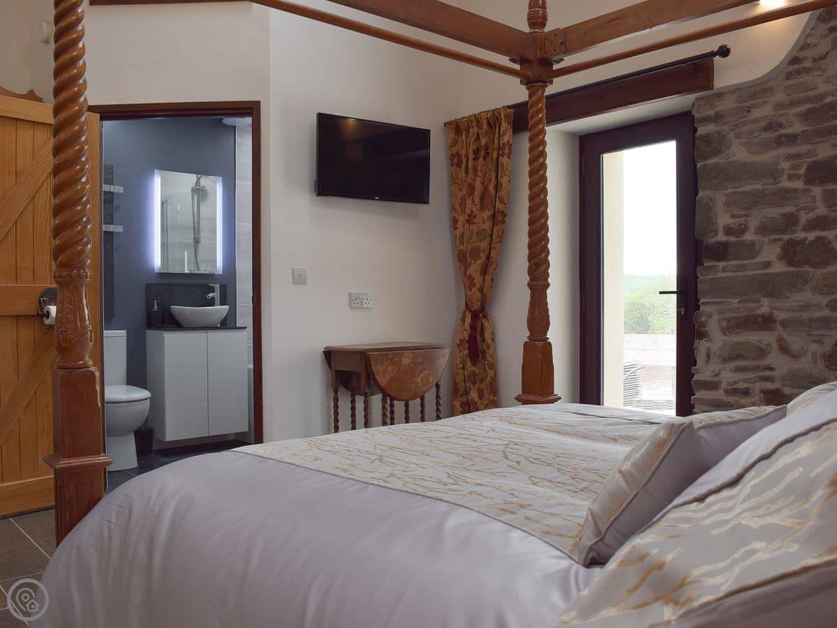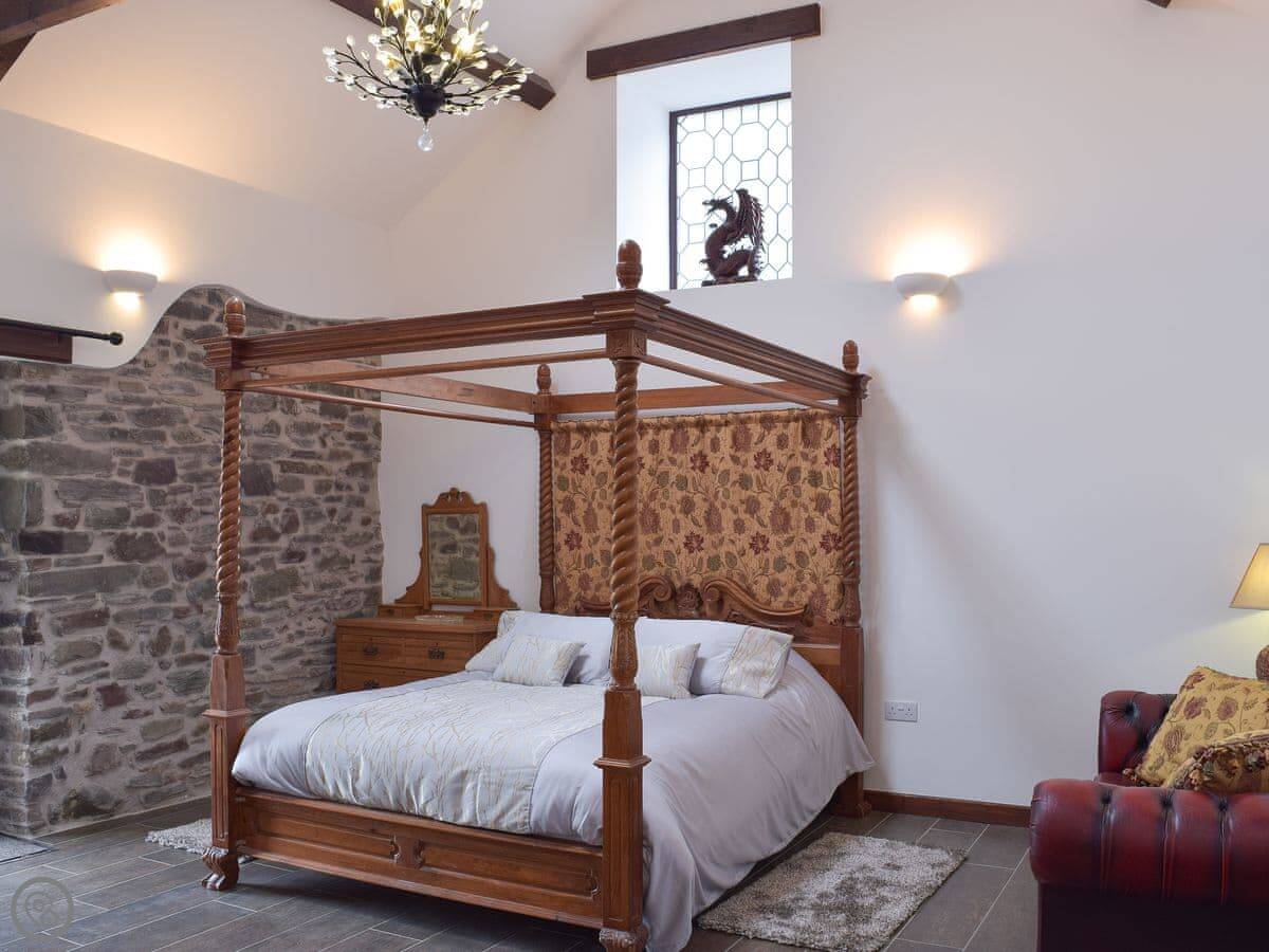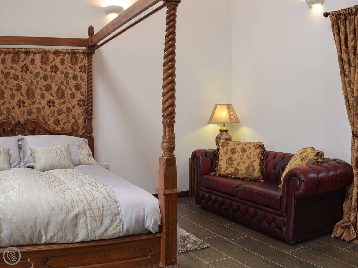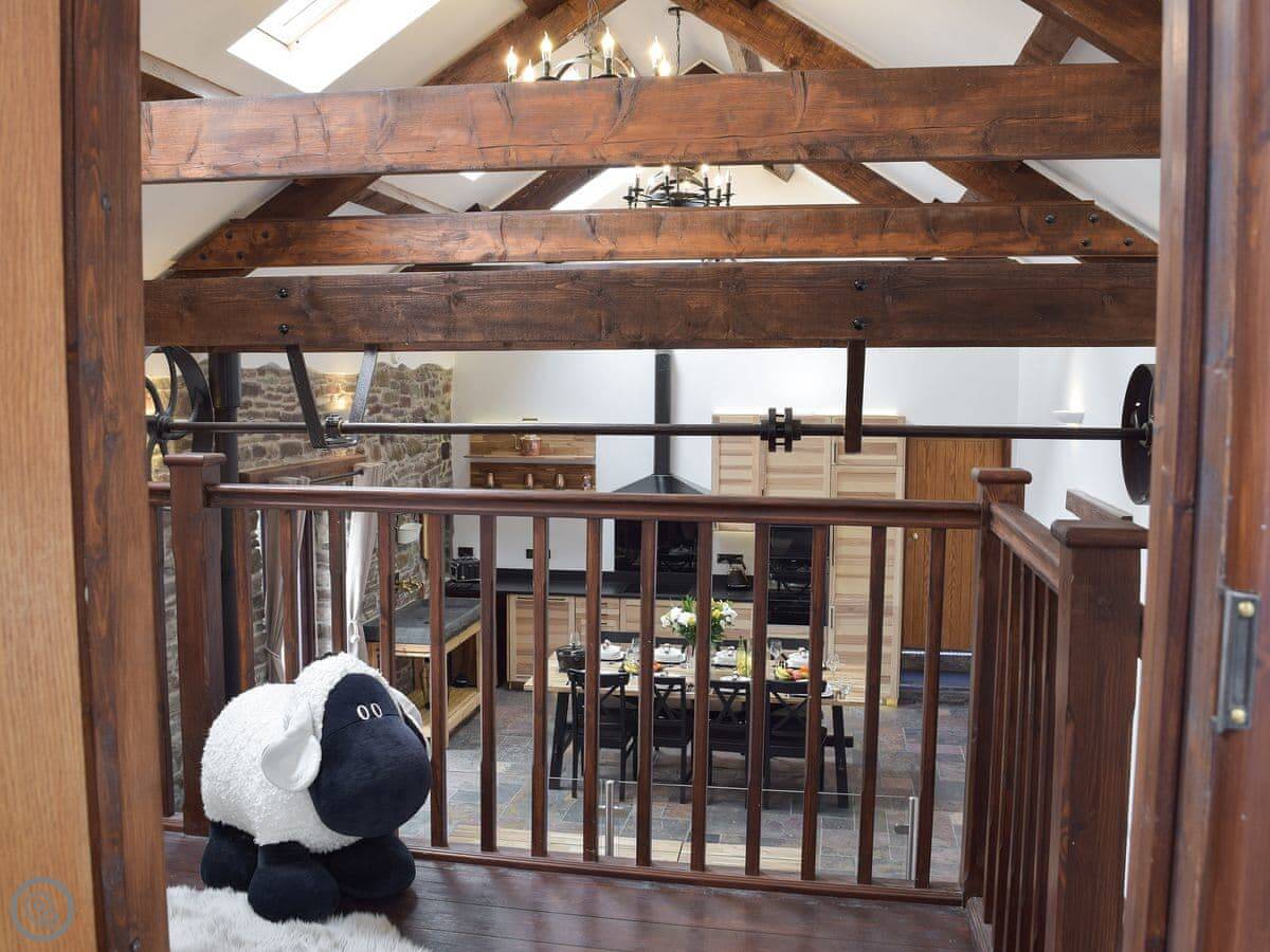 It sleeps eight people in four bedrooms. Every bedroom has its own bathroom, which is useful. The main one has a four-poster bed. The stairs are okay, but they're open tread and a bit steep, like you'd expect in a barn.