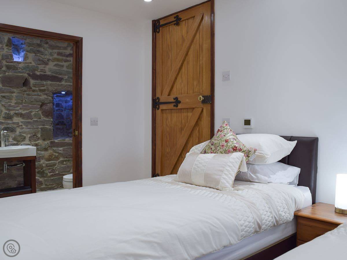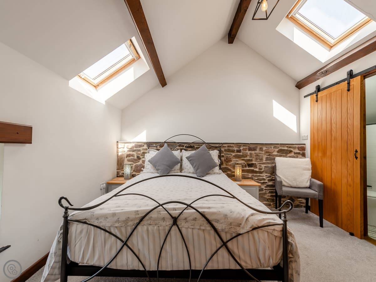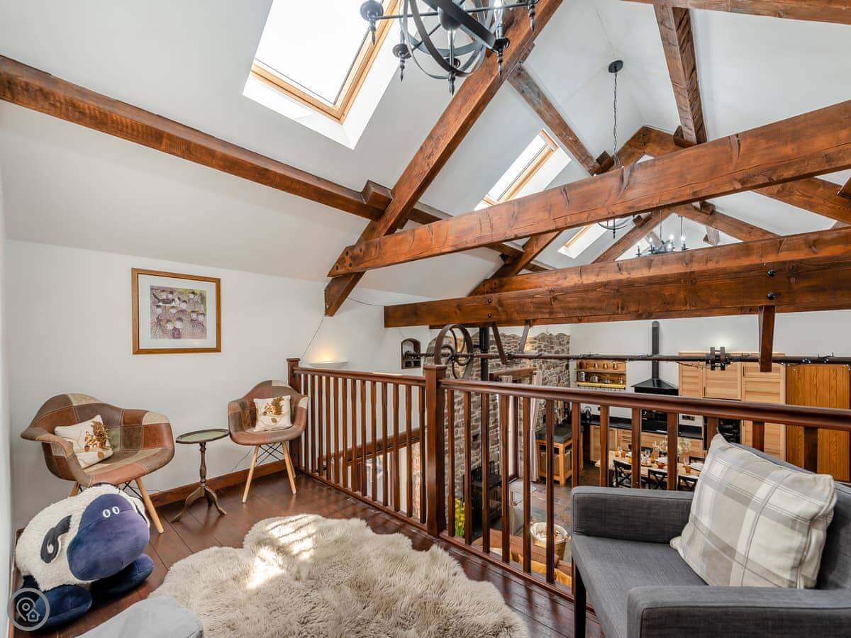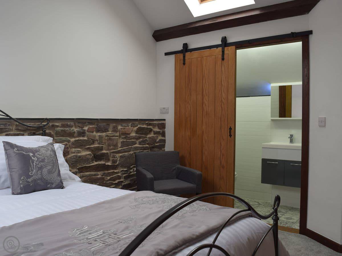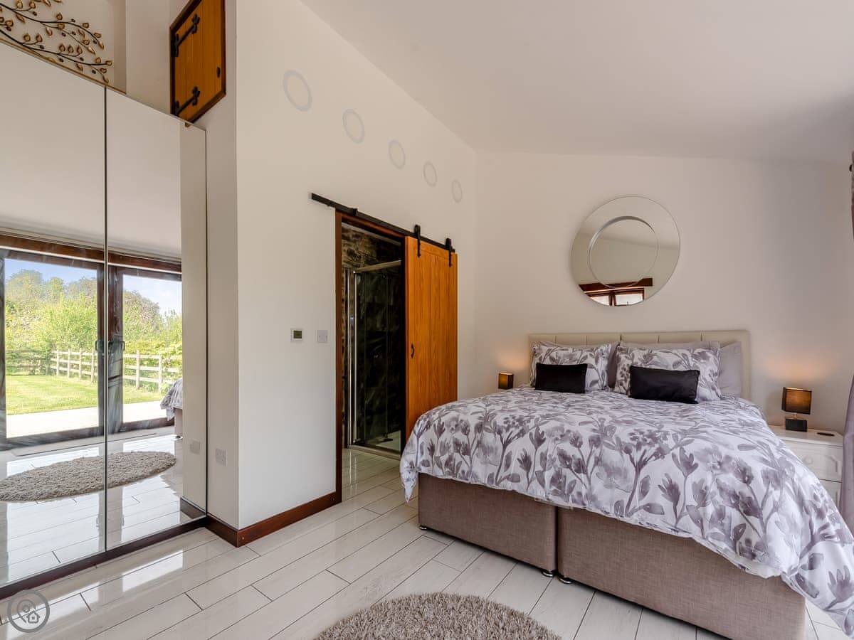 It sleeps eight people in four bedrooms. Every bedroom has its own bathroom, which is useful. The main one has a four-poster bed. The stairs are okay, but they're open tread and a bit steep, like you'd expect in a barn.