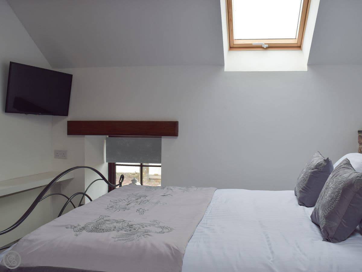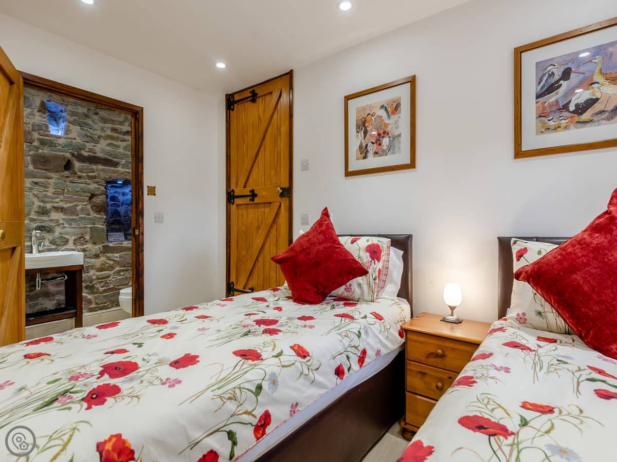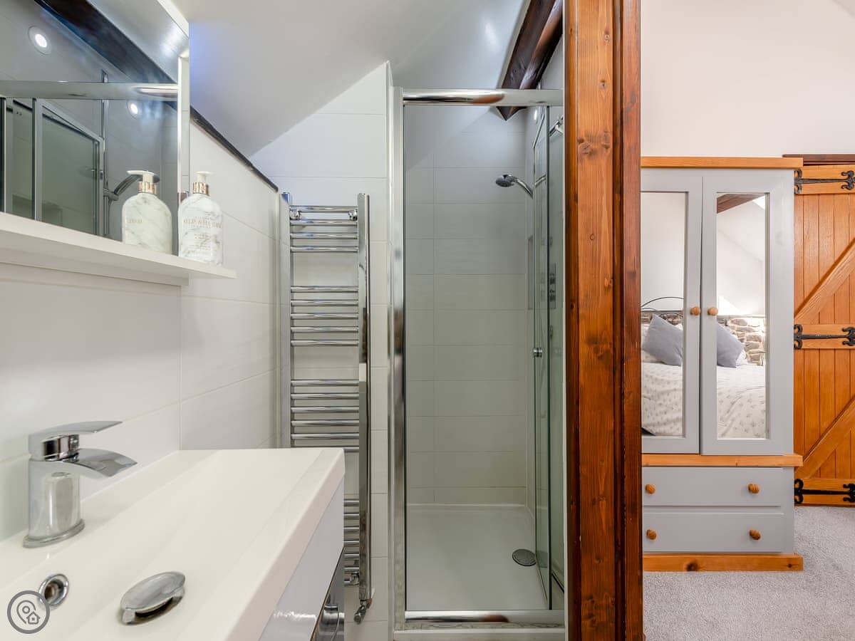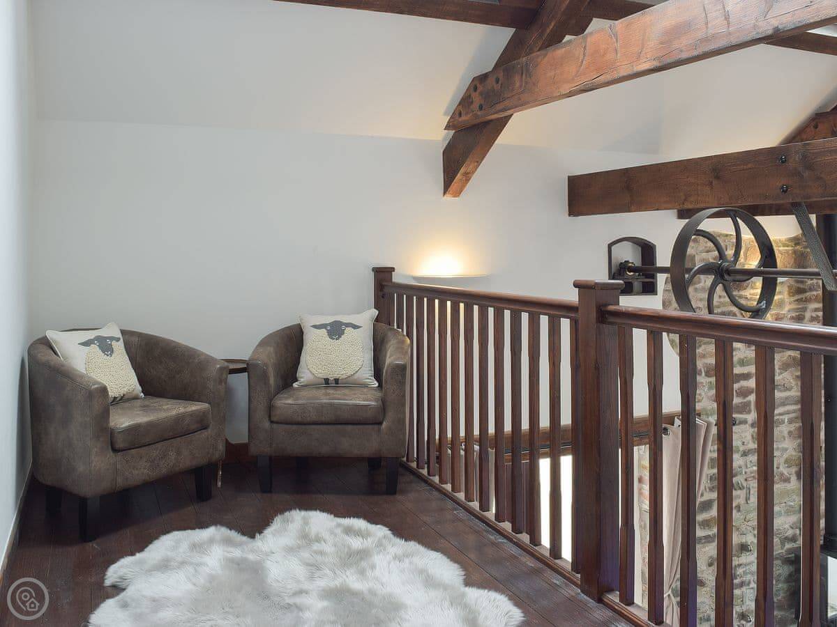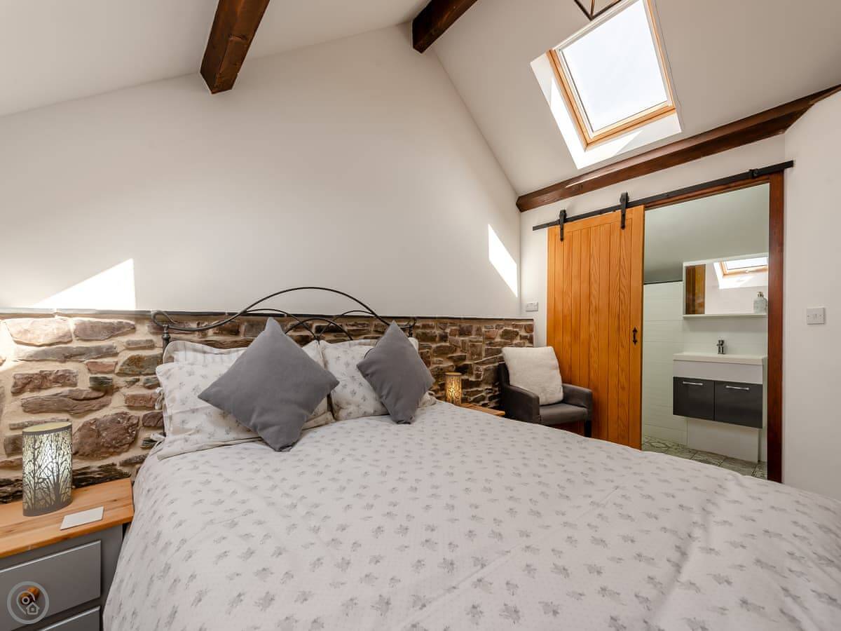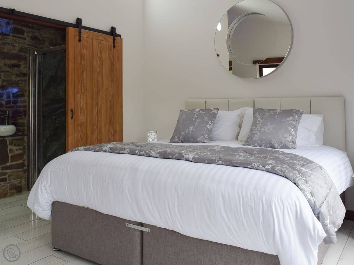 It sleeps eight people in four bedrooms. Every bedroom has its own bathroom, which is useful. The main one has a four-poster bed. The stairs are okay, but they're open tread and a bit steep, like you'd expect in a barn.