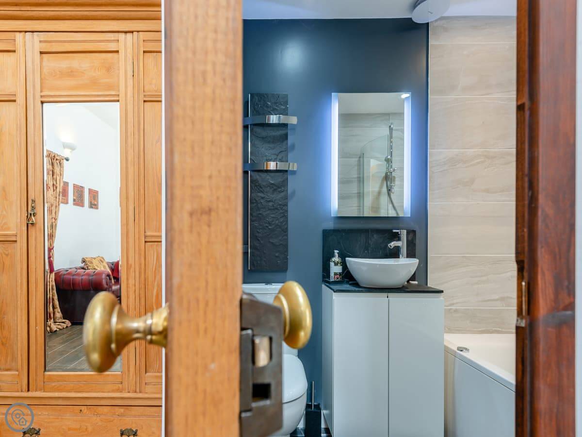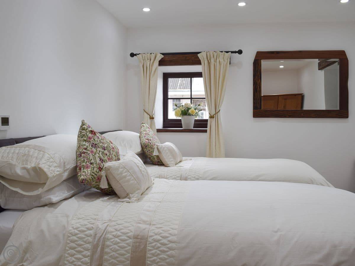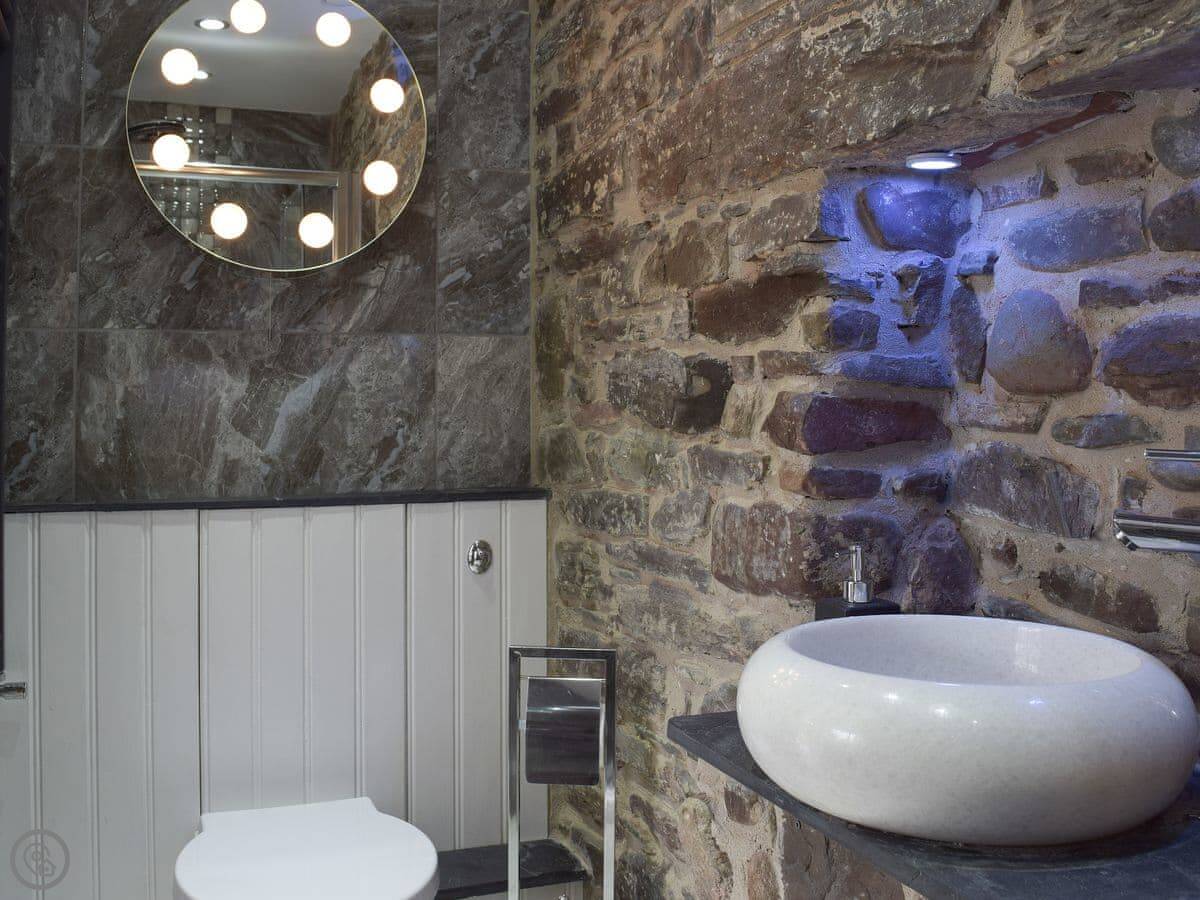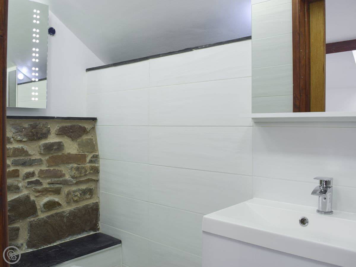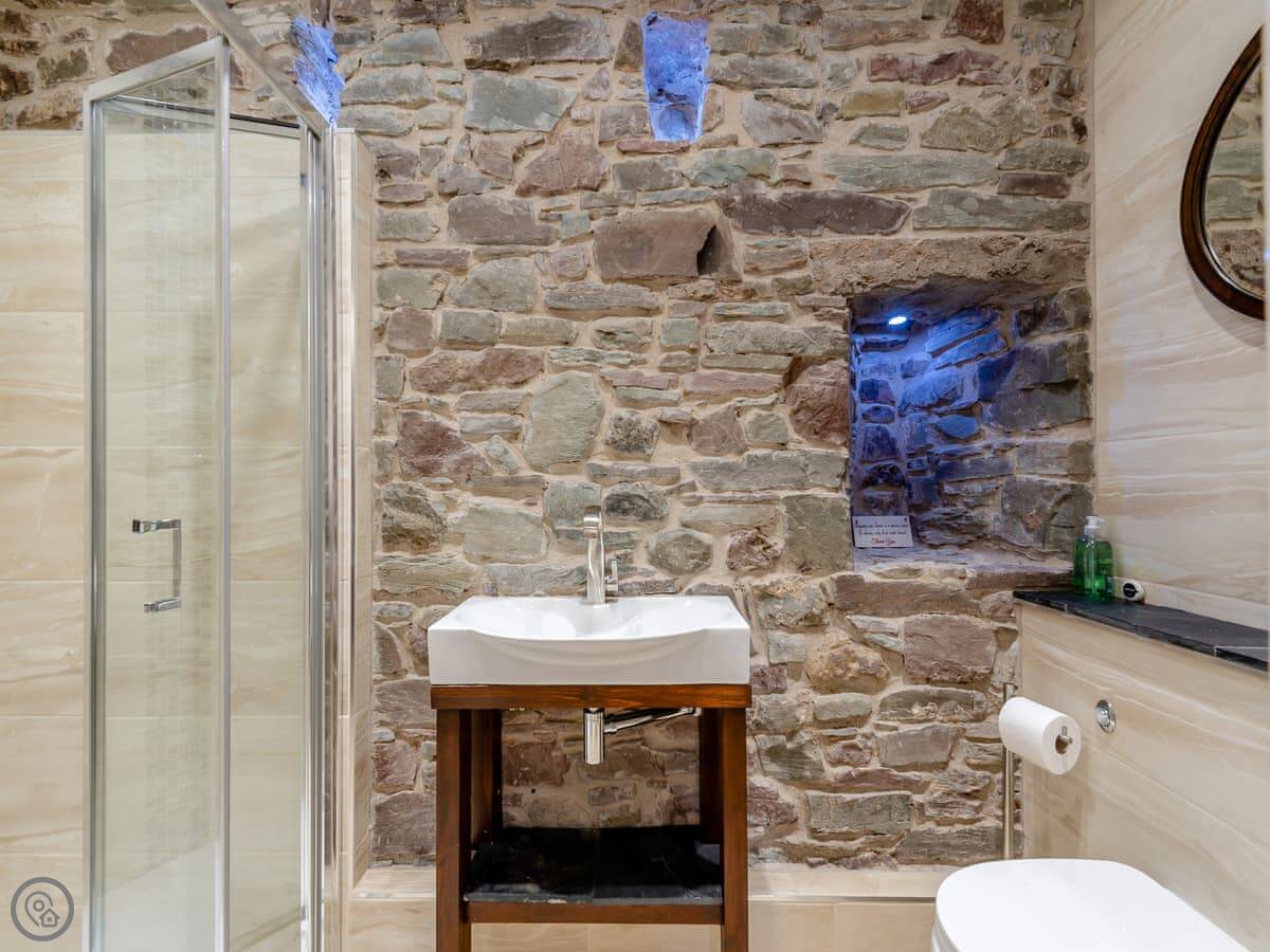 It sleeps eight people in four bedrooms. Every bedroom has its own bathroom, which is useful. The main one has a four-poster bed. The stairs are okay, but they're open tread and a bit steep, like you'd expect in a barn.