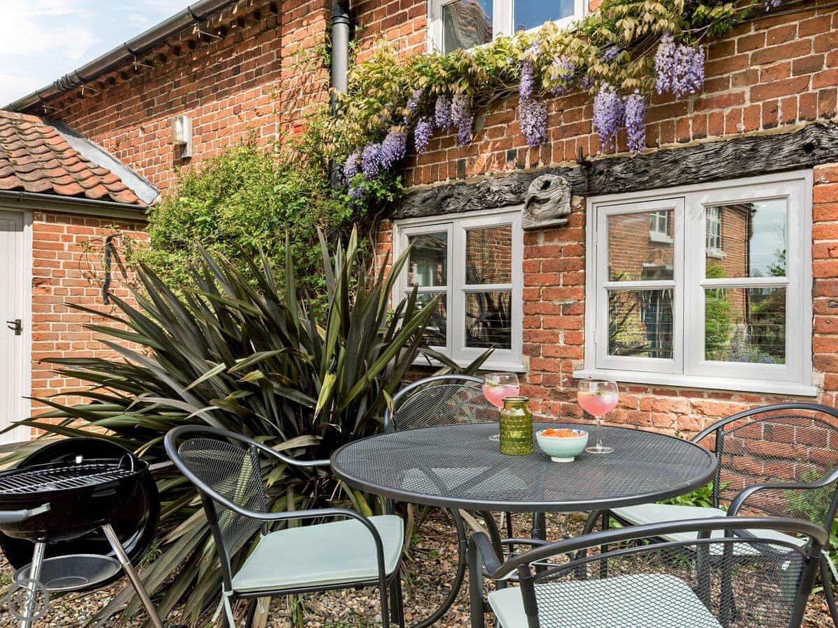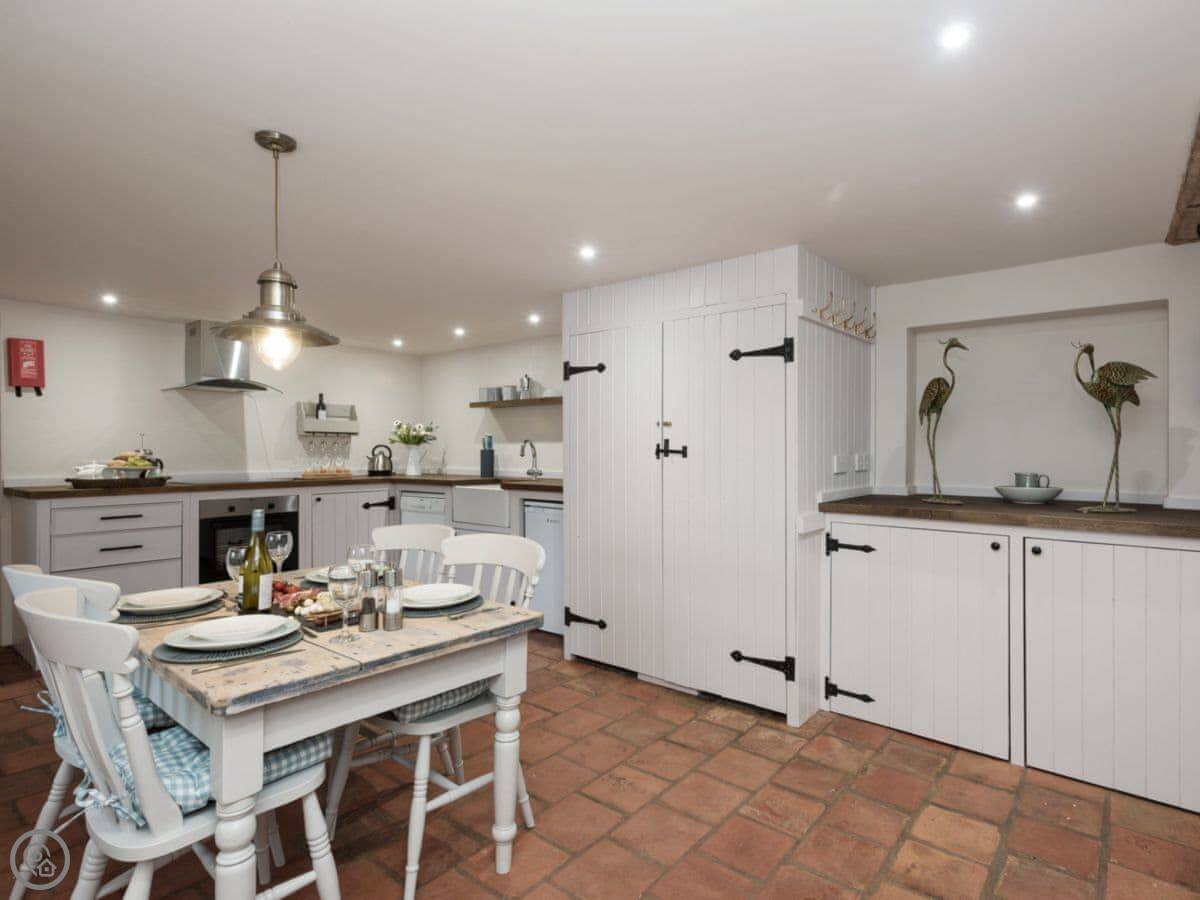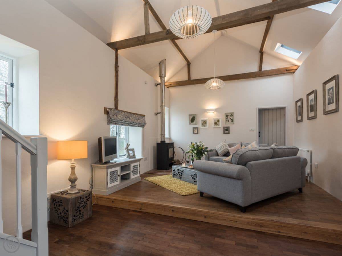 It's got a 5 Star rating. That means it's well-equipped and in good order. There's a wood burner in the living area. The kitchen has a dishwasher and washing machine. Outside is a small patio with a charcoal barbecue. If you're bringing dogs, you should know the patio isn't fully enclosed.