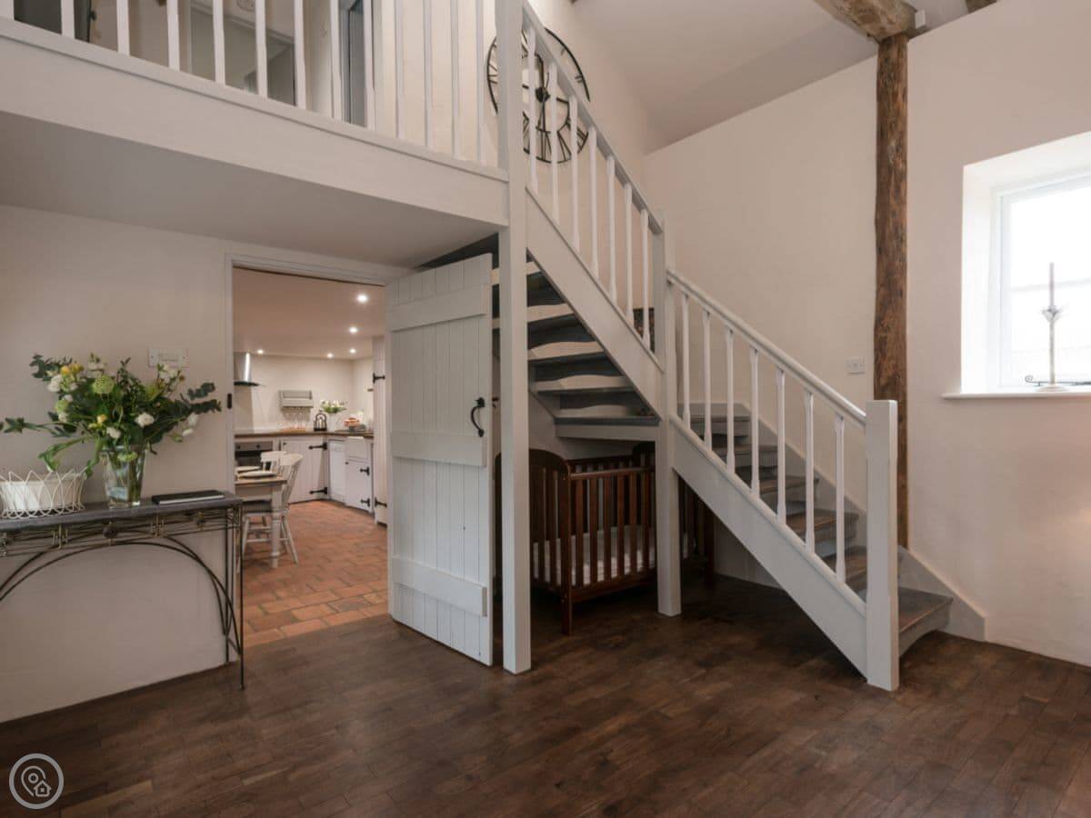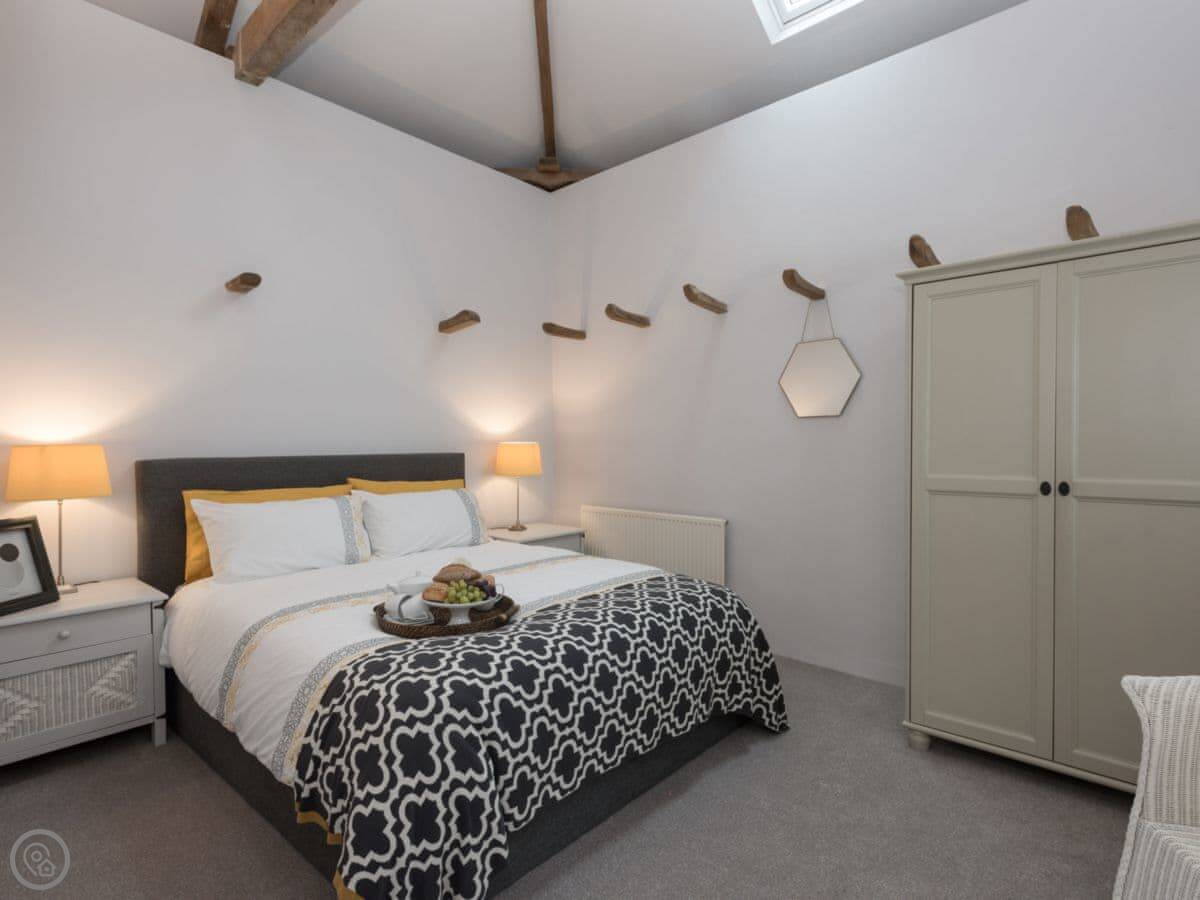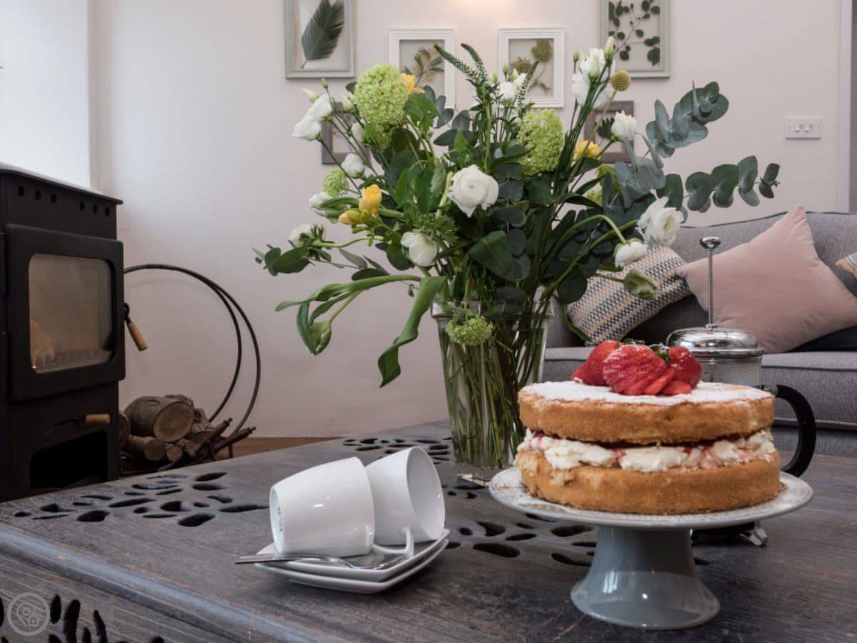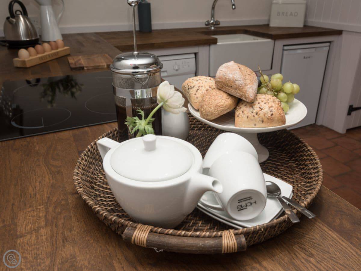 It's got a 5 Star rating. That means it's well-equipped and in good order. There's a wood burner in the living area. The kitchen has a dishwasher and washing machine. Outside is a small patio with a charcoal barbecue. If you're bringing dogs, you should know the patio isn't fully enclosed.