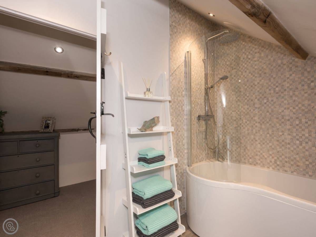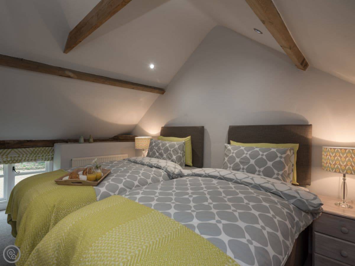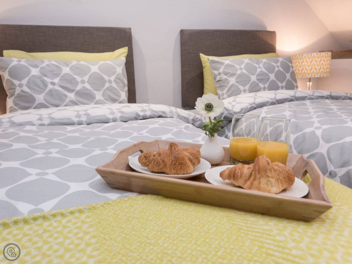 It sleeps four. Two bedrooms. One is on the ground floor with a kingsize bed. The other has two singles that can be joined into a super kingsize. There's one bathroom upstairs with a shower over the bath.
