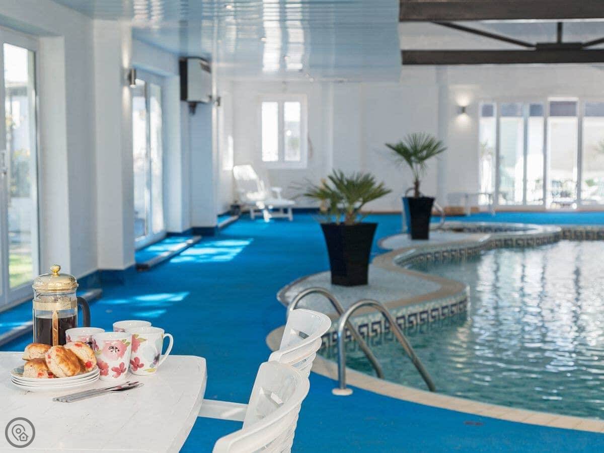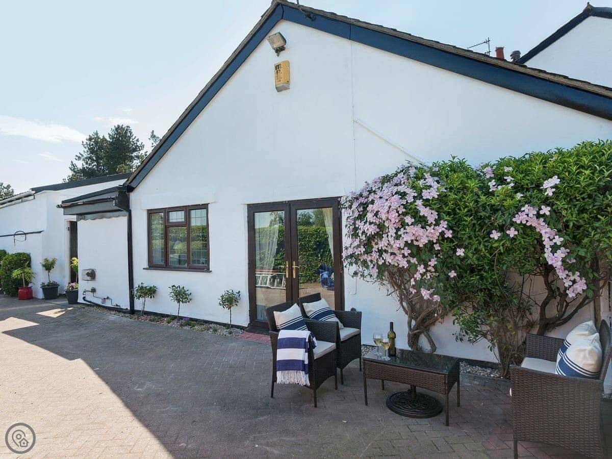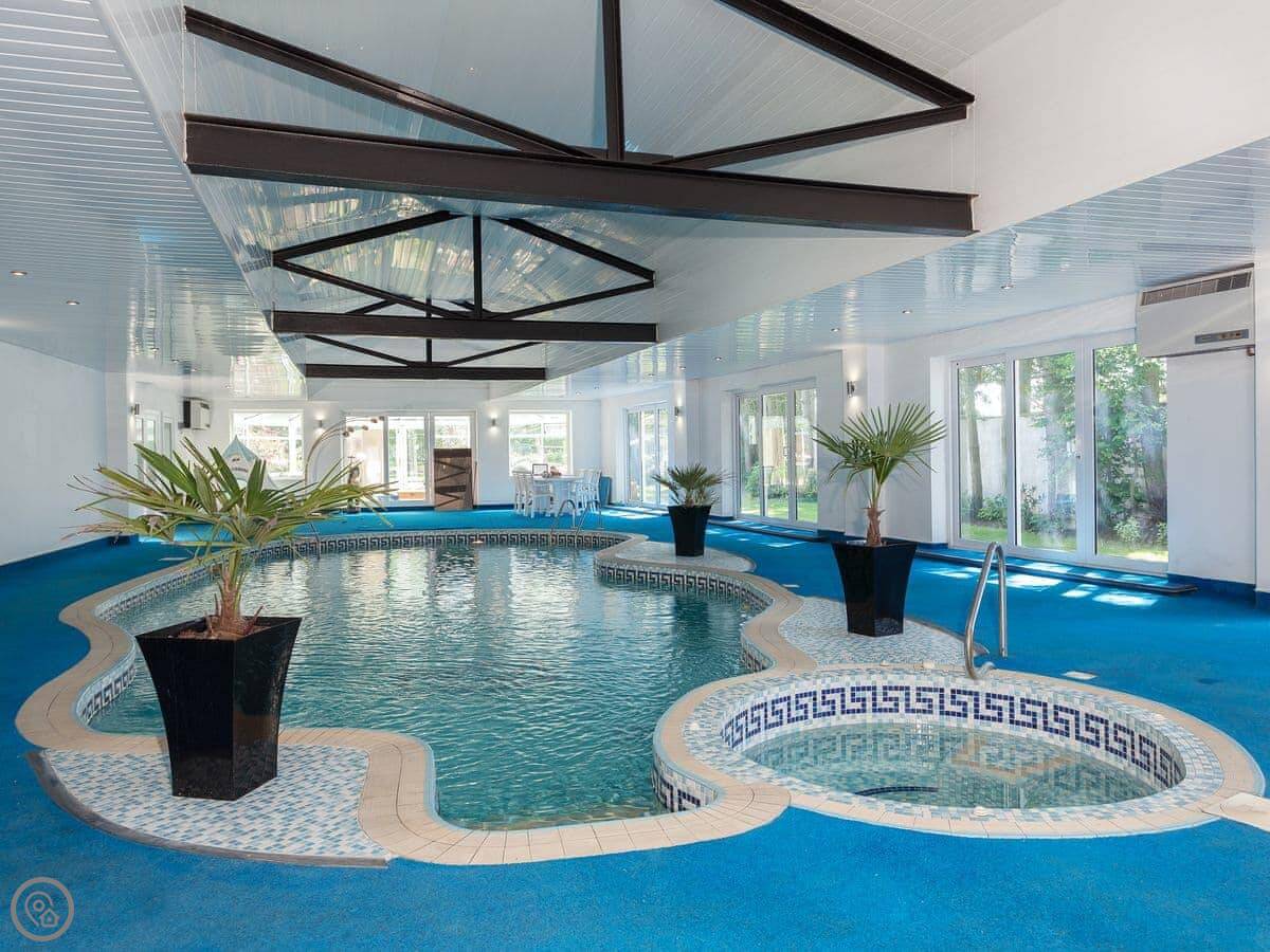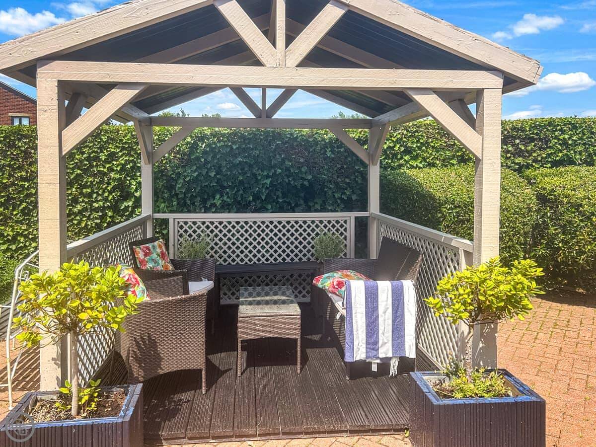 The main thing is you get access to a private leisure building. There's a good sized indoor swimming pool. It's warm. Outside, there's an enclosed patio garden with a barbecue.