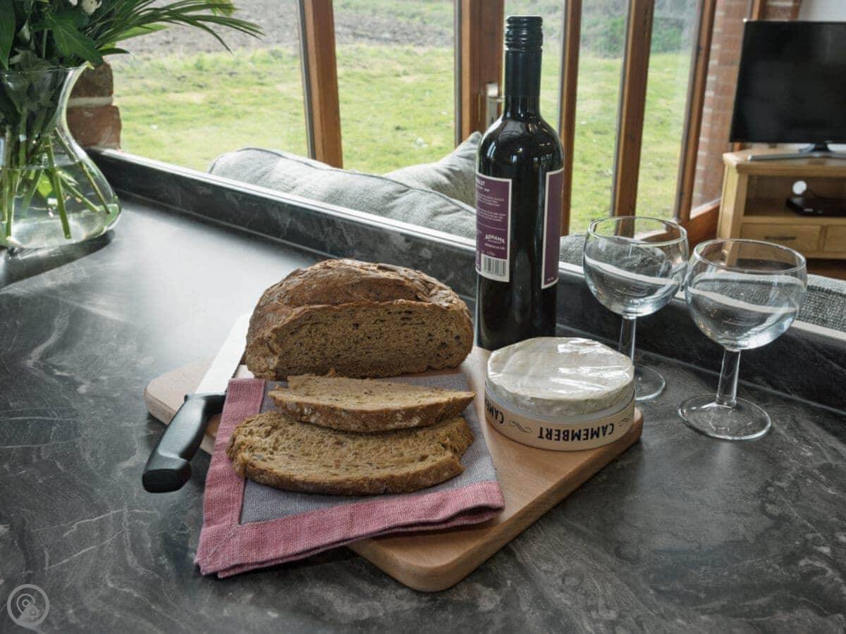 The main room is open plan with big windows. It's bright and you get a good view of the fields and the sky.