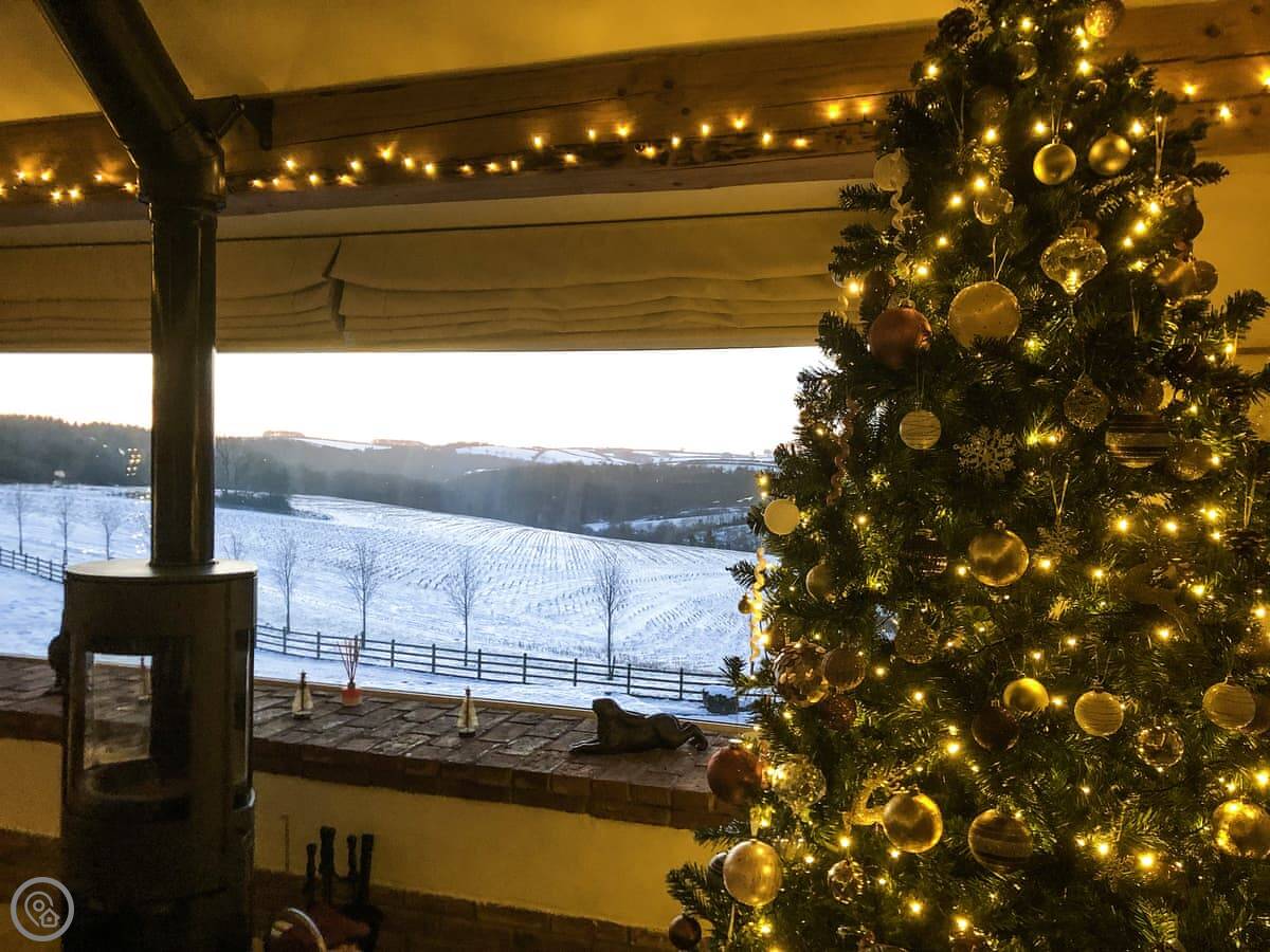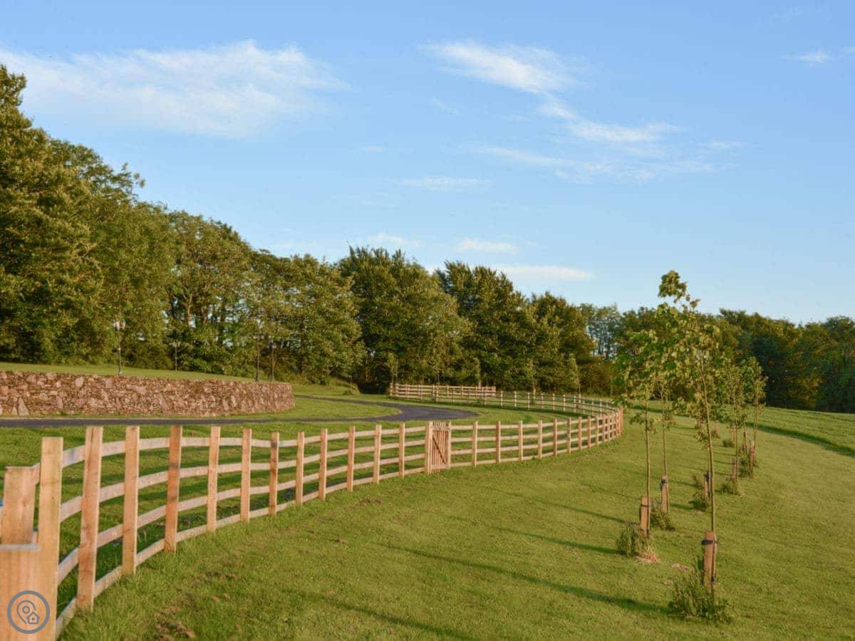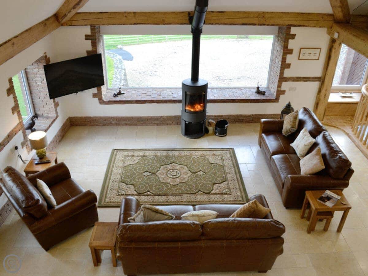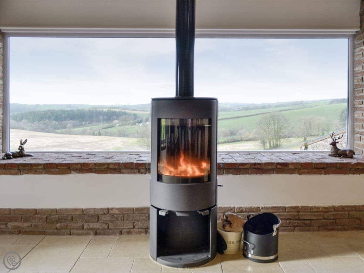 It sleeps six people, in two bedrooms. There are two bathrooms. It's got a 5 Star rating, which means it's very well-equipped and comfortable. The main room is open plan, with a big picture window looking out over the fields. That's the best bit. There's a multi-fuel stove for cooler evenings, which works well.
