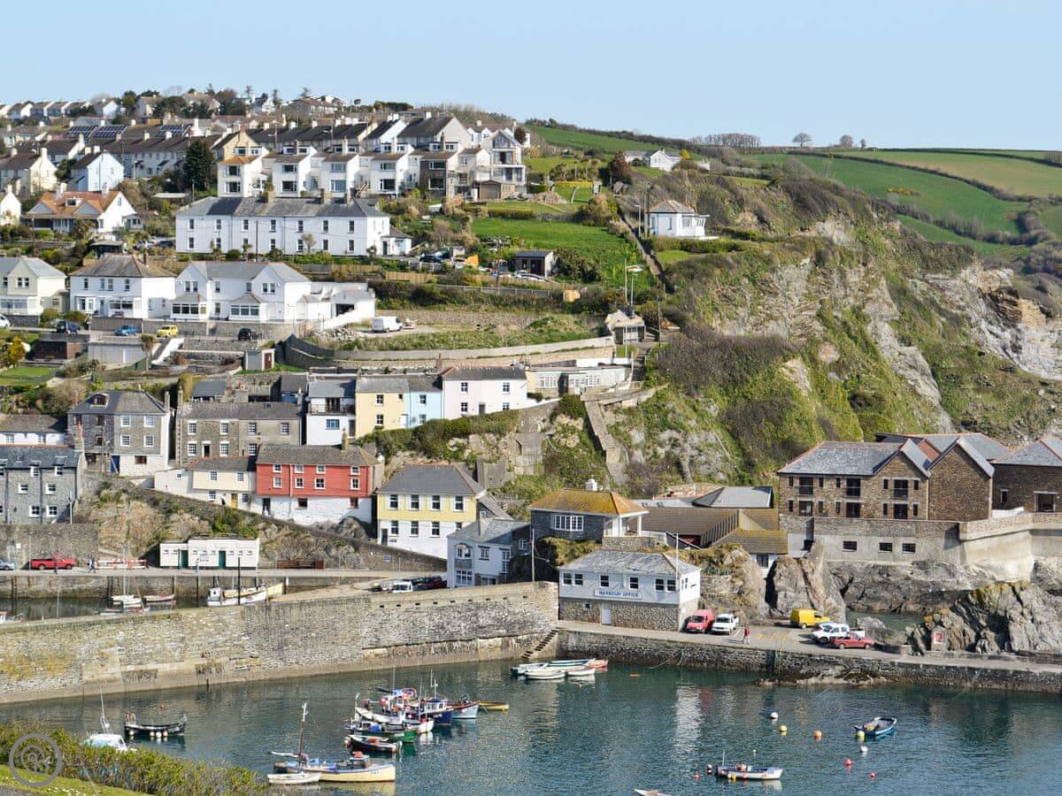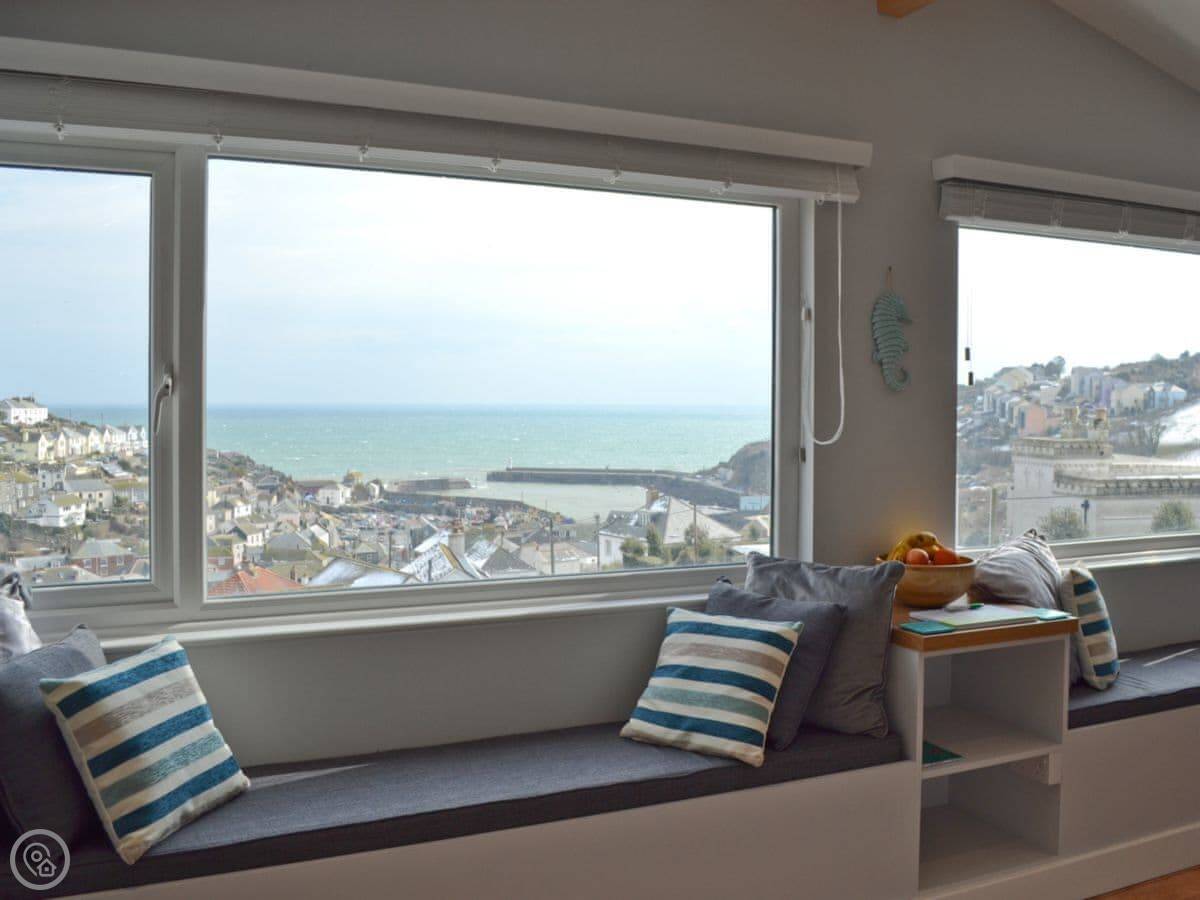 It sleeps six, with three bedrooms and two bathrooms. It’s got a 4 Star rating. It’s modern and light, and the main thing is the view. You look right over the village rooftops to the harbour and the sea. You can watch the boats come and go.
