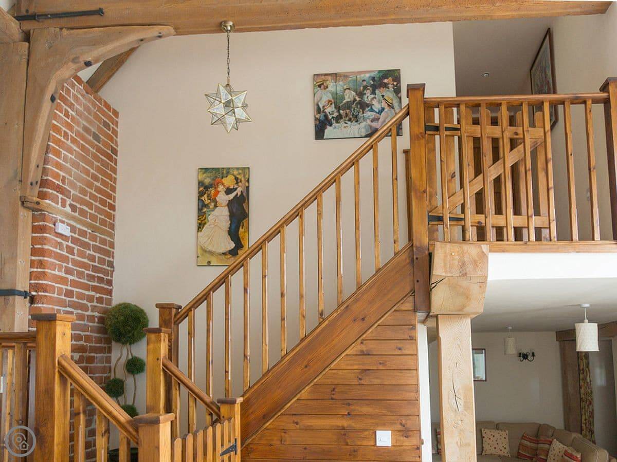 Because it's an old building, the ceilings are high in the main living area. The stairs to the first-floor bedrooms are a proper farmhouse staircase, so they're quite steep and turn a corner.