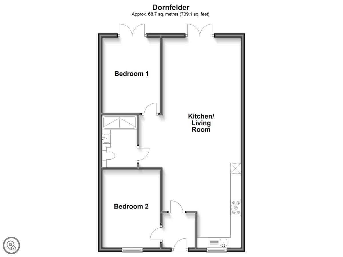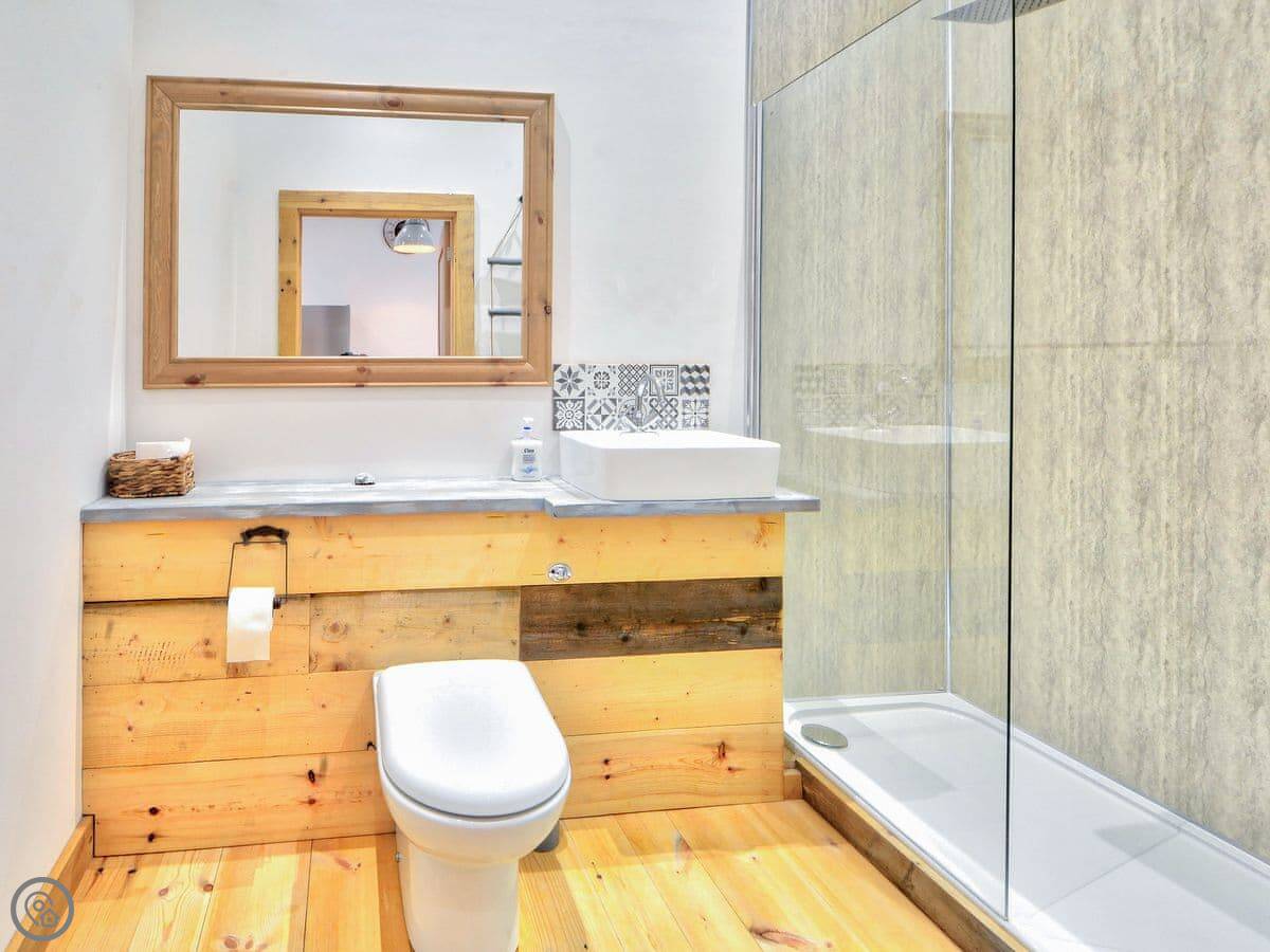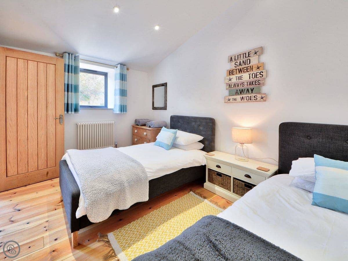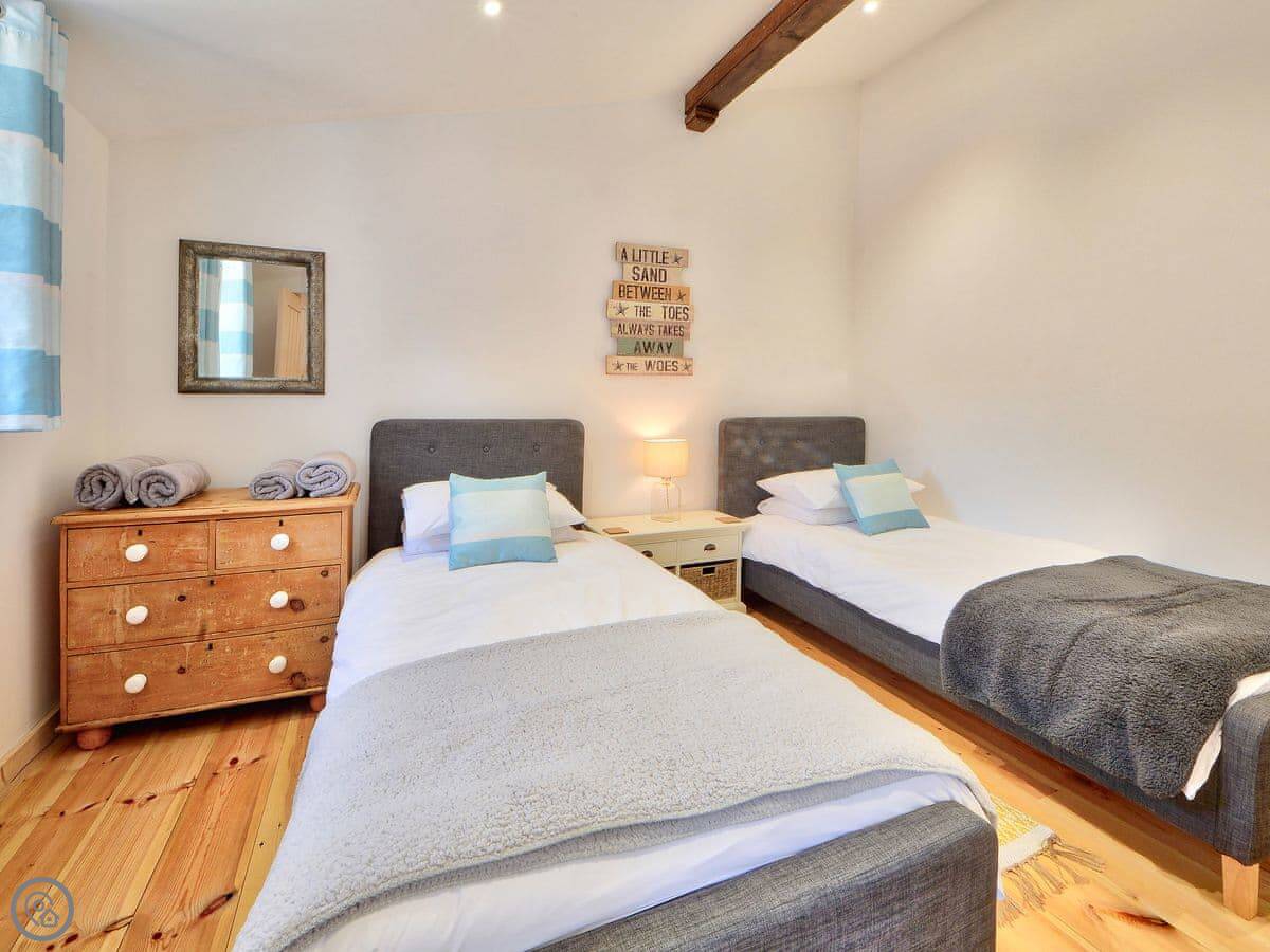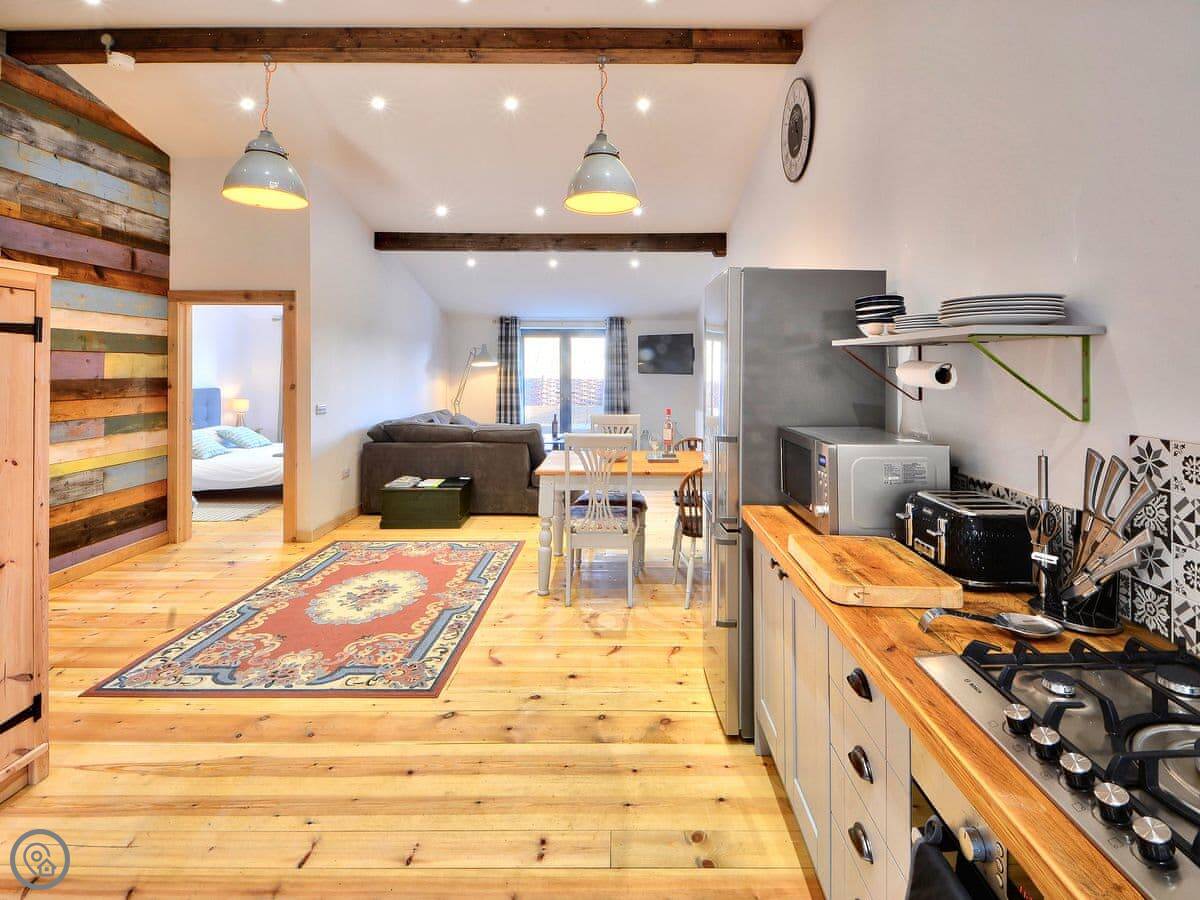 It sleeps four. Two bedrooms and one bathroom. It's got a 4 Star rating, which means it's comfortable and well looked after. Everything's open plan inside, with wooden floors and beams on the ceilings.