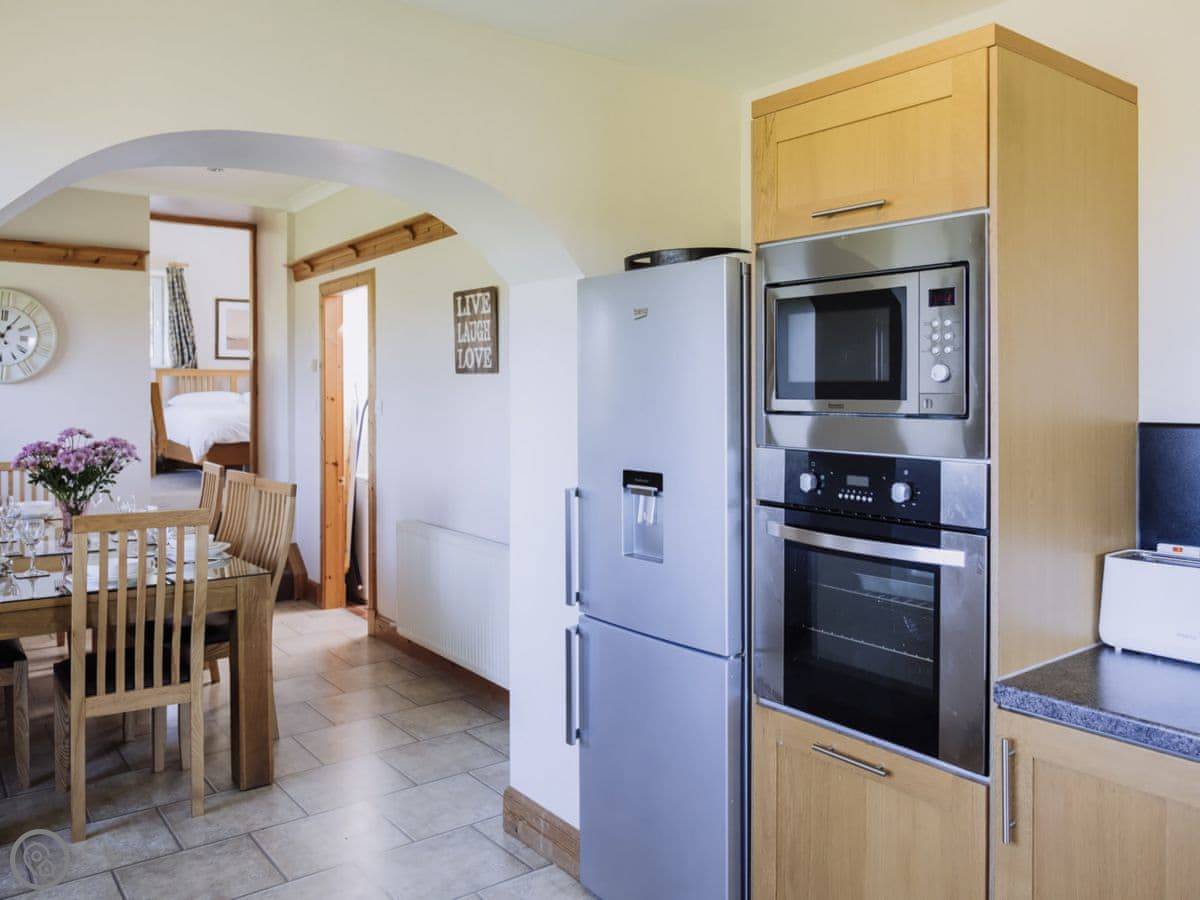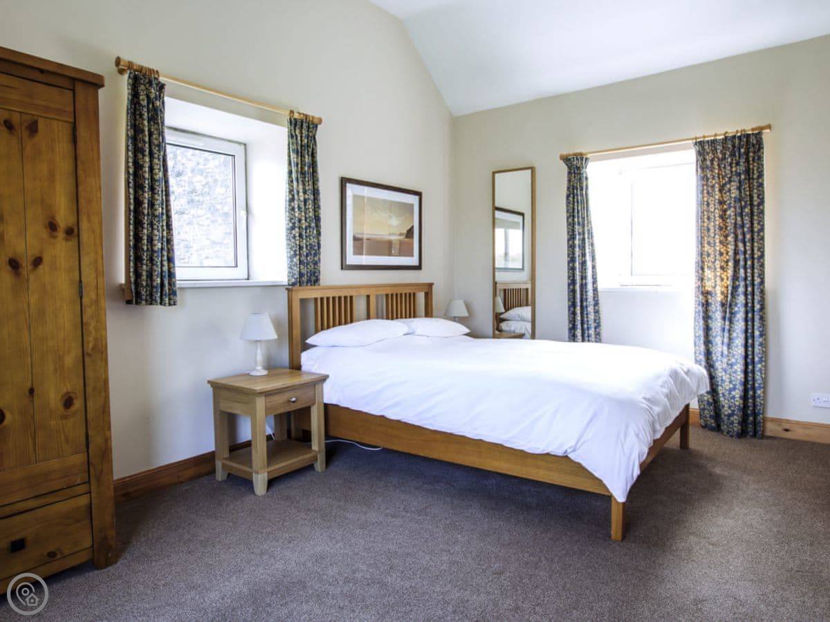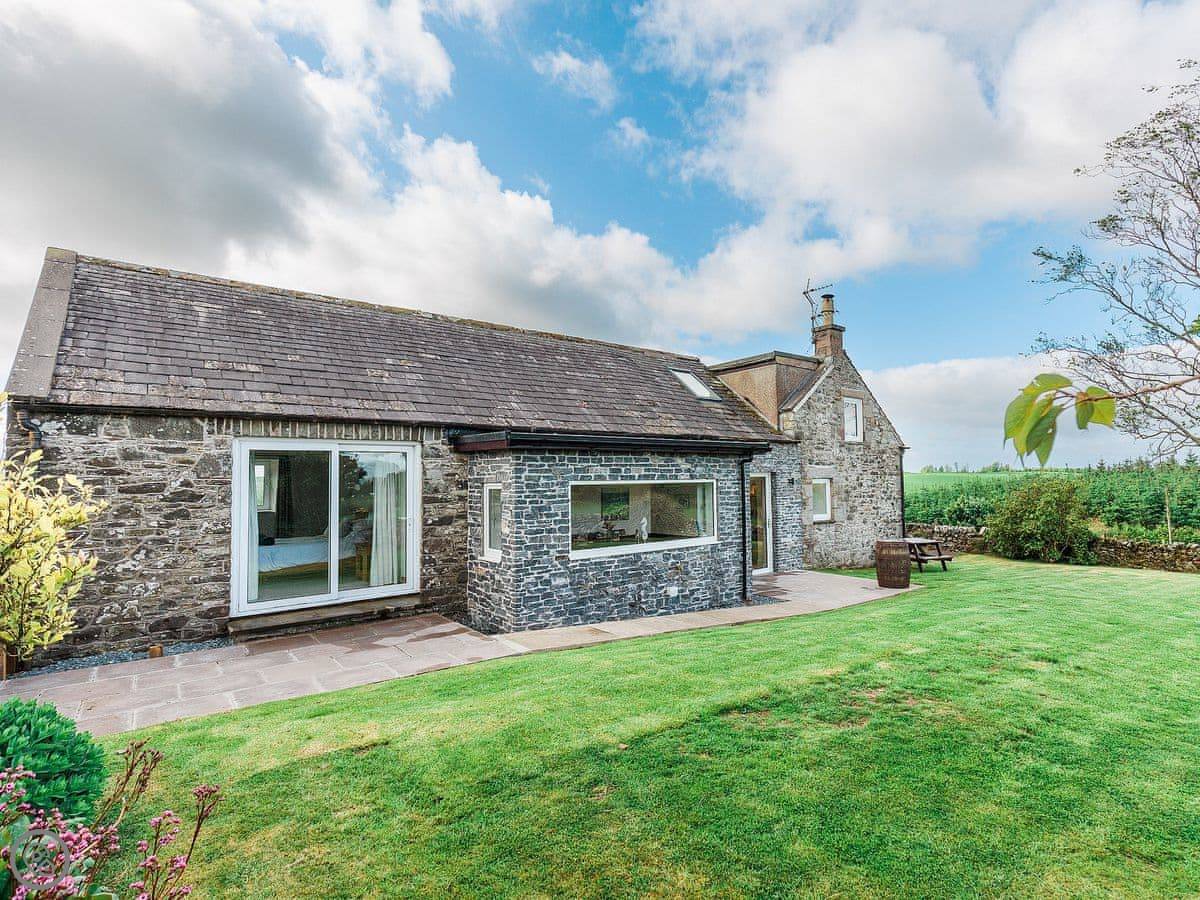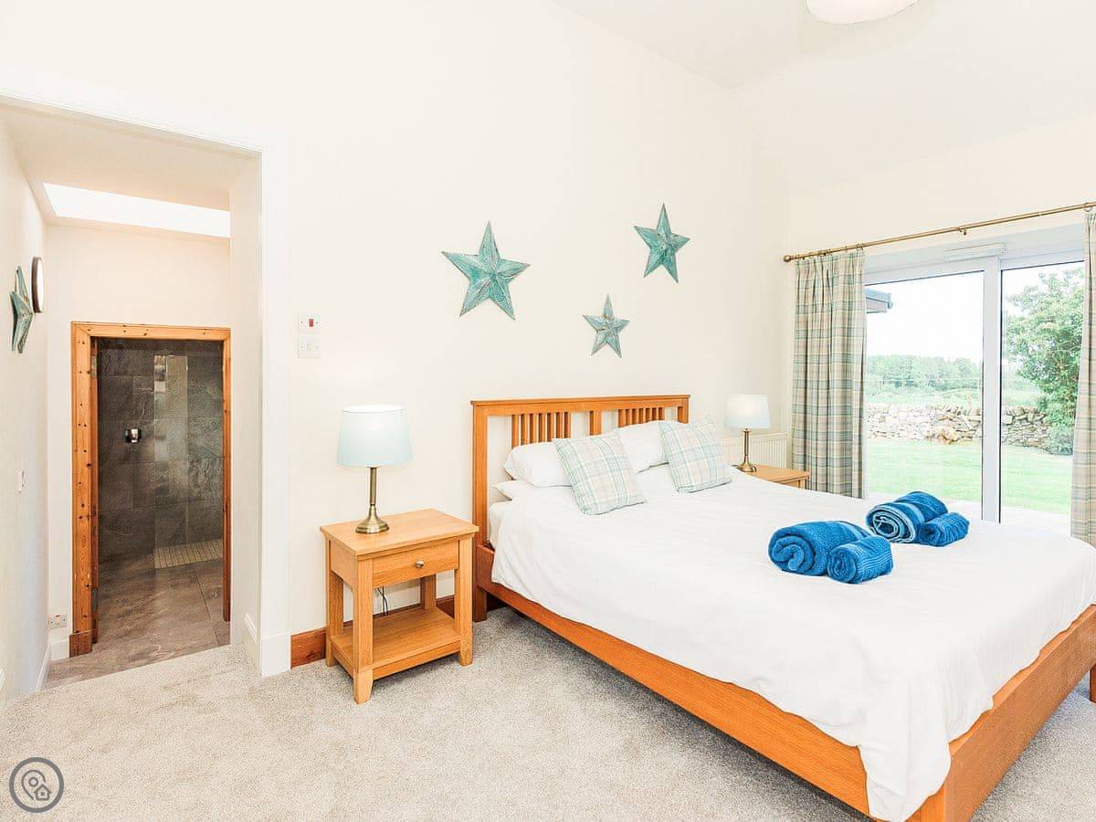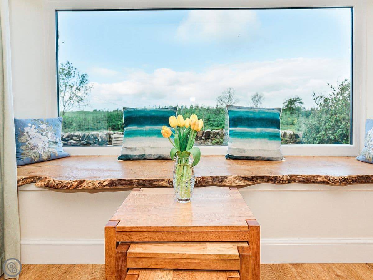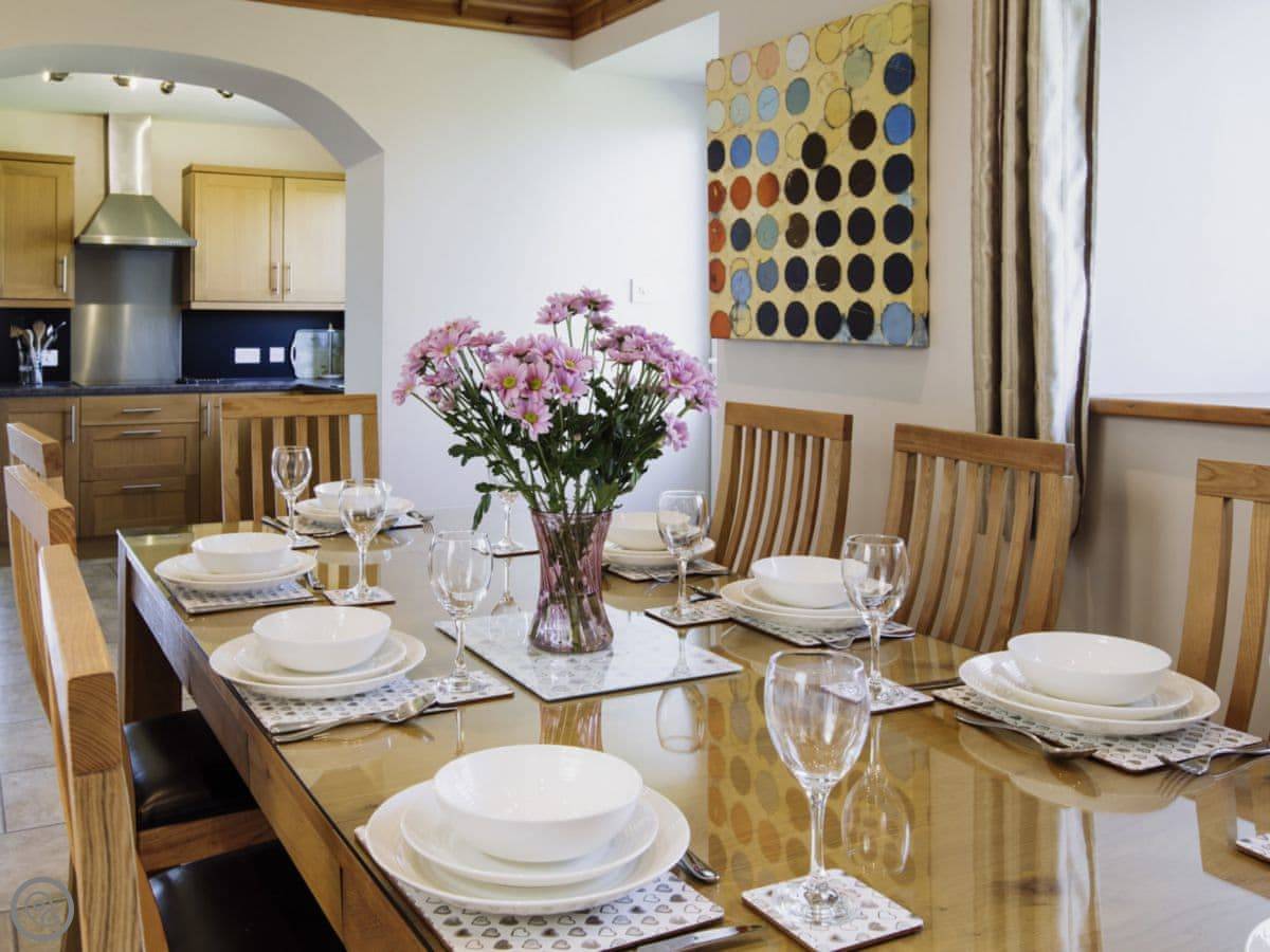It sleeps eight people. Four bedrooms and three bathrooms. One is a wet room on the ground floor, which has grab rails. It's got a 4 Star rating. It's a spacious place, good for a family group. The dining table is big. The sitting room has a large picture window that looks out over farmland towards the Galloway hills. It's quiet.