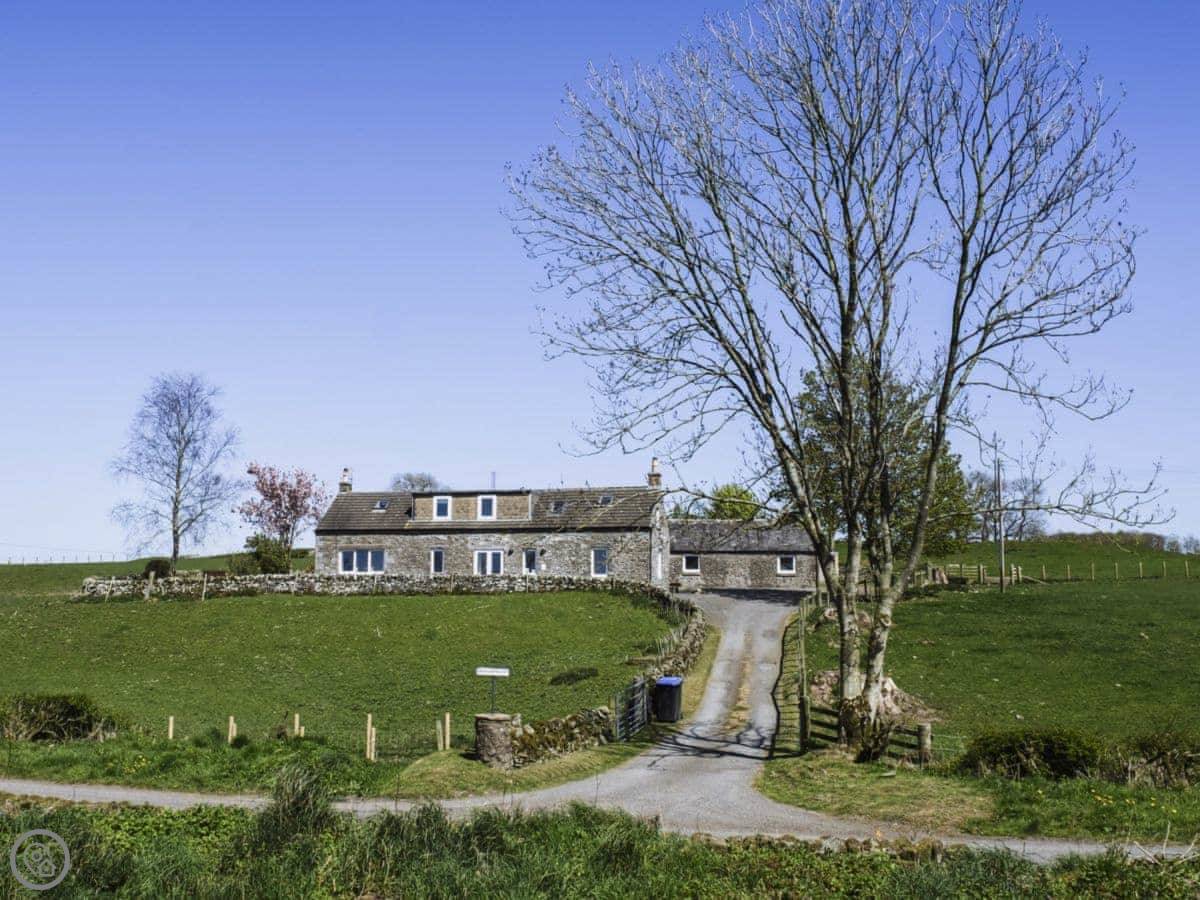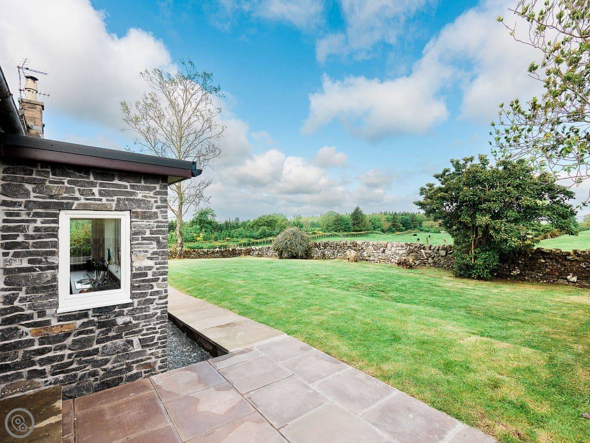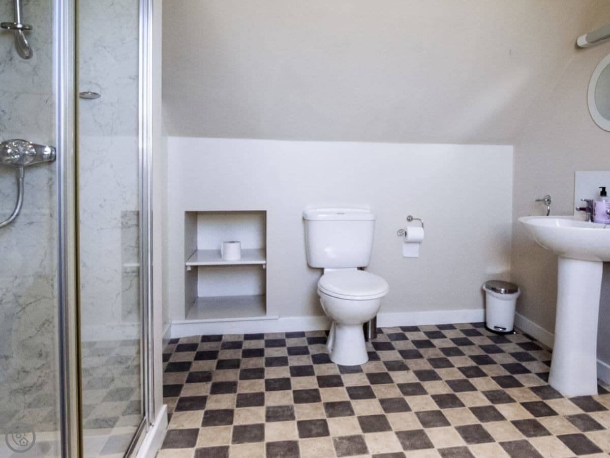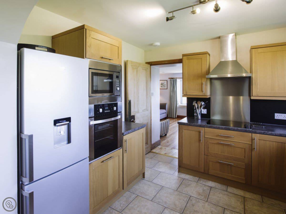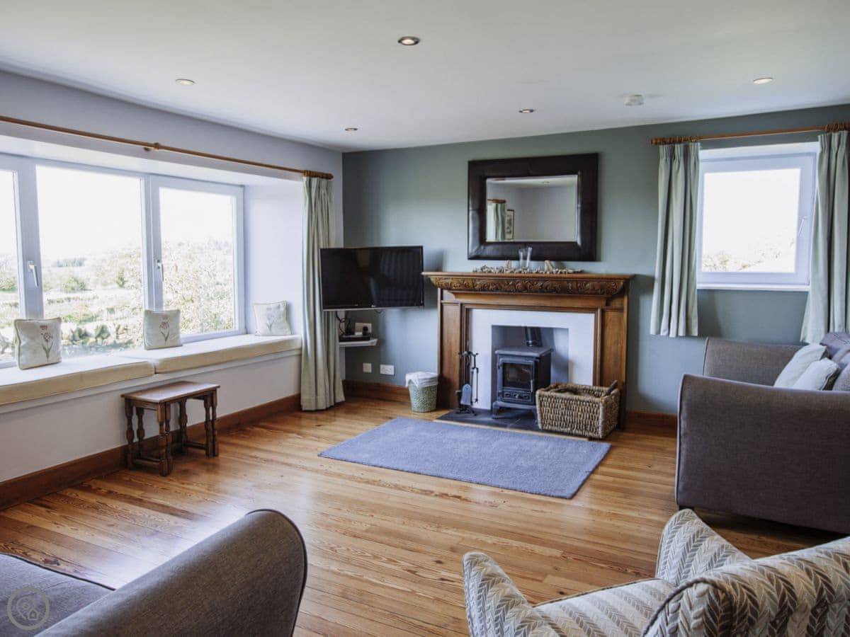 It sleeps eight people. Four bedrooms and three bathrooms. One is a wet room on the ground floor, which has grab rails. It's got a 4 Star rating. It's a spacious place, good for a family group. The dining table is big. The sitting room has a large picture window that looks out over farmland towards the Galloway hills. It's quiet.