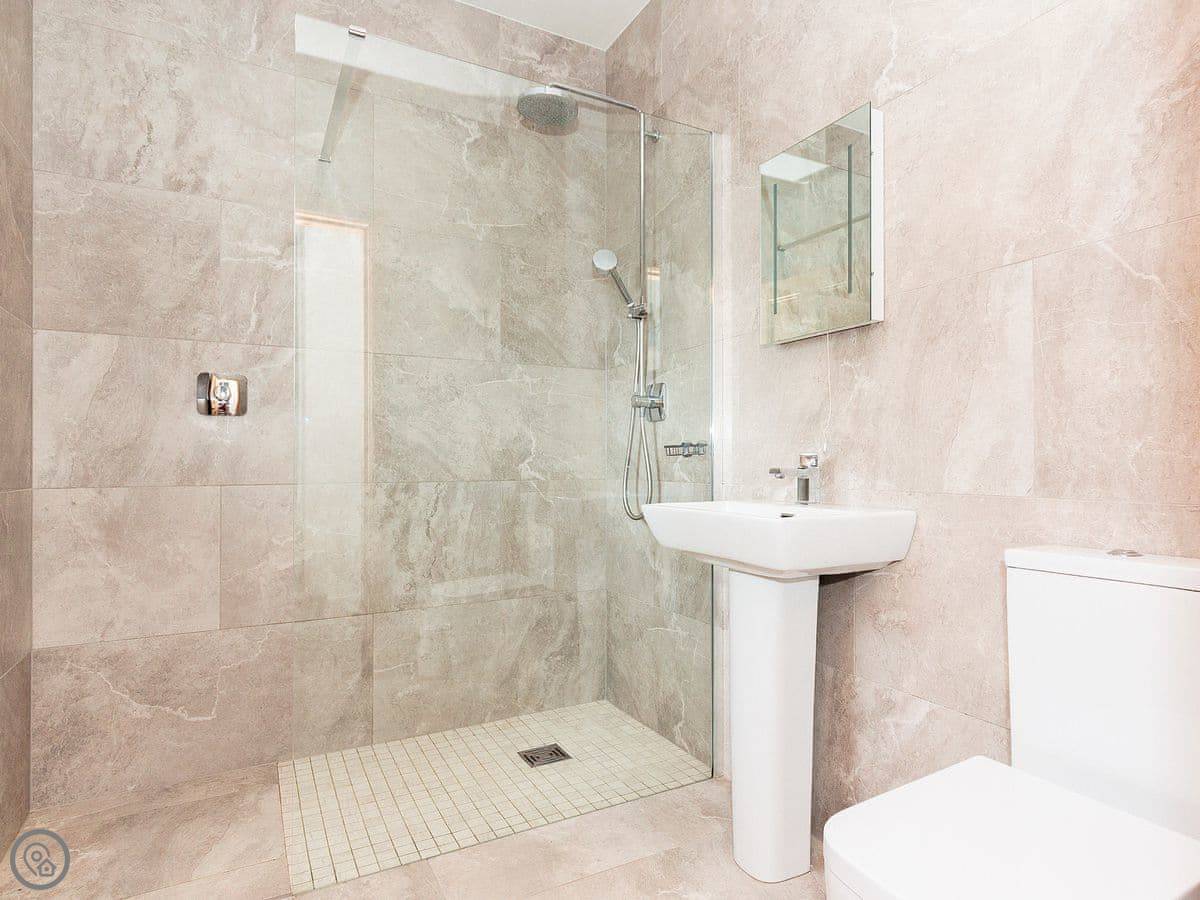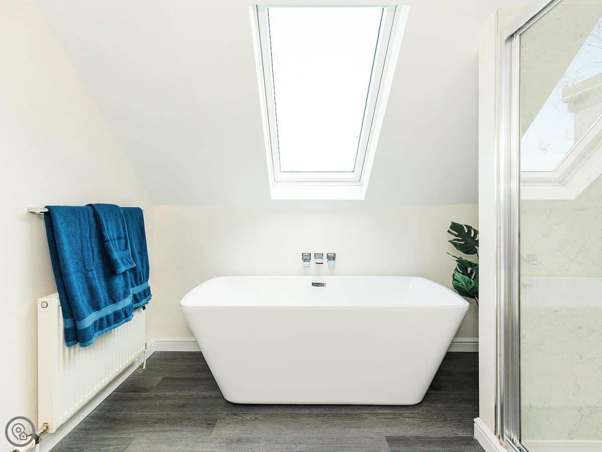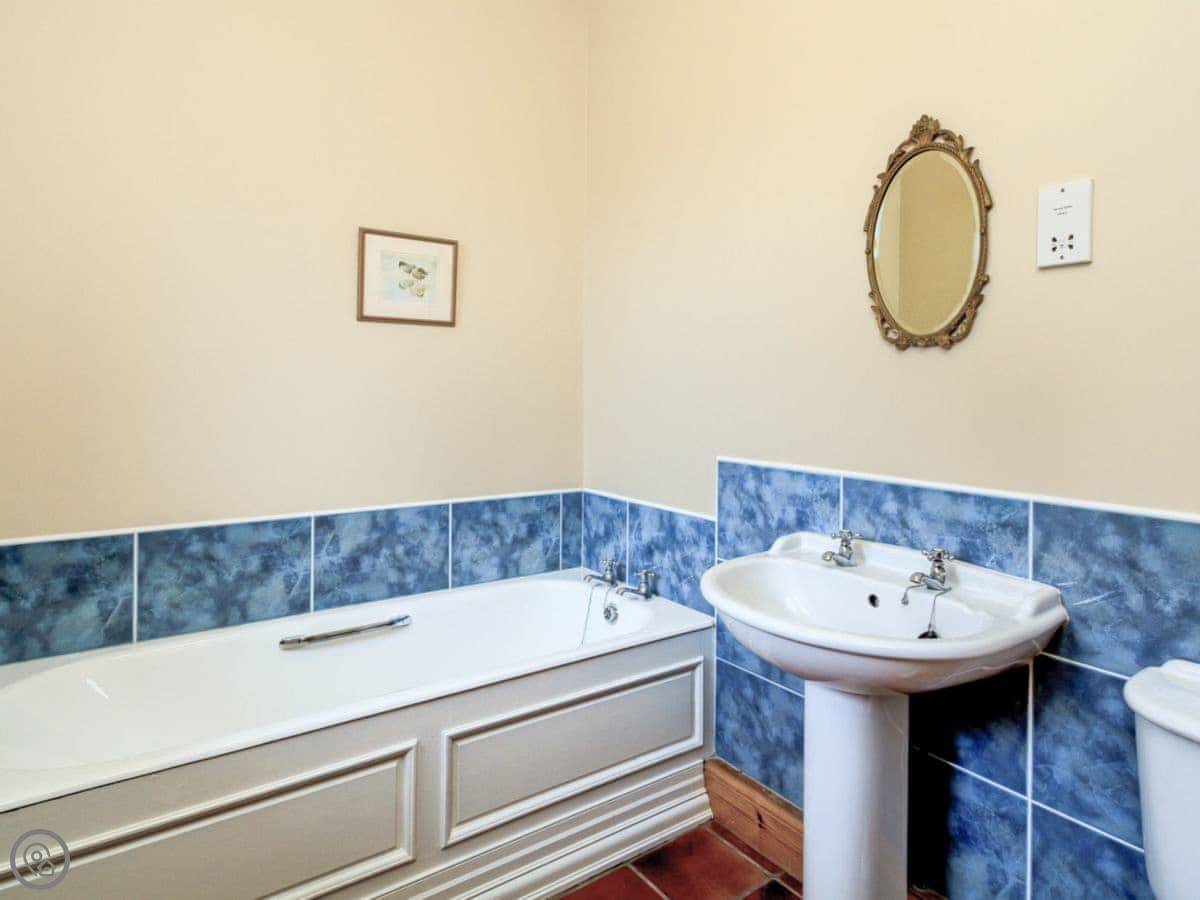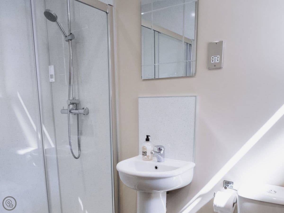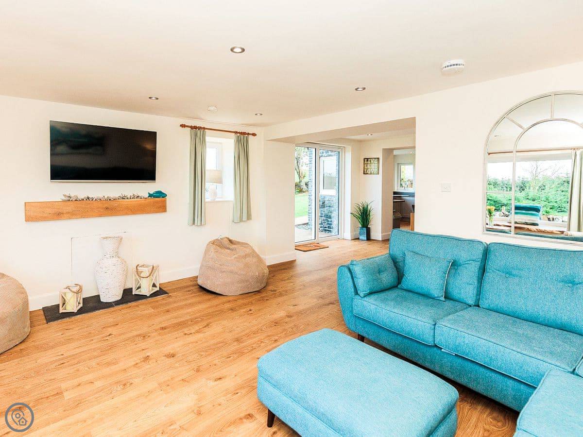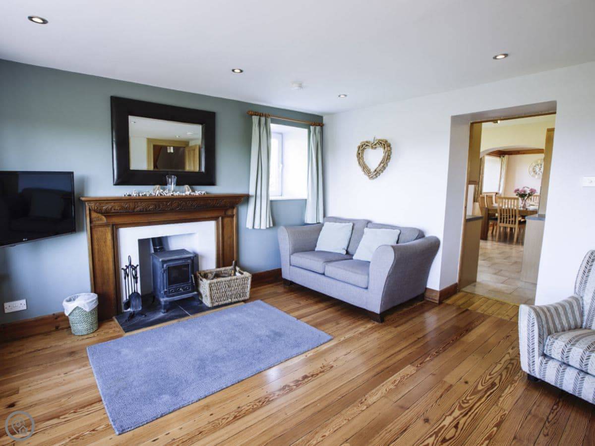 It sleeps eight people. Four bedrooms and three bathrooms. One is a wet room on the ground floor, which has grab rails. It's got a 4 Star rating. It's a spacious place, good for a family group. The dining table is big. The sitting room has a large picture window that looks out over farmland towards the Galloway hills. It's quiet.
