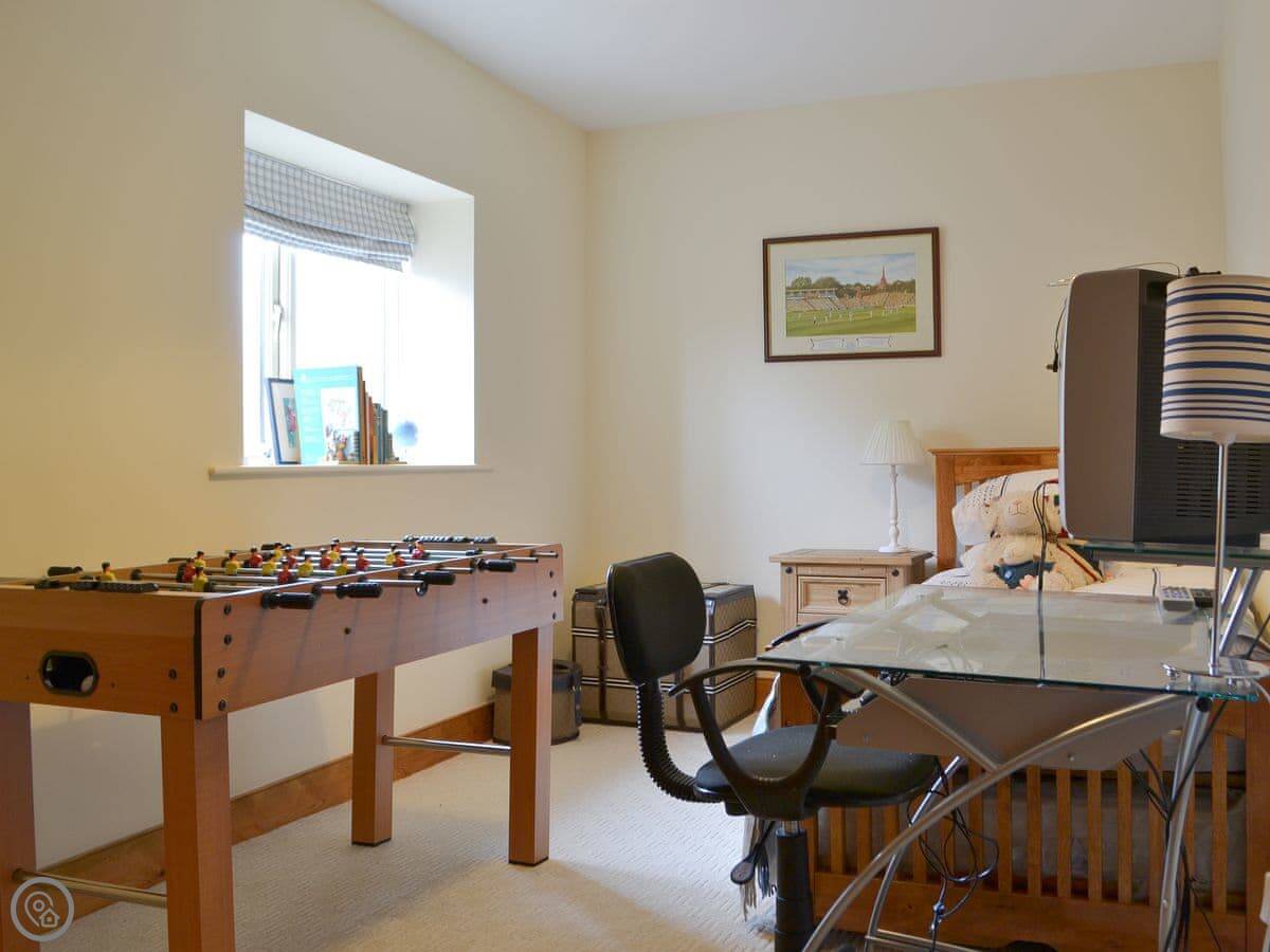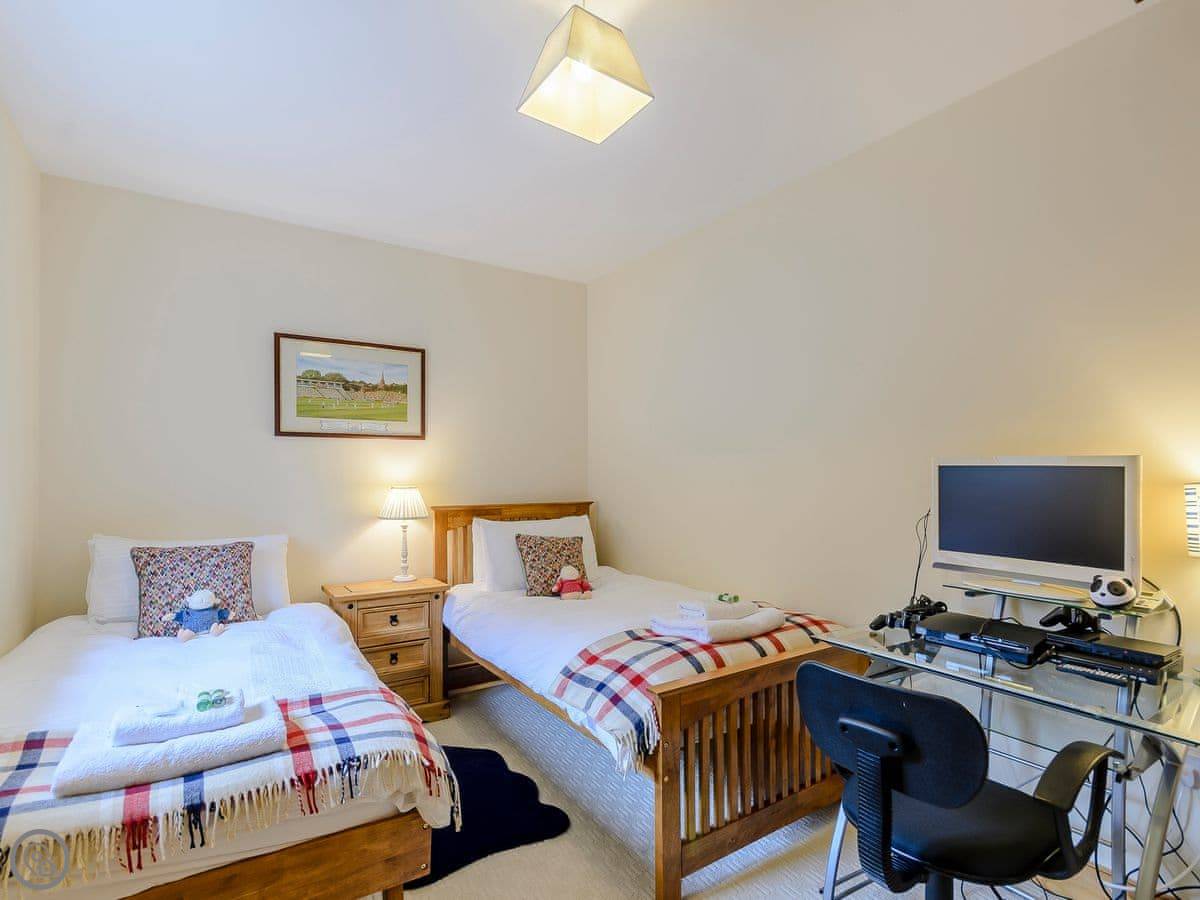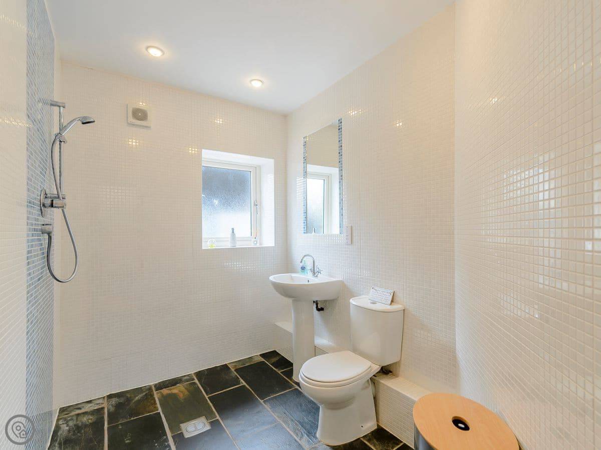 You come in on the ground floor. All four bedrooms are down there. The main one has a big sleigh bed and shares a bathroom with the next room through a jack and jill door. There's another double room, and a fourth room with two singles and an old Xbox. There's also a separate wet room with a shower. The washing machine is in a cupboard under the stairs.