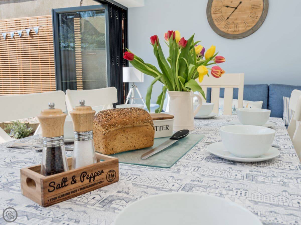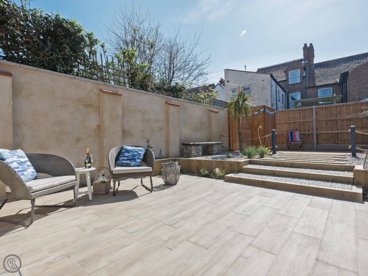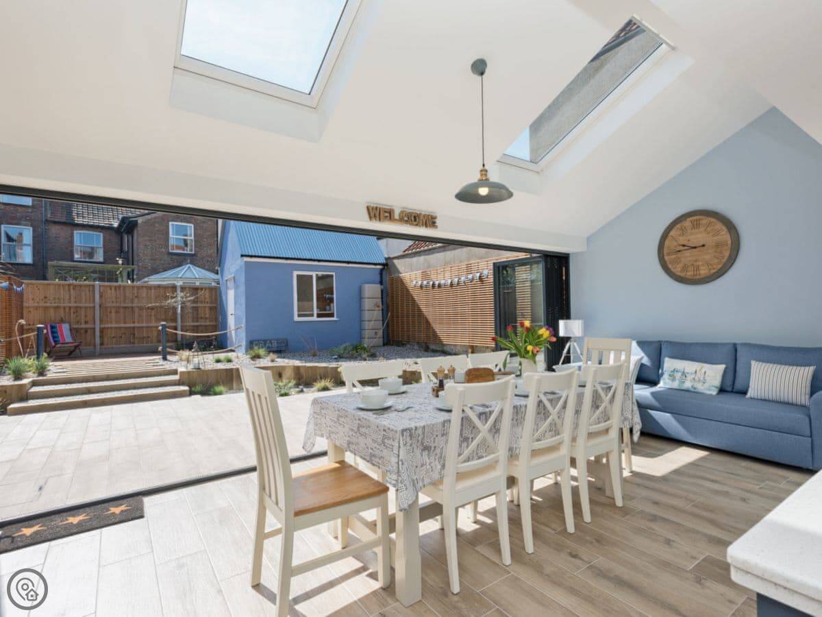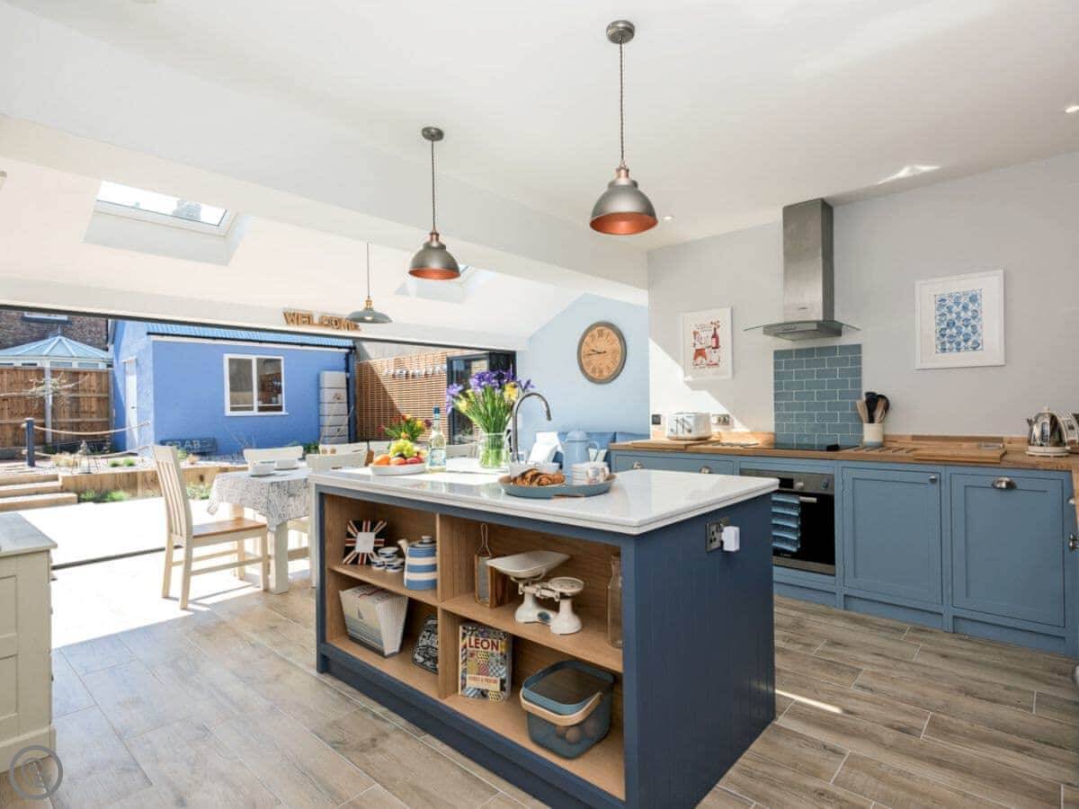 It sleeps eight, in four bedrooms. There are three bathrooms. It’s got a five star rating. It’s been renovated, so it should have everything you need. The kitchen is big, with bi-fold doors that open onto a private courtyard garden. There's a wood burner in the living room.