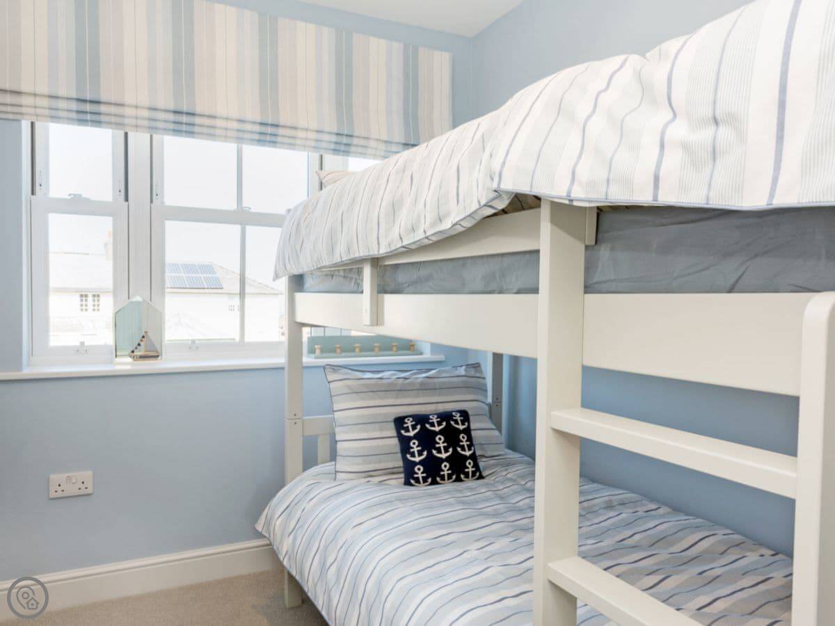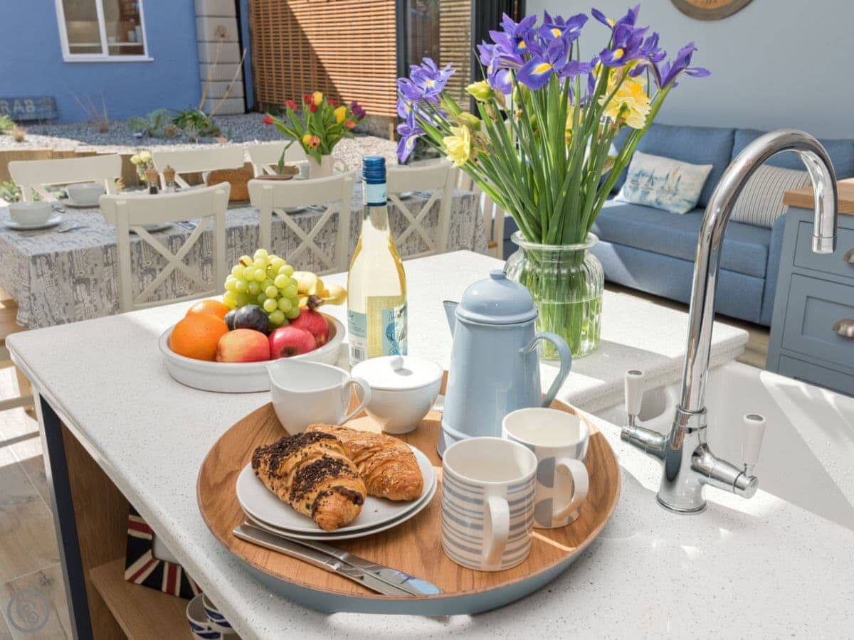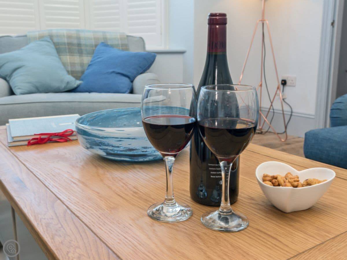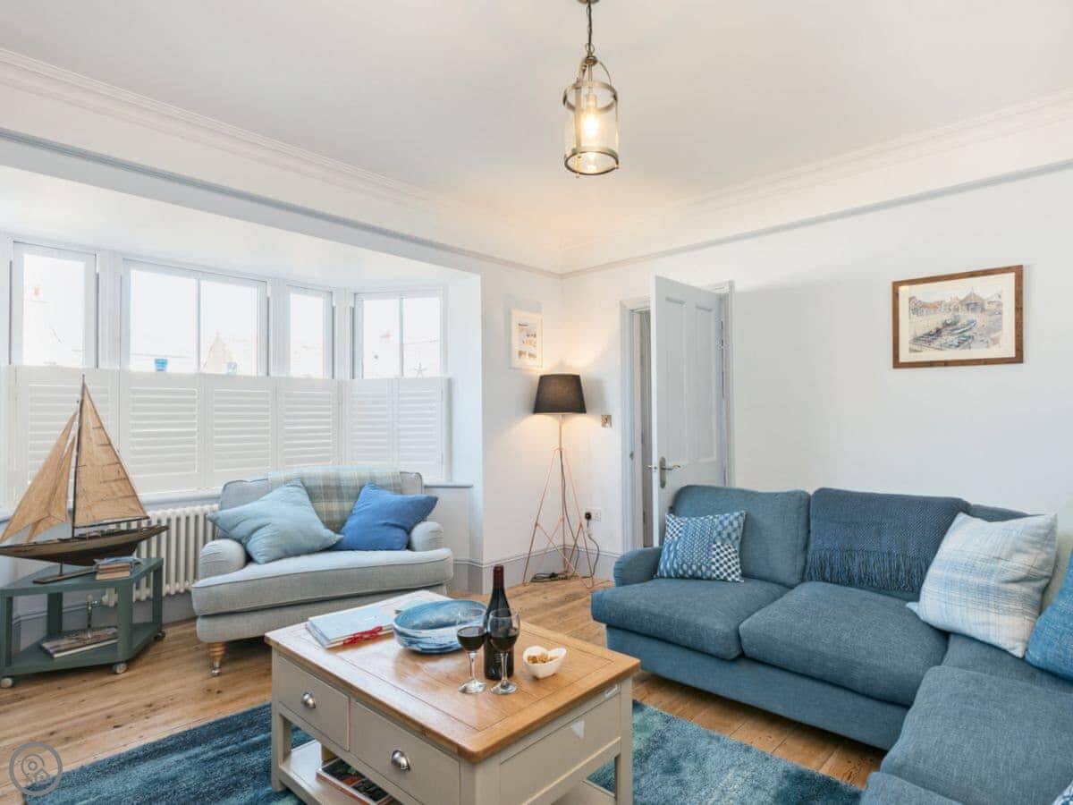 It sleeps eight, in four bedrooms. There are three bathrooms. It’s got a five star rating. It’s been renovated, so it should have everything you need. The kitchen is big, with bi-fold doors that open onto a private courtyard garden. There's a wood burner in the living room.