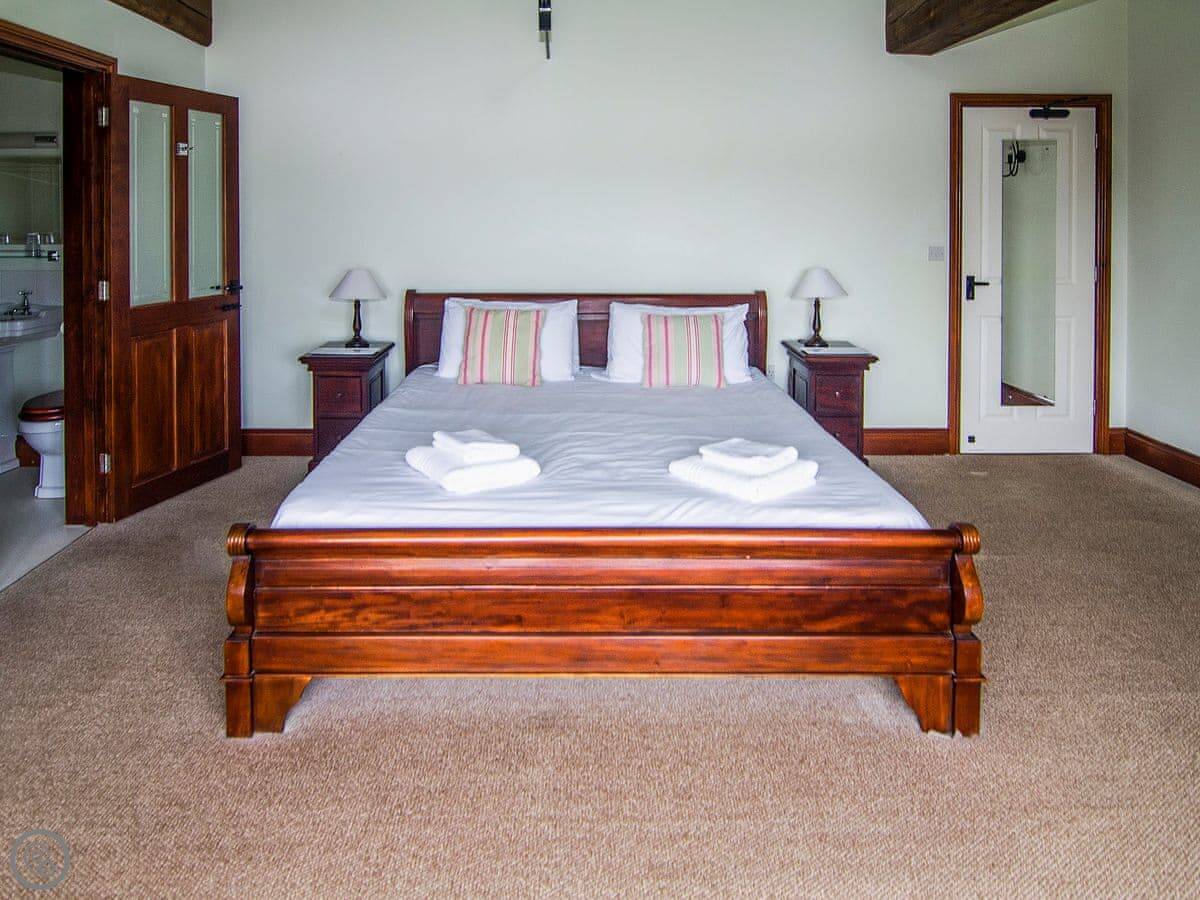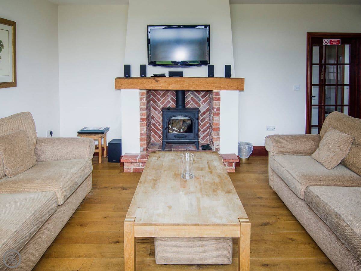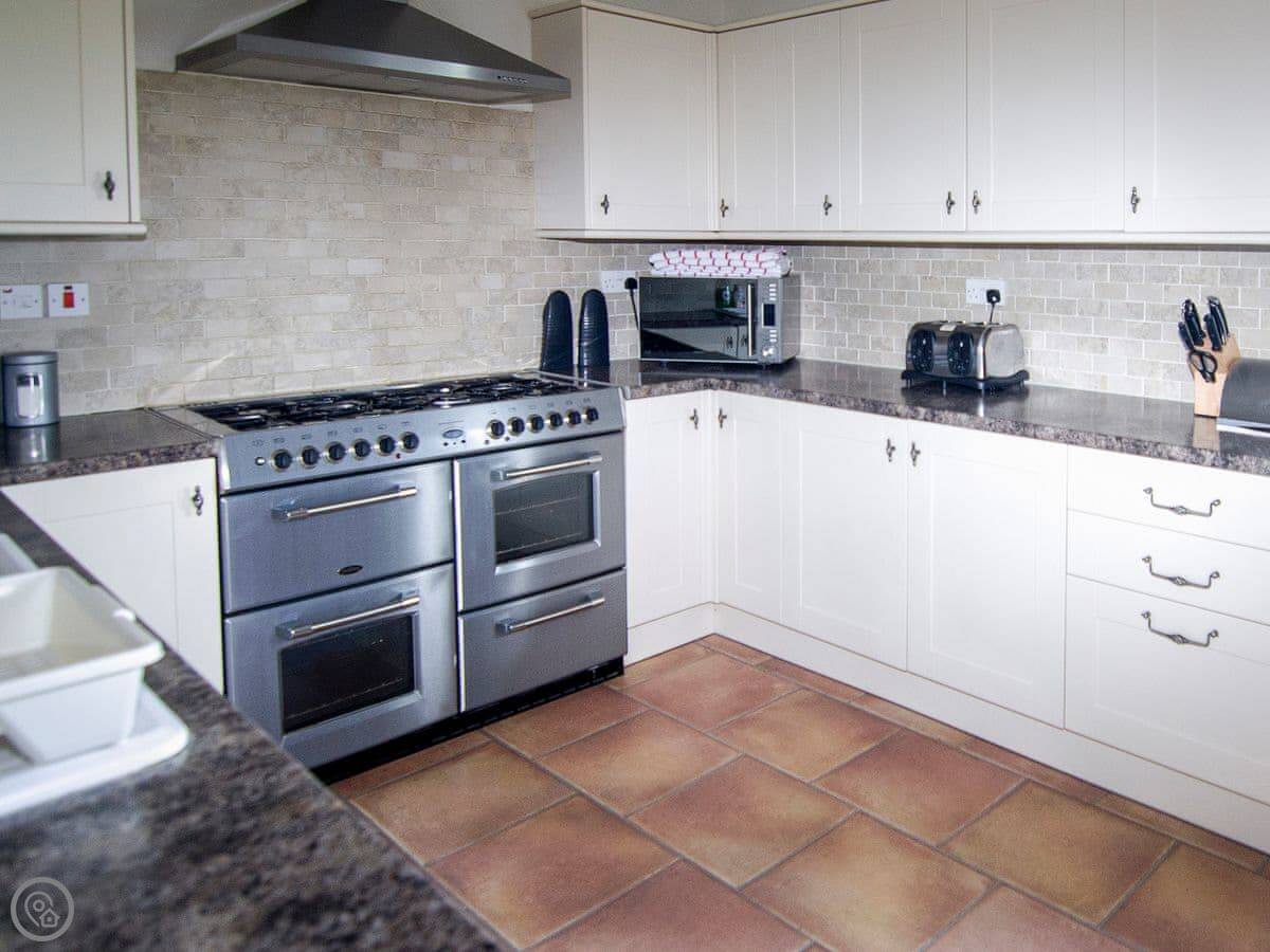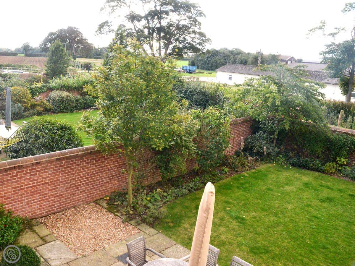 It sleeps ten people in five bedrooms. Each bedroom has its own bathroom, which is handy for a big group. There's an open plan living area with a wood burner and the kitchen has what you need. The garden is enclosed with a lawn and some seating.
