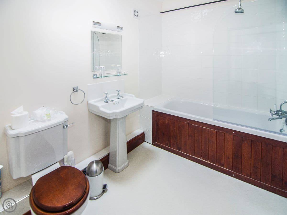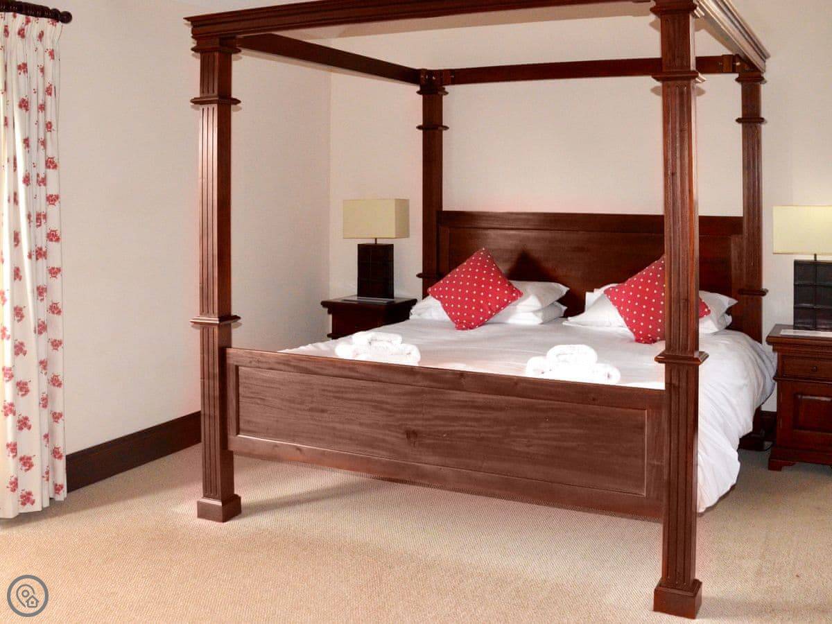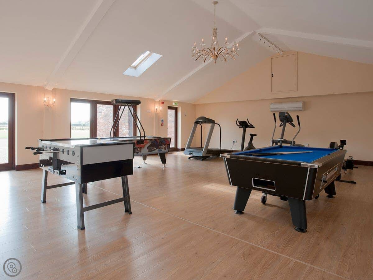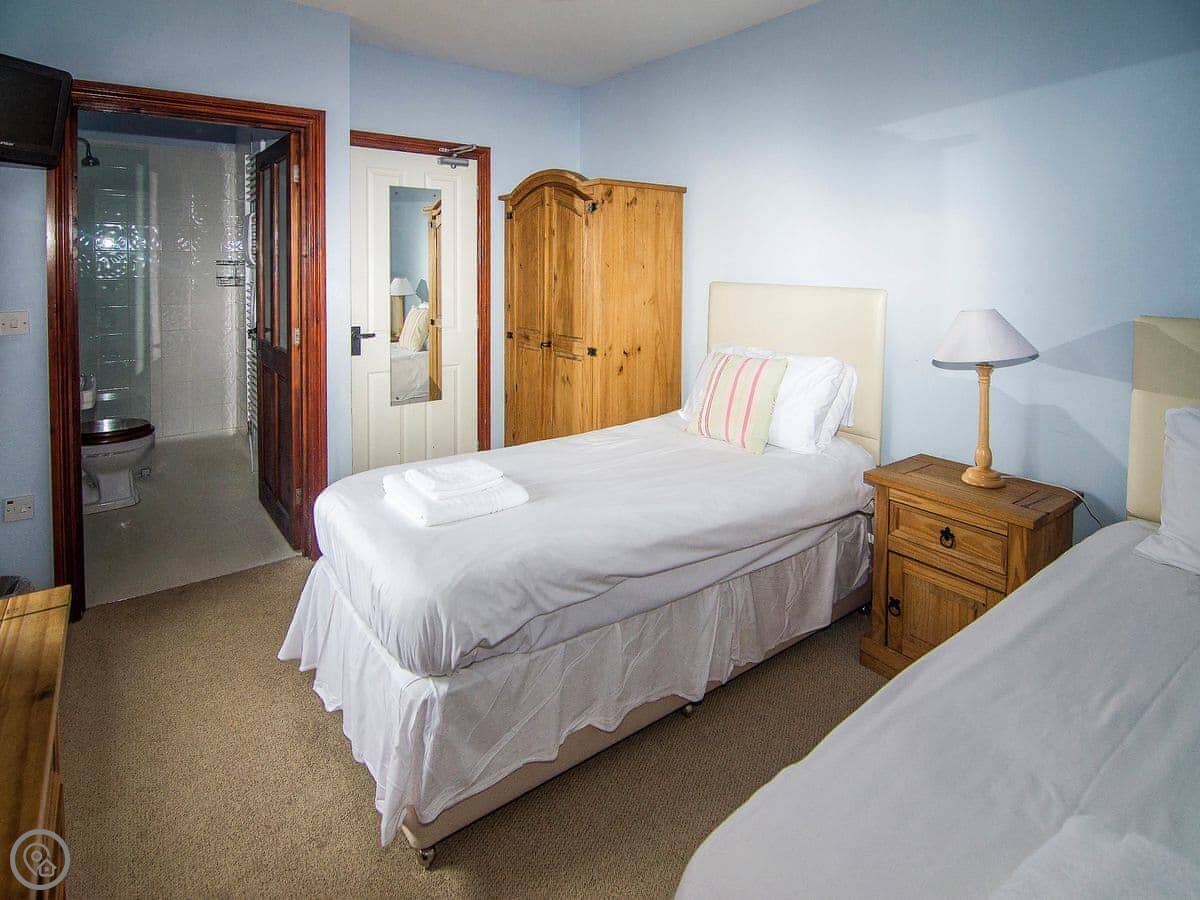 It sleeps ten people in five bedrooms. Each bedroom has its own bathroom, which is handy for a big group. There's an open plan living area with a wood burner and the kitchen has what you need. The garden is enclosed with a lawn and some seating.