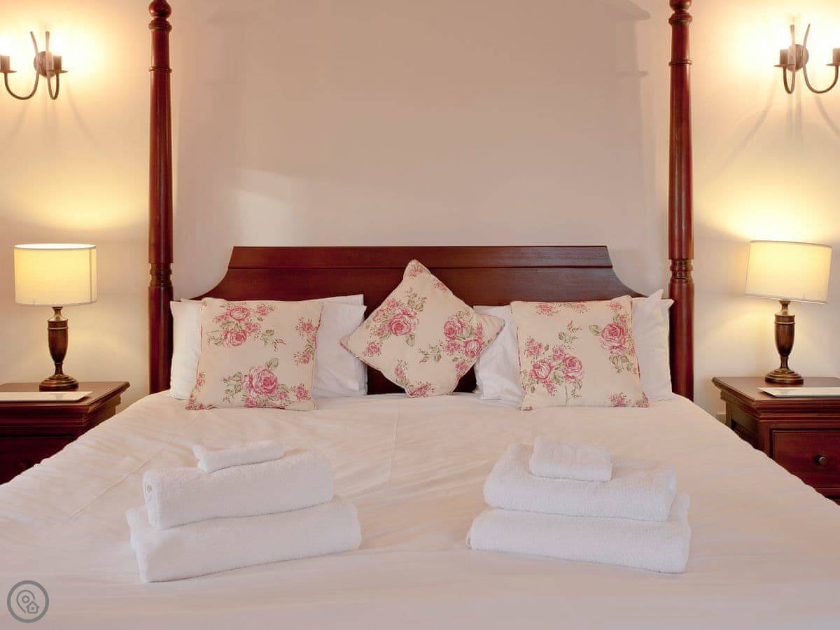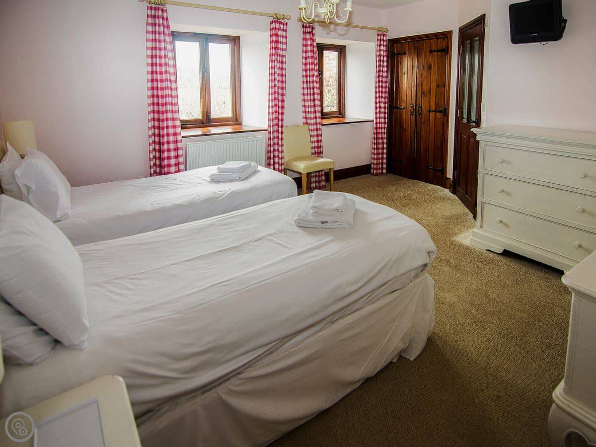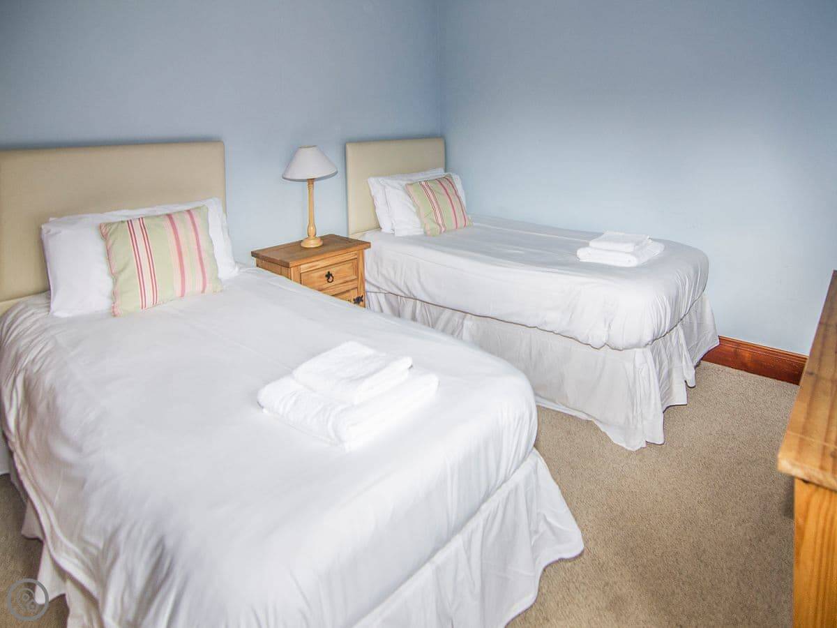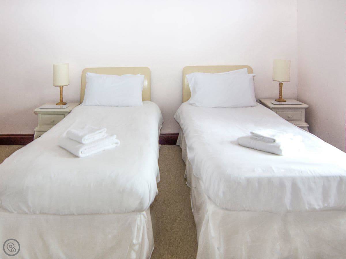 It sleeps ten people in five bedrooms. Each bedroom has its own bathroom, which is handy for a big group. There's an open plan living area with a wood burner and the kitchen has what you need. The garden is enclosed with a lawn and some seating.