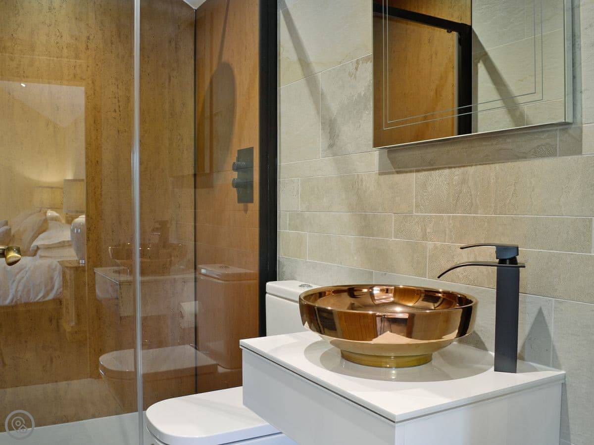 It's a one-bedroom place for two people. It's open plan, so the bed, living space, and kitchen are all in one room. There's a big bath at the foot of the bed. There's also a separate shower. It's a 5 Star place, which means it's well-equipped and comfortable.