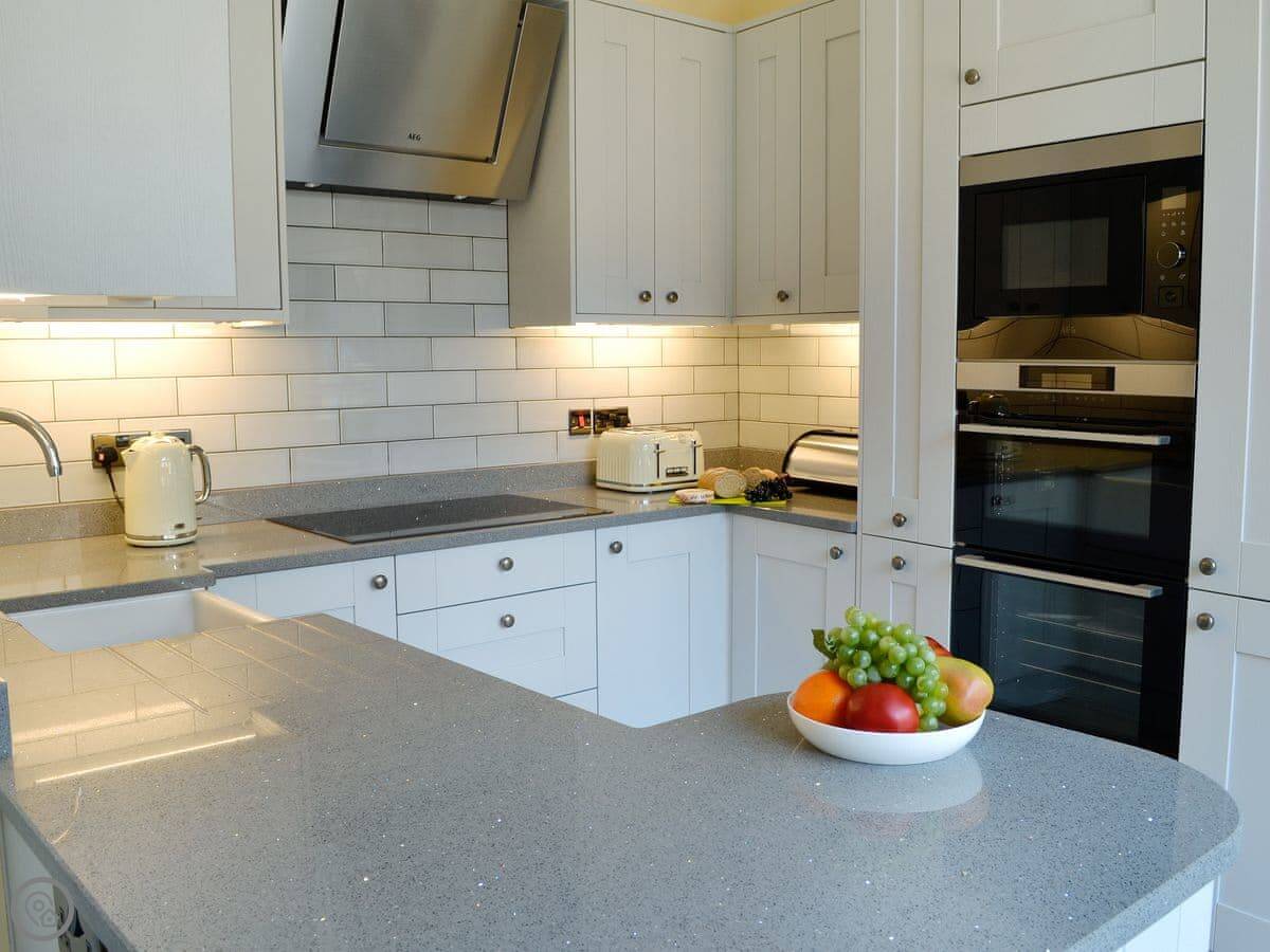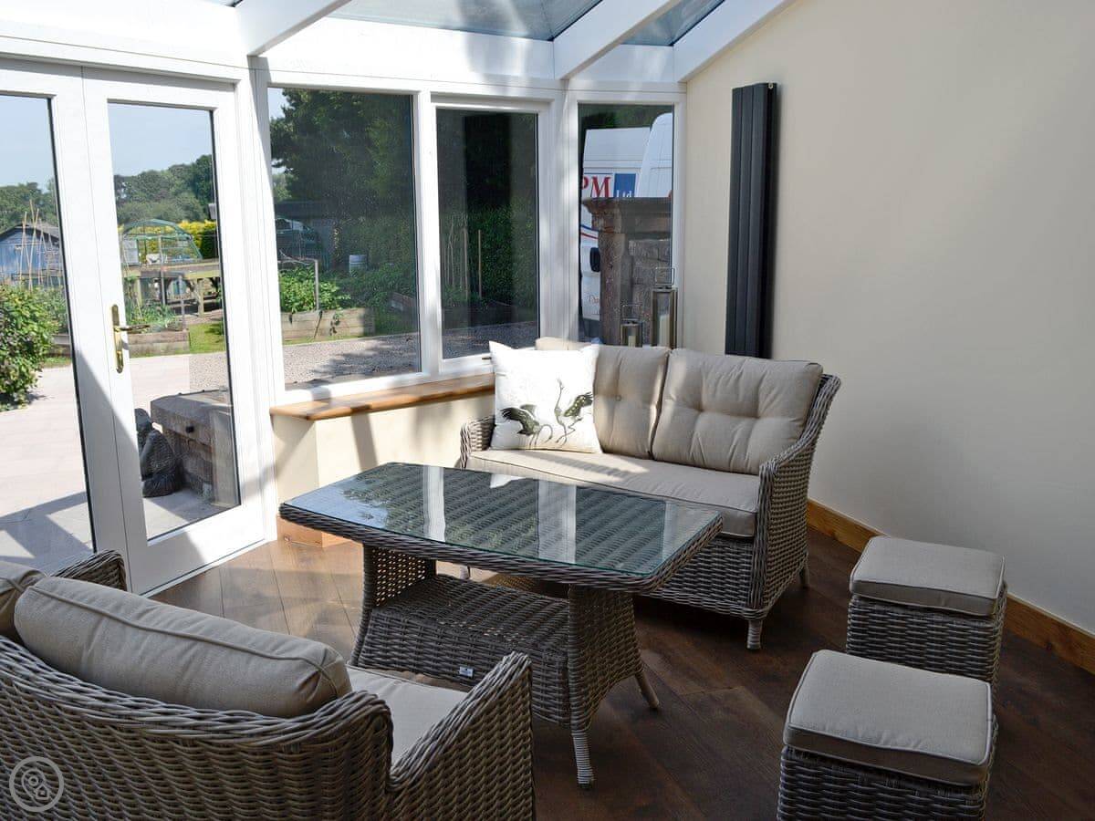 It sleeps six. There are three bedrooms, each with its own bathroom. It has a 5 Star rating, which means it's been newly done up. The kitchen leads into the dining room, then the living room, and then there's a conservatory at the end.