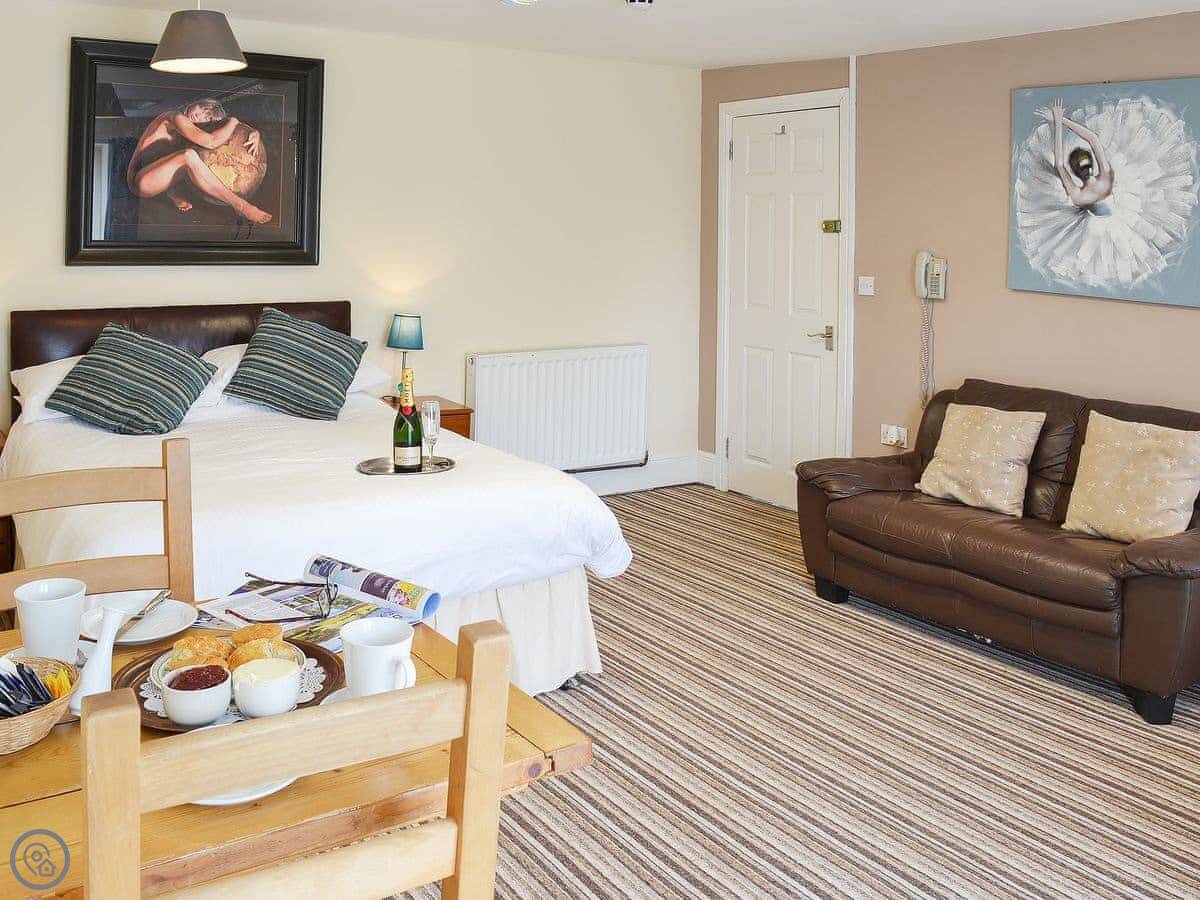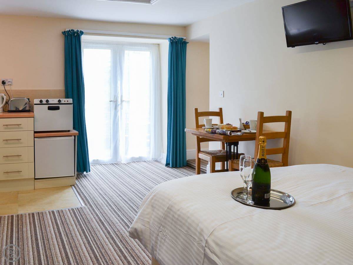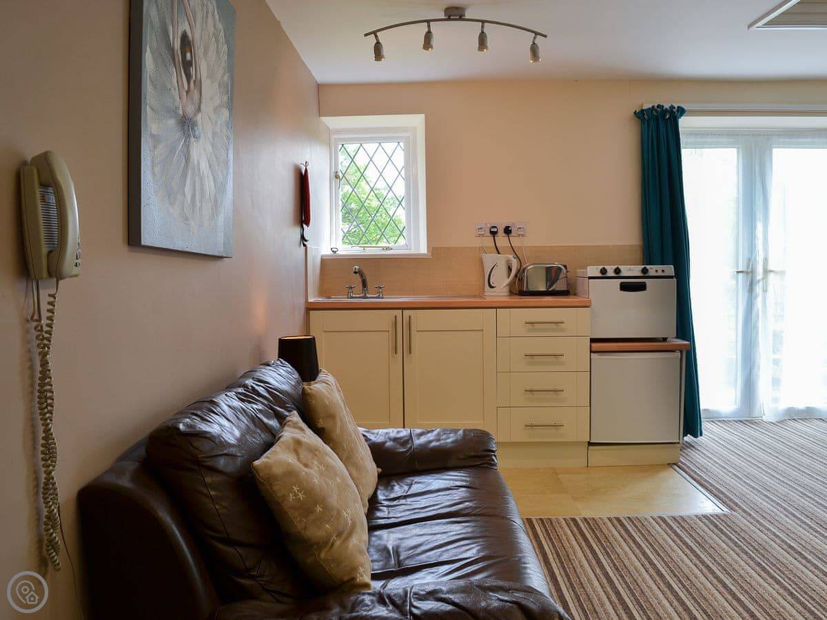 The studio itself is straightforward. One room with a kitchen, living and sleeping area, and a separate bathroom. It's got a 3 Star rating. There's a small patio that looks out onto the shared gardens.