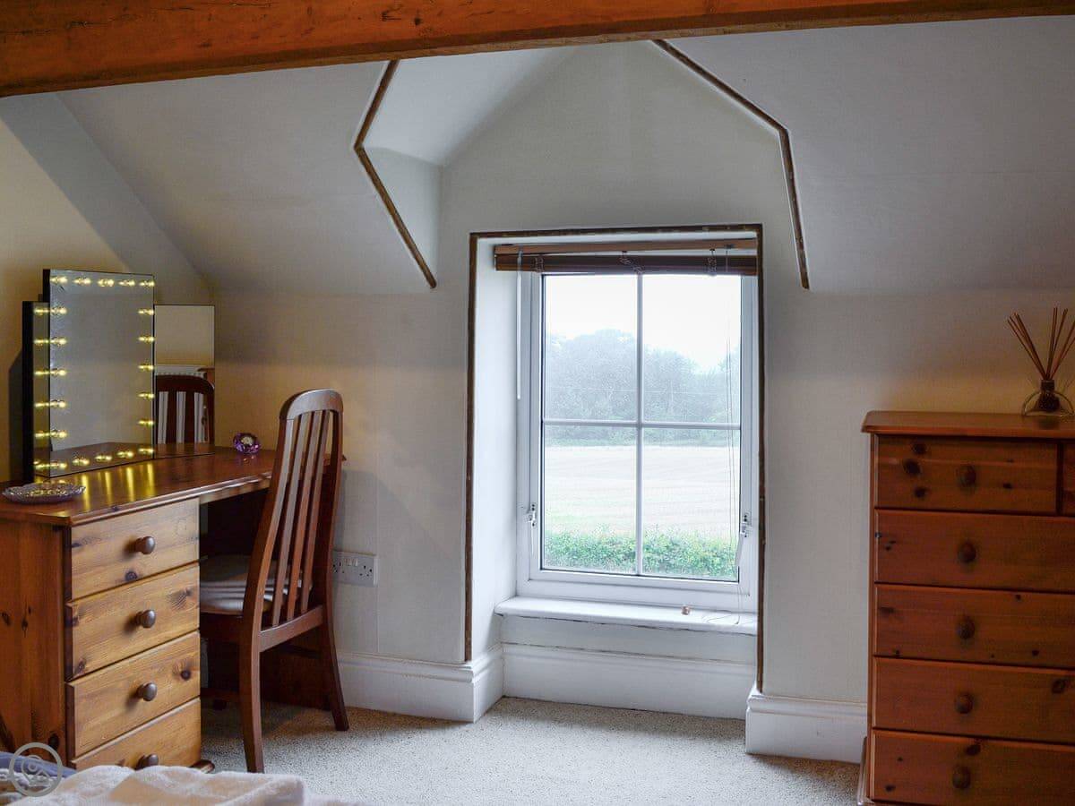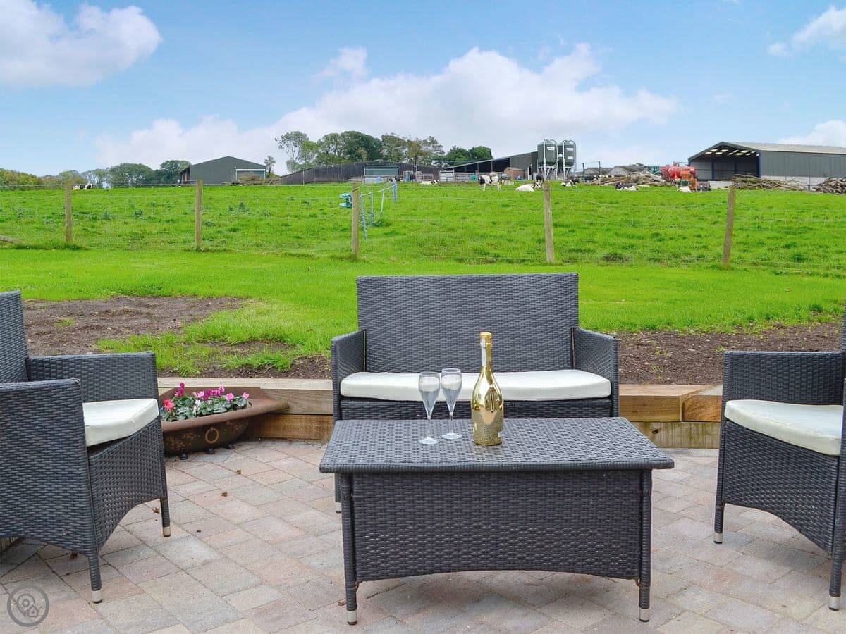 You get your own garden and a patio with furniture. It catches the morning sun. The view from there is over our fields. You'll see the cows. It's quiet. The main noise is birds, or sometimes the cows.