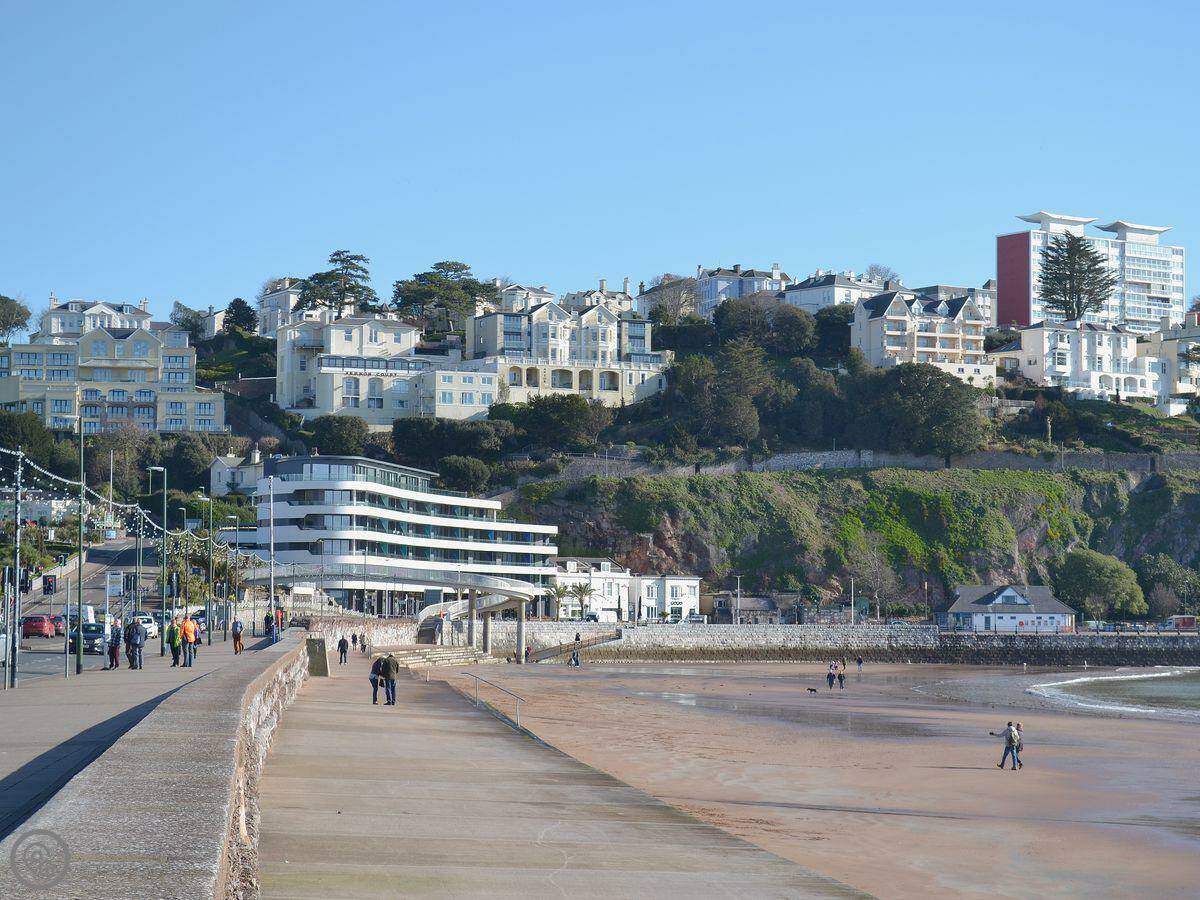 You're right in Torquay. The town centre, the marina, and the beach are all about five minutes walk downhill. There's a shop 150 yards away and a pub about 350 yards.