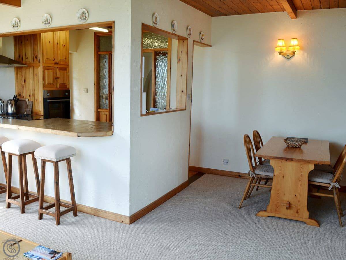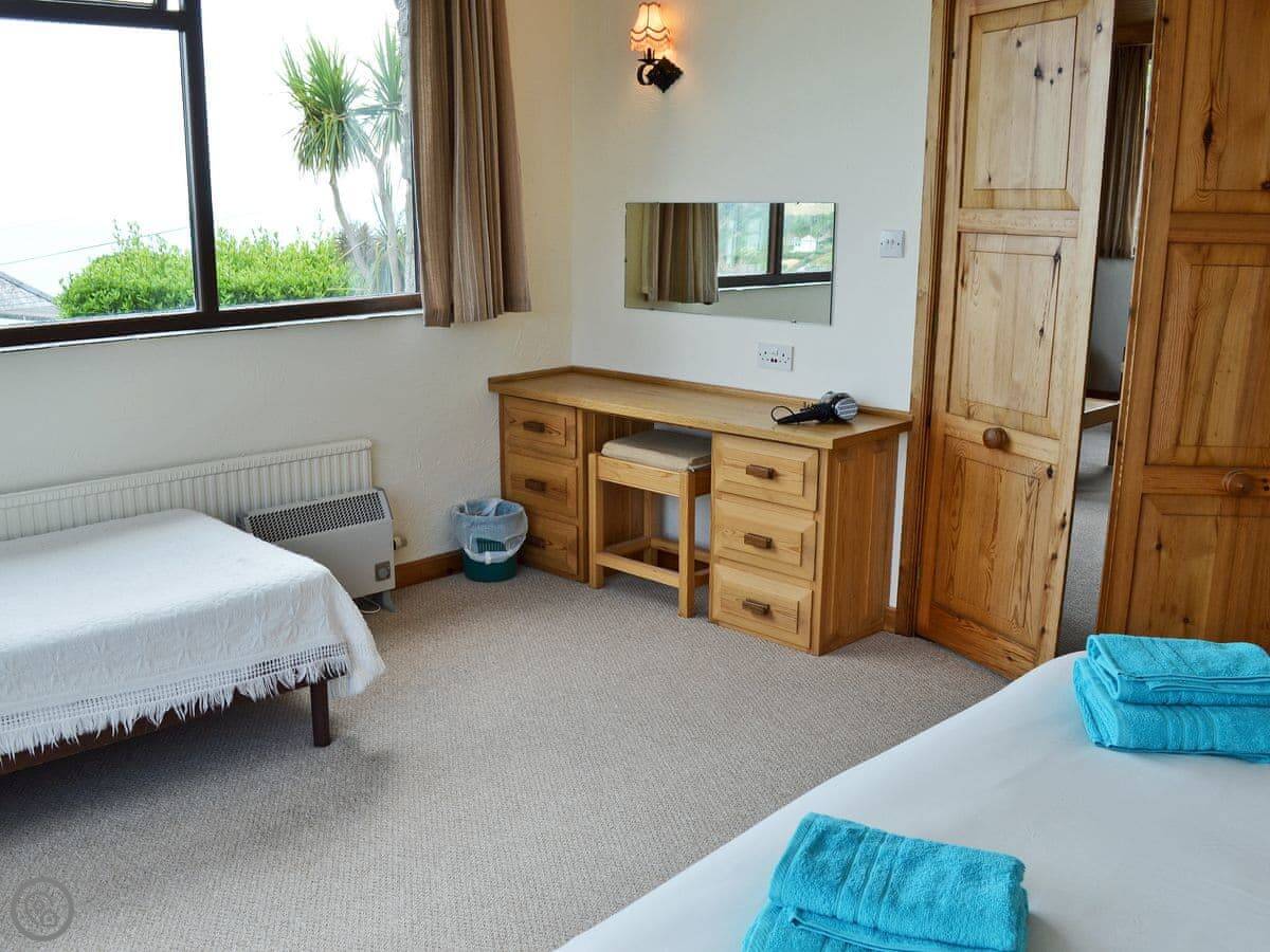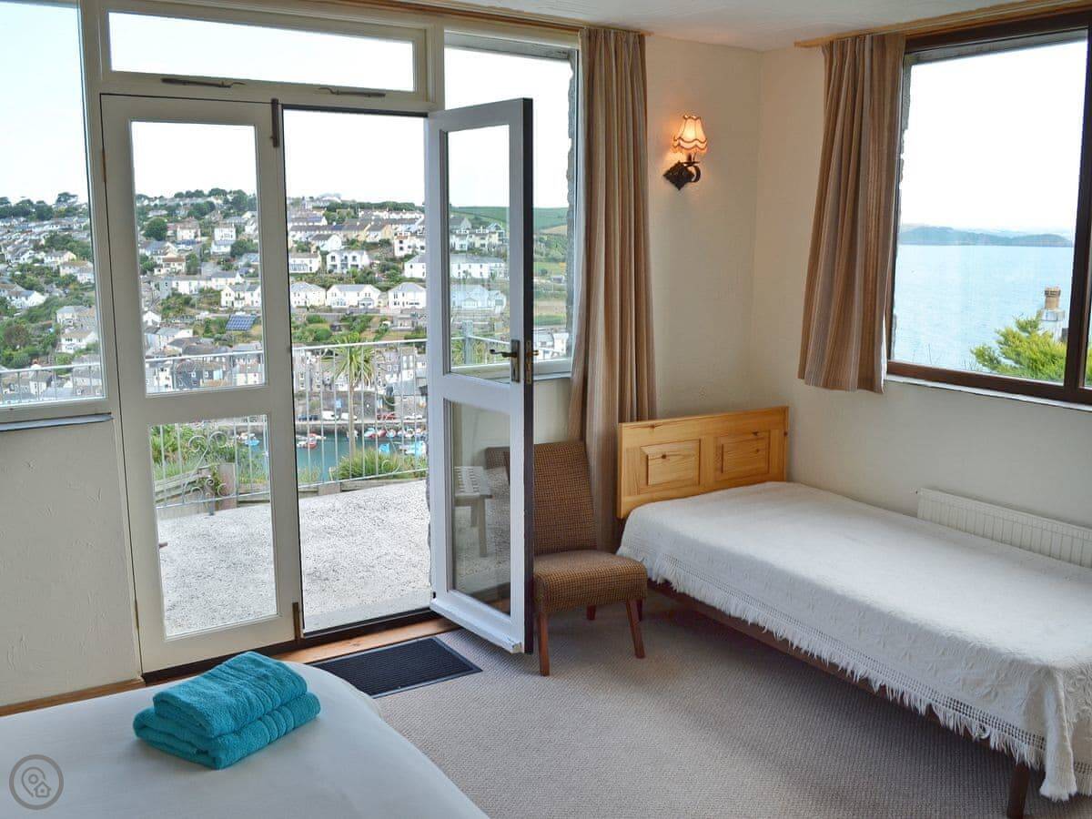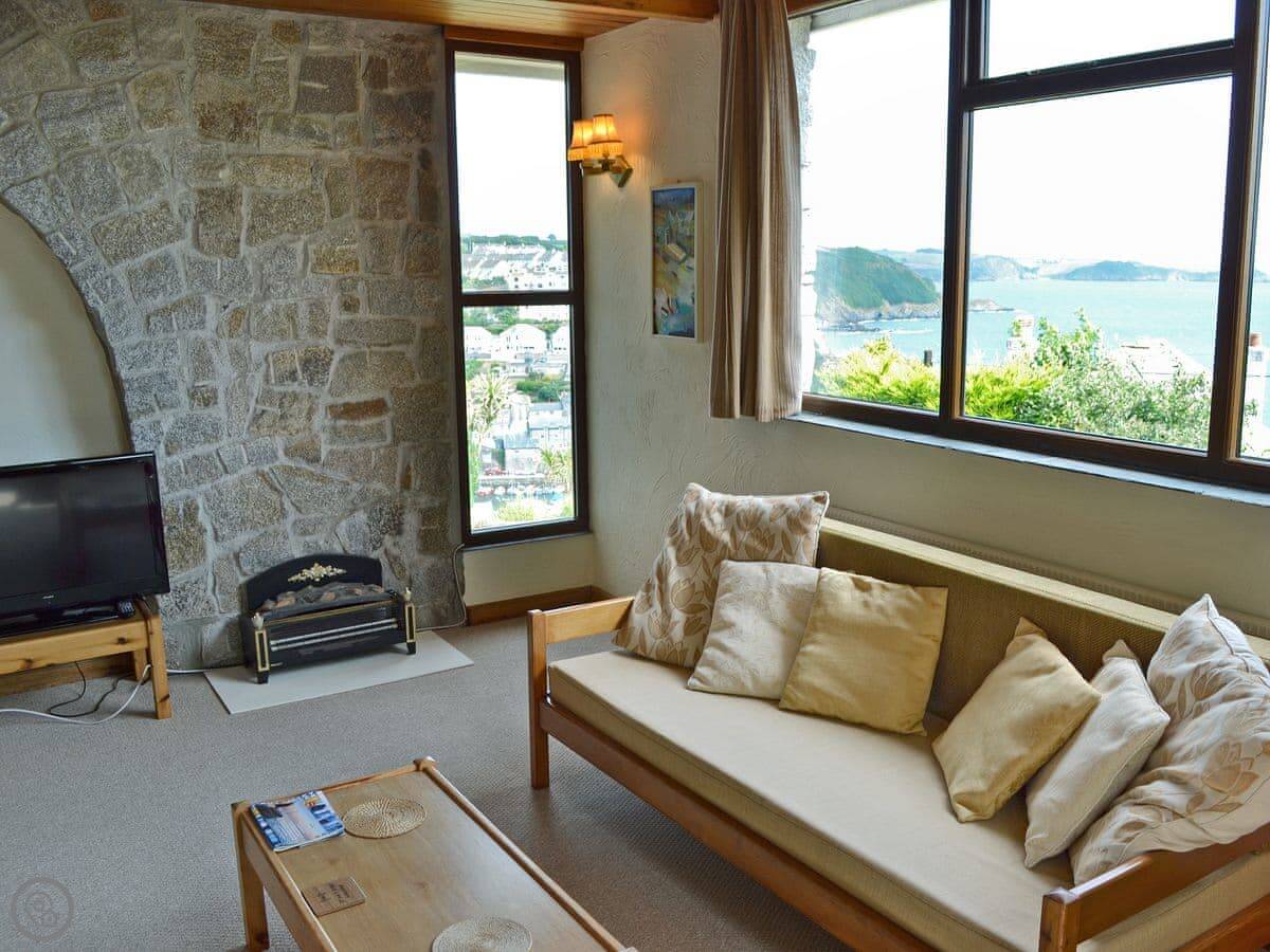 This is Berlewen. It's one of the apartments at Polhaun, up above Mevagissey. The view is the main thing. You get the whole harbour from your window, and you can see right around the bay. It's up the hill, so you're looking down on it.