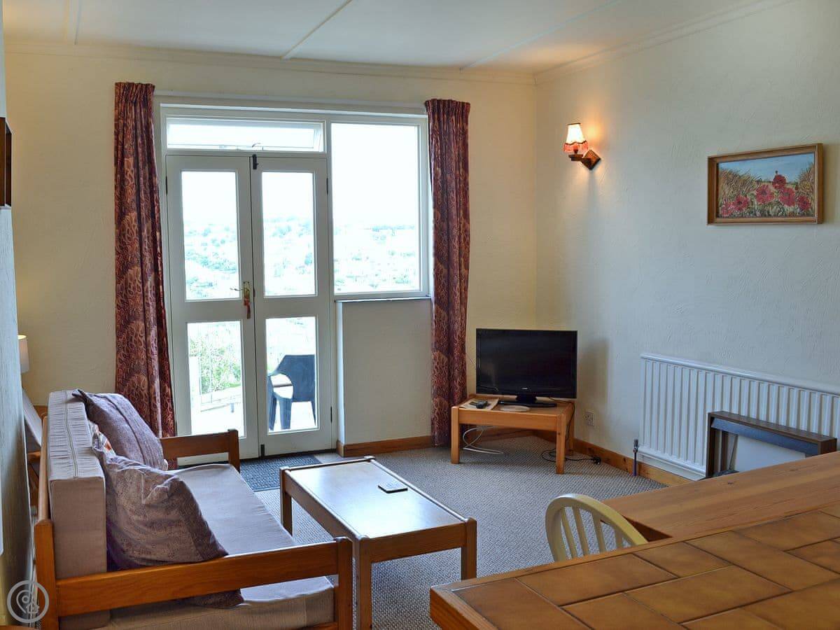 Sowenna is one of the apartments at Polhaun, just outside Mevagissey. It's my place, I live next door. The view is the main thing. You look straight out over the harbour and the bay from your own patio. You get a private parking space, which is handy because parking in Mevagissey itself can be tricky.