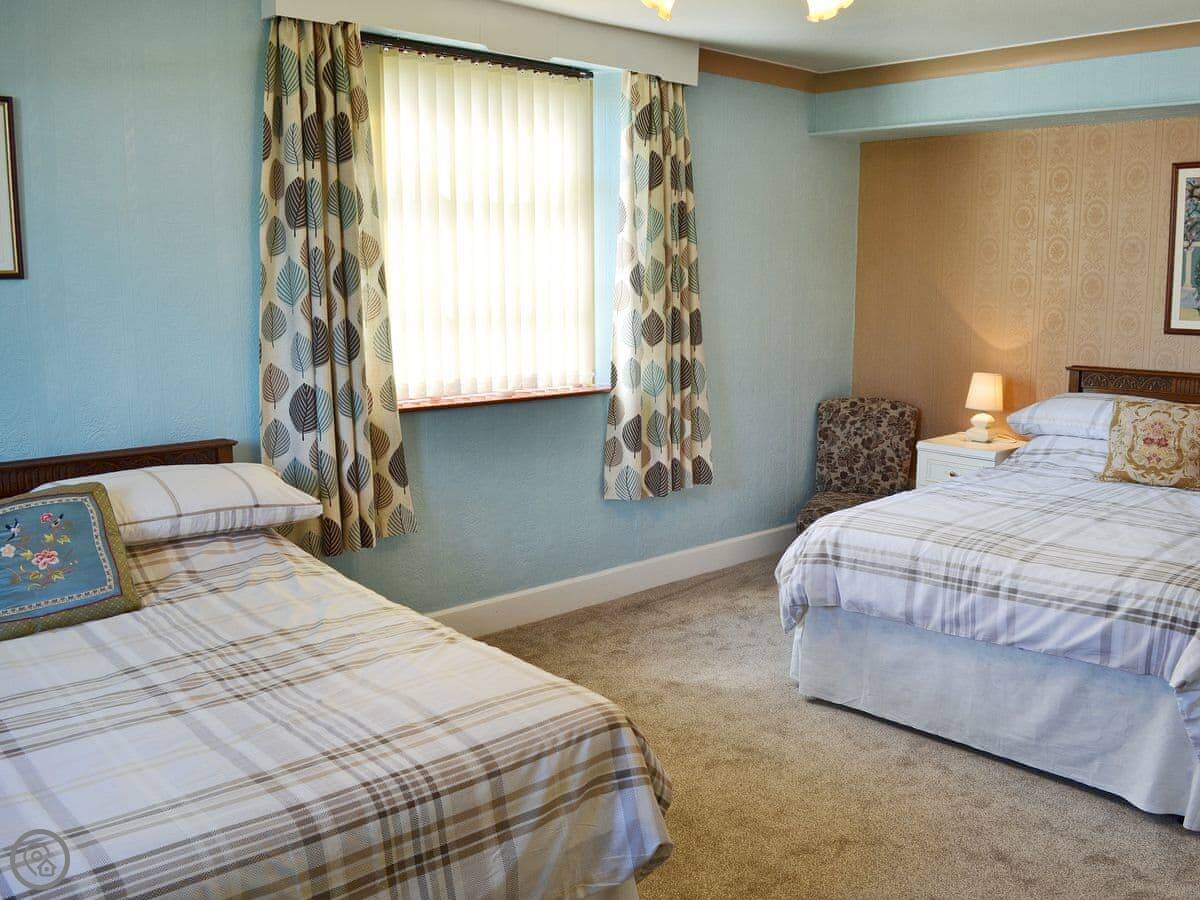 The bedroom is upstairs. It's got a double bed and then another double in a sort of curtained-off area in the same room. So it's fine for a family or two couples who know each other well, but it's not two separate bedrooms. The bathroom is downstairs.