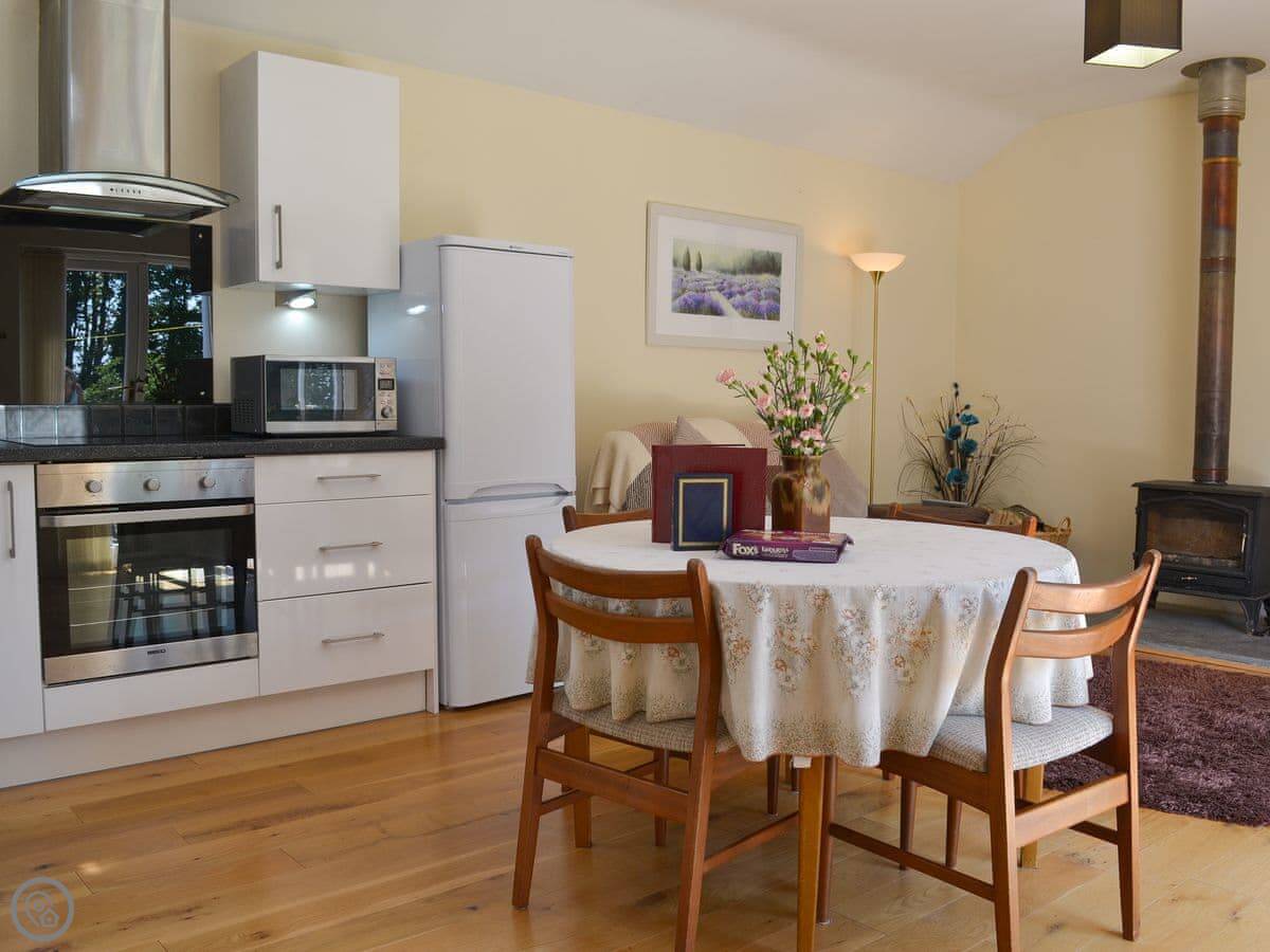 The main room is open plan and quite big, with French doors out to a south-facing garden. It gets the sun. There's a wood burner for the colder evenings. The kitchen is modern. You get a washing machine and a dishwasher.