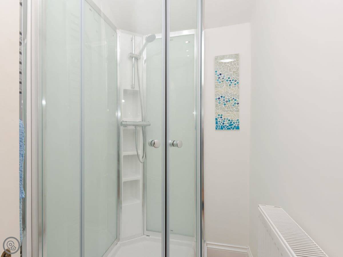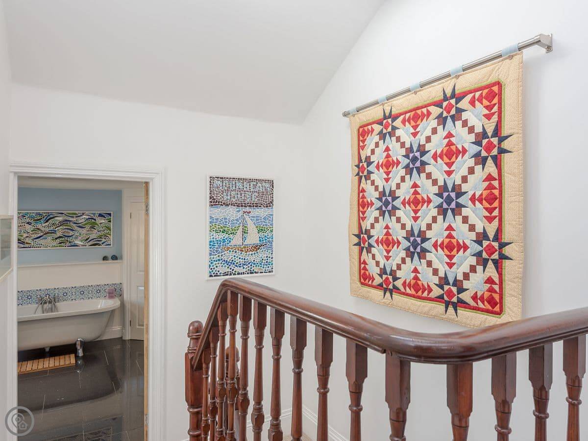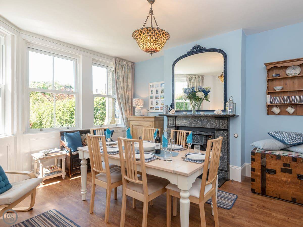 It sleeps six. Four bedrooms, two bathrooms, spread over three floors. It's got a 4 Star rating. The garden is at the back, and it's enclosed. There's parking on the drive.