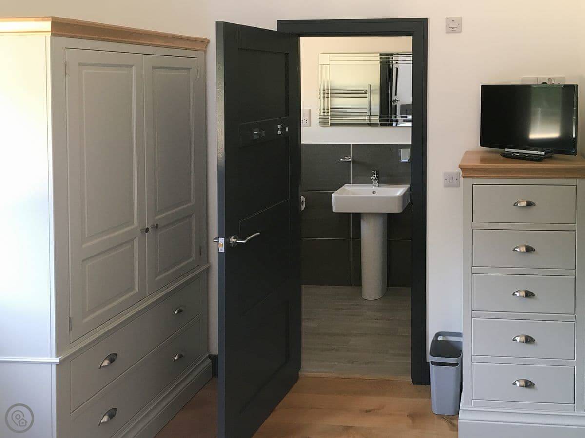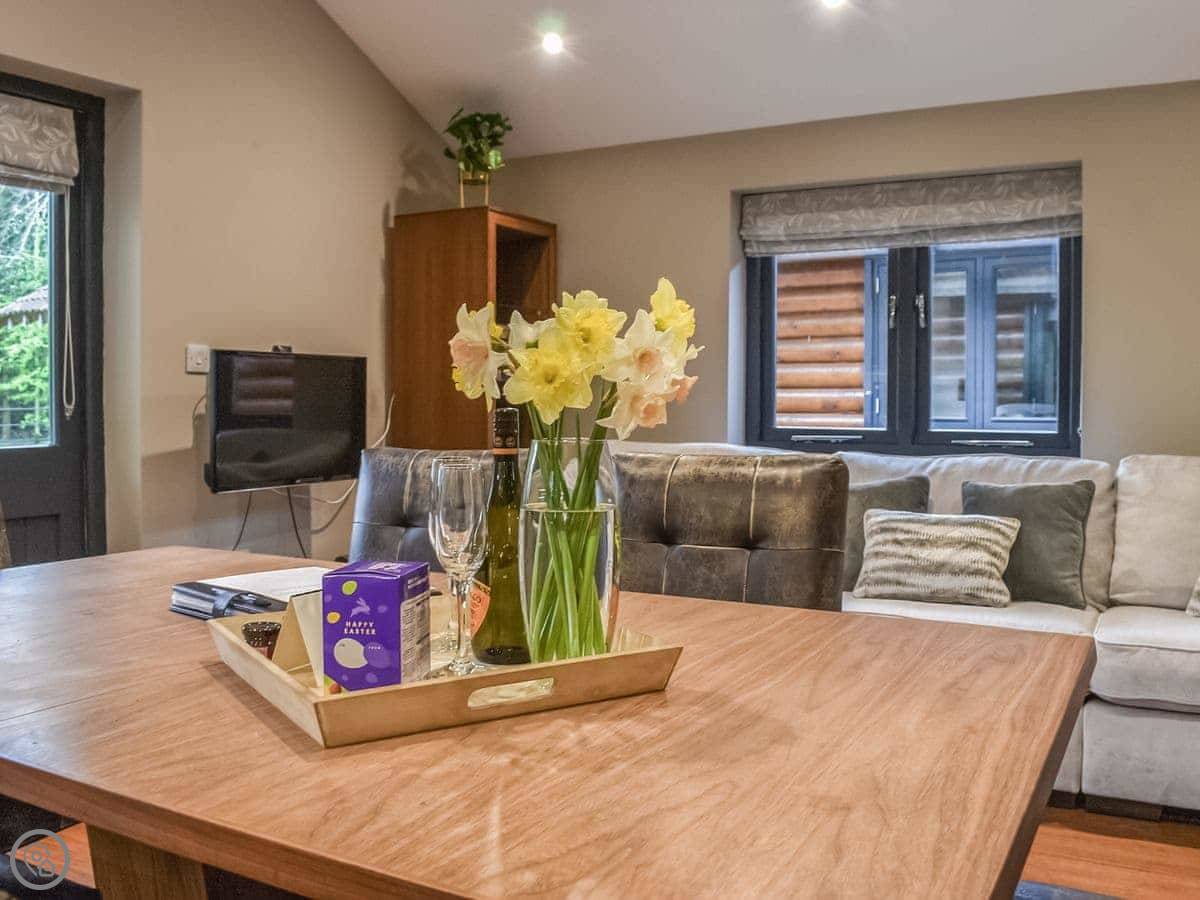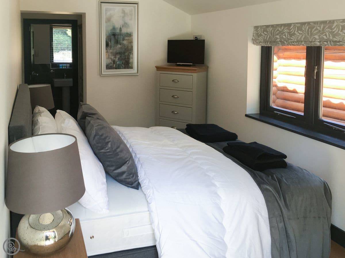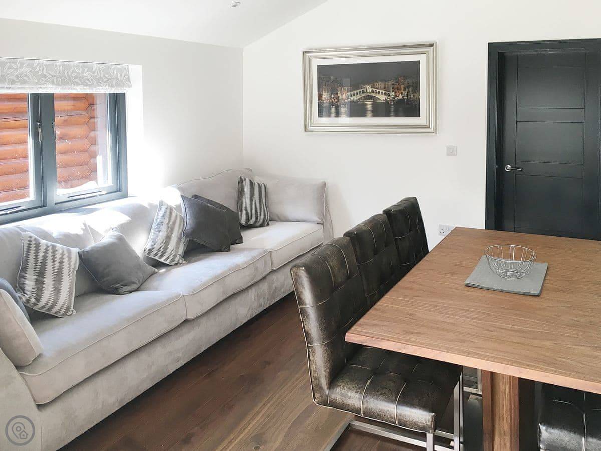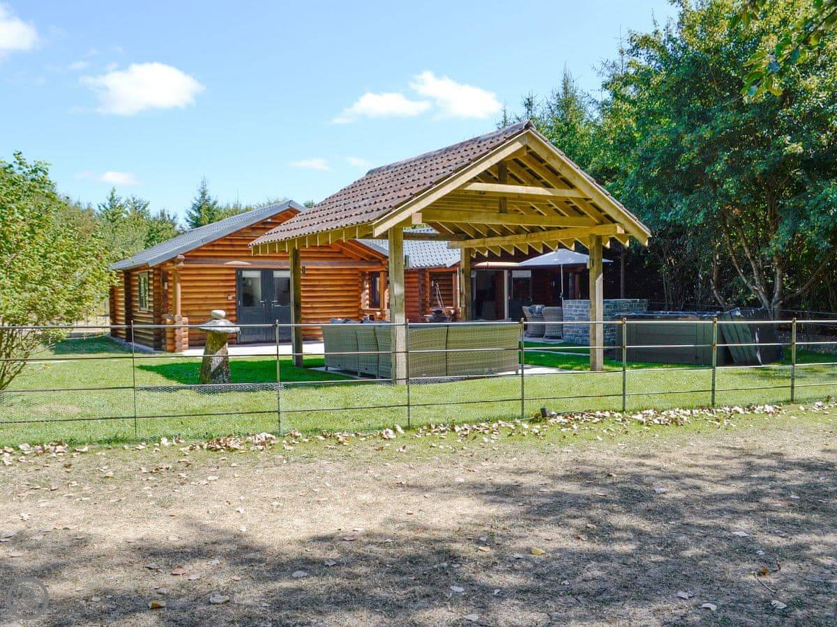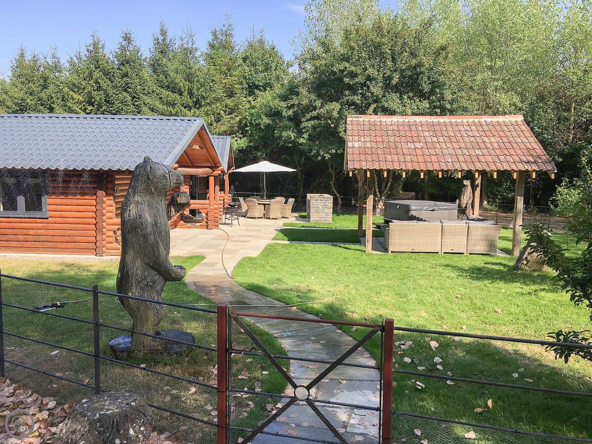 The Retreat is a wooden log cabin on our farm, down a track in the woods. It's completely detached and private. The main cabin has the living space, kitchen, and one bedroom with its own bathroom. About twenty yards away, there's a second, smaller cabin with the other two bedrooms. They both have their own bathrooms too. So, six people, but everyone gets their own space and their own shower.
