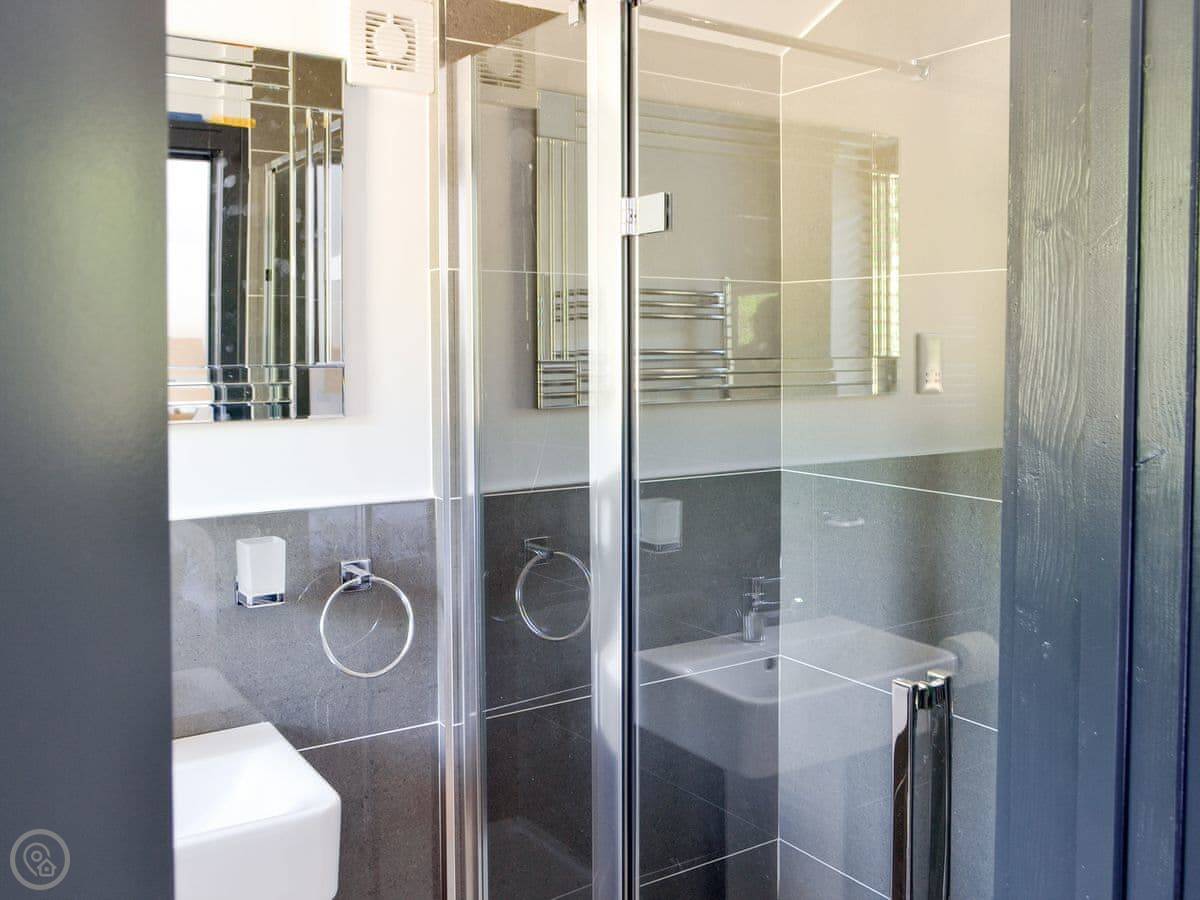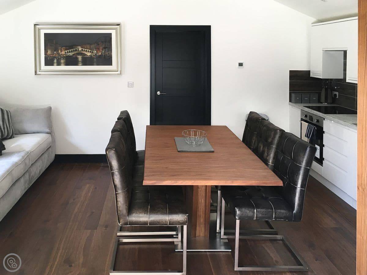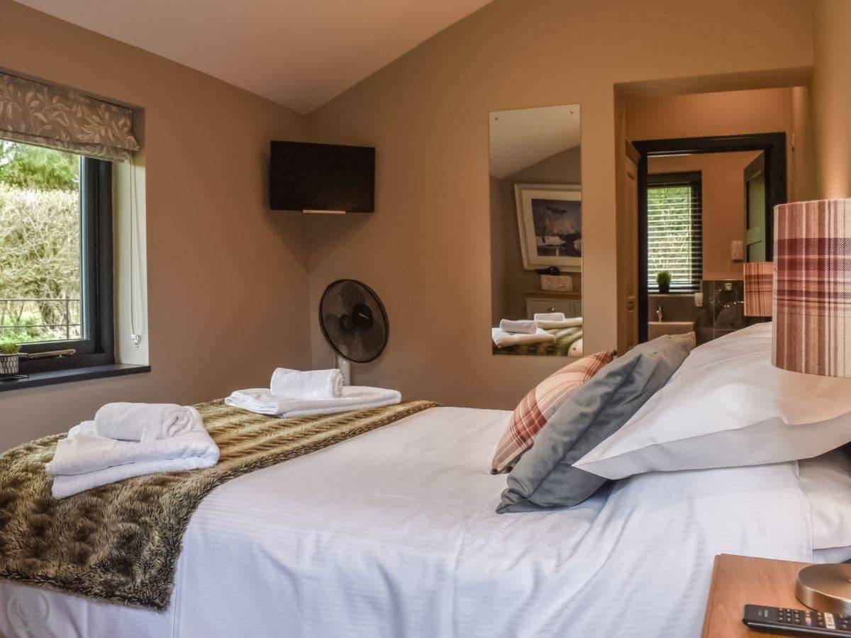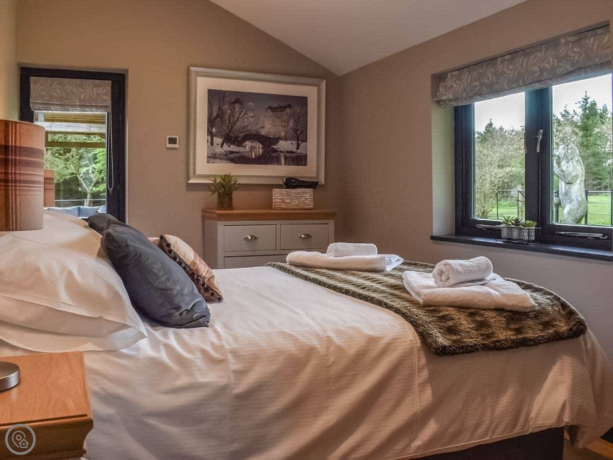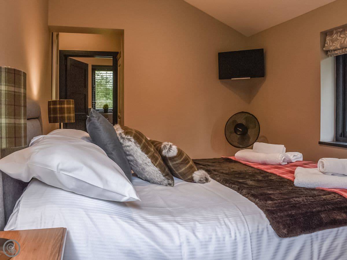 The Retreat is a wooden log cabin on our farm, down a track in the woods. It's completely detached and private. The main cabin has the living space, kitchen, and one bedroom with its own bathroom. About twenty yards away, there's a second, smaller cabin with the other two bedrooms. They both have their own bathrooms too. So, six people, but everyone gets their own space and their own shower.