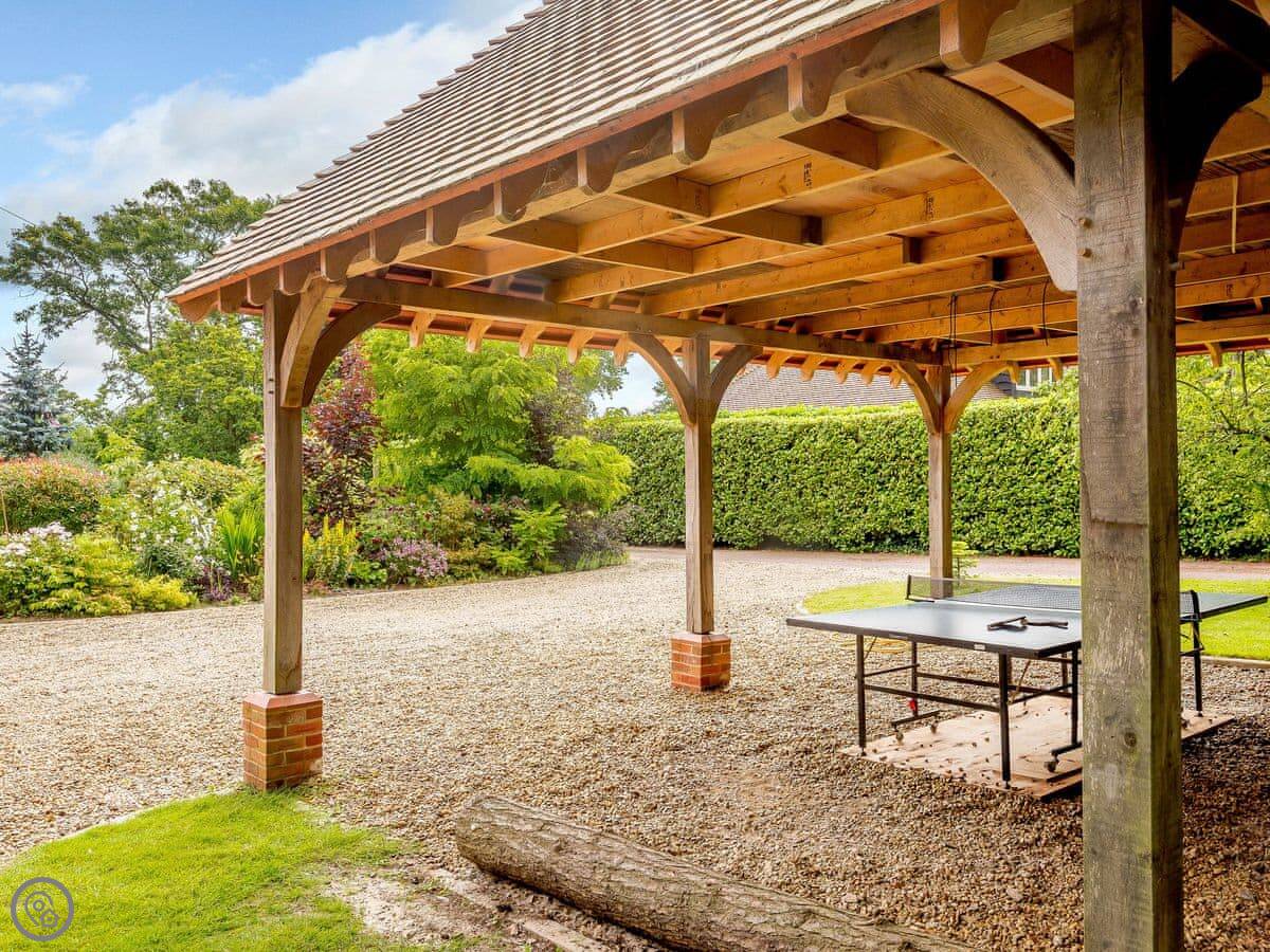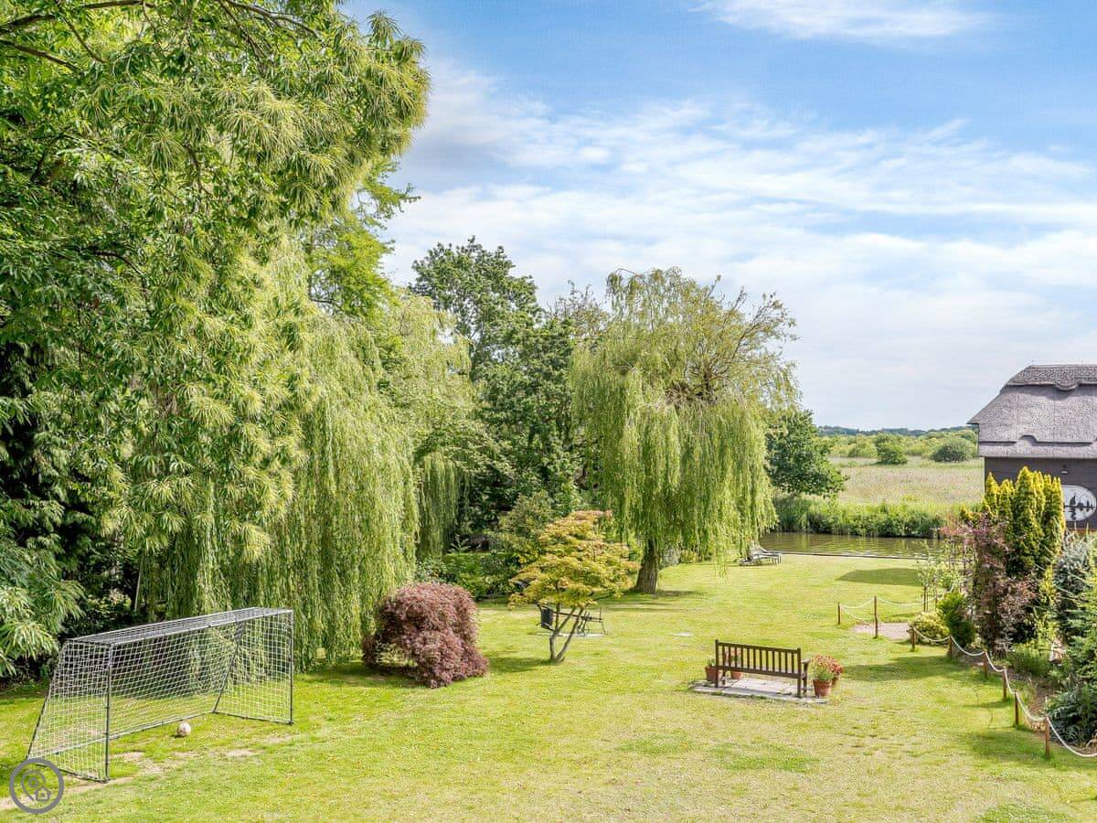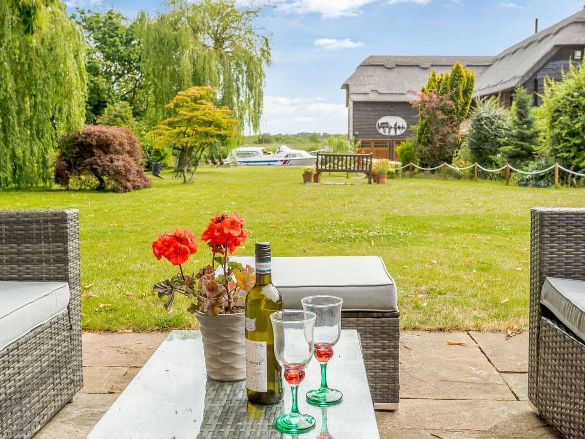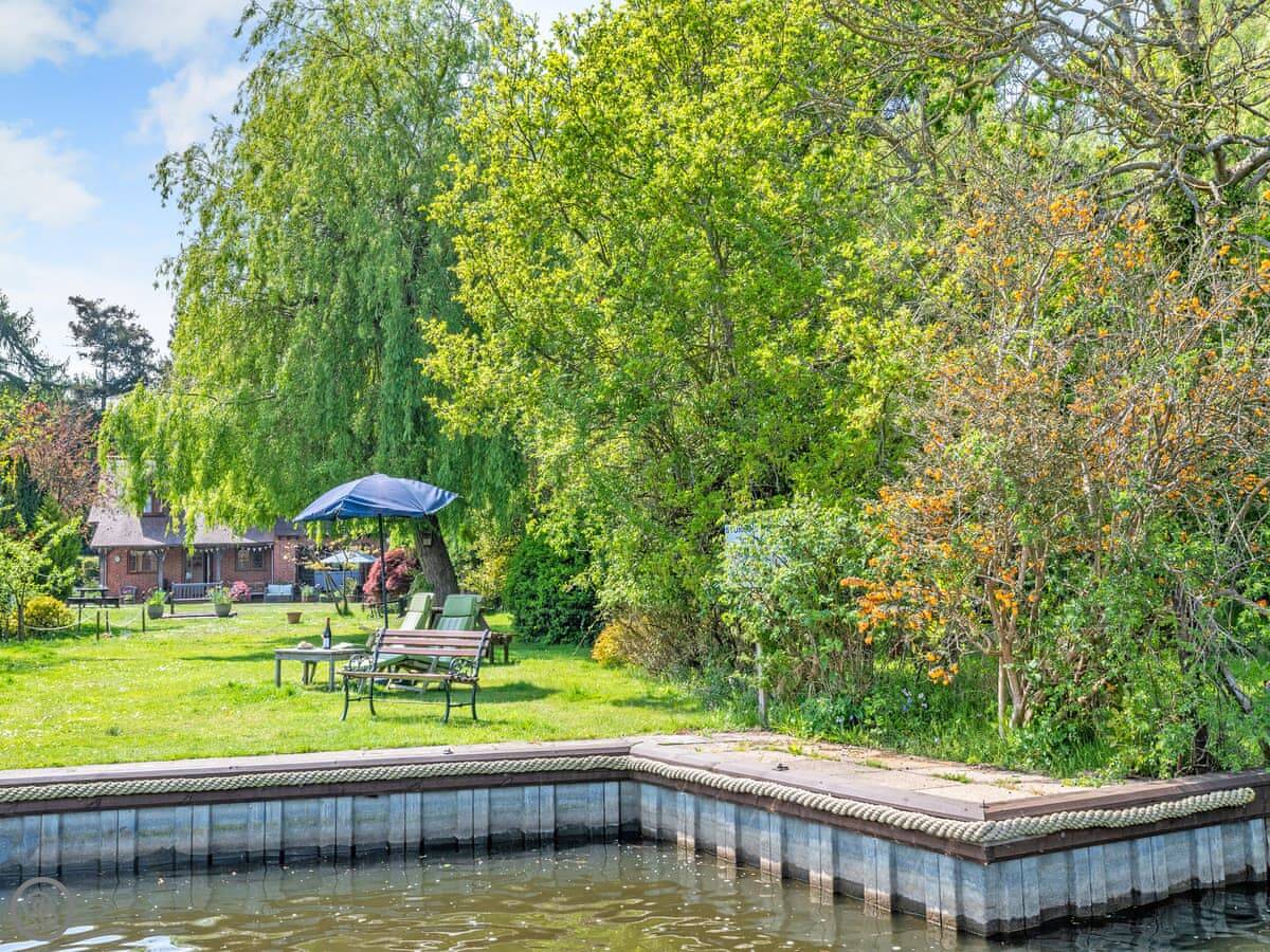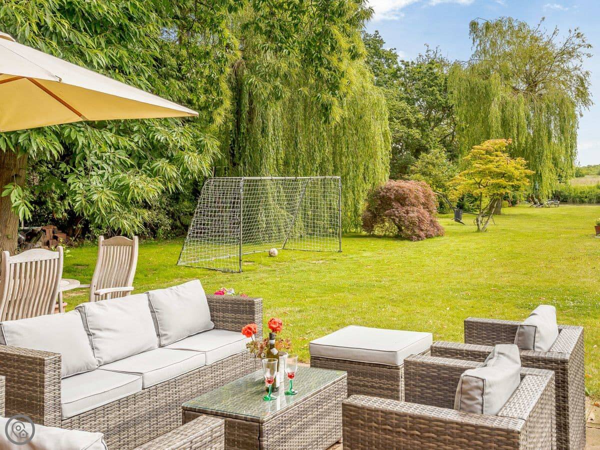 You get the lawn, a terrace to sit out on, and a cart shed with a table tennis table in it. The river frontage is yours, so you can fish from the bank if that's your thing.
