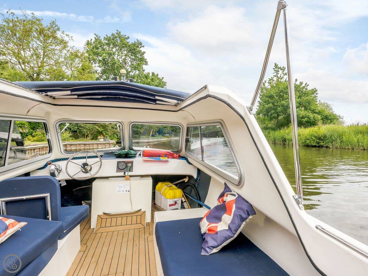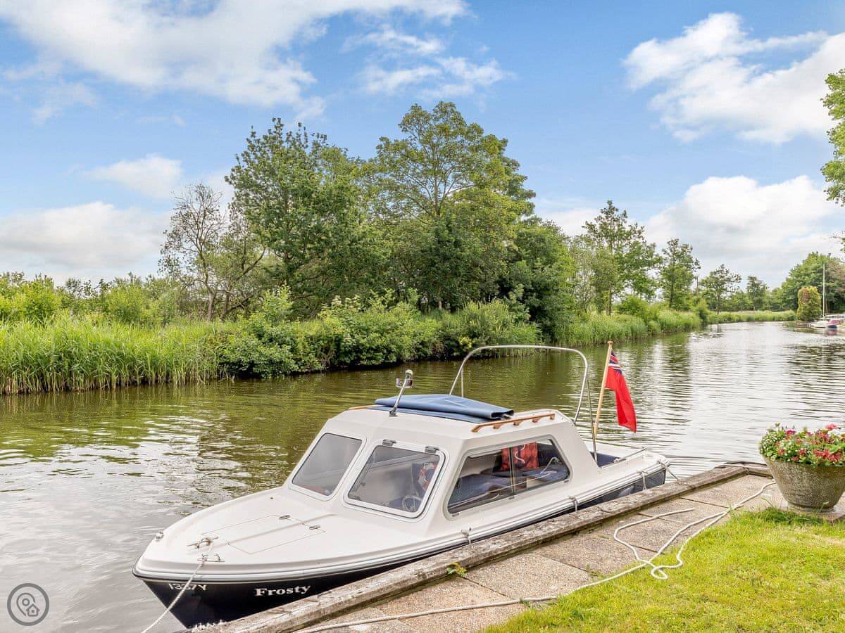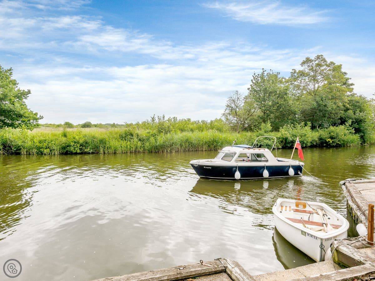 The real point here is the location on the water. We have boats you can hire from us directly. There's a six-seater motor launch and a rowing dinghy. You can also book experiences on our classic Broads cruiser or 1930s yacht if you want something different. All that needs arranging with us before you come.