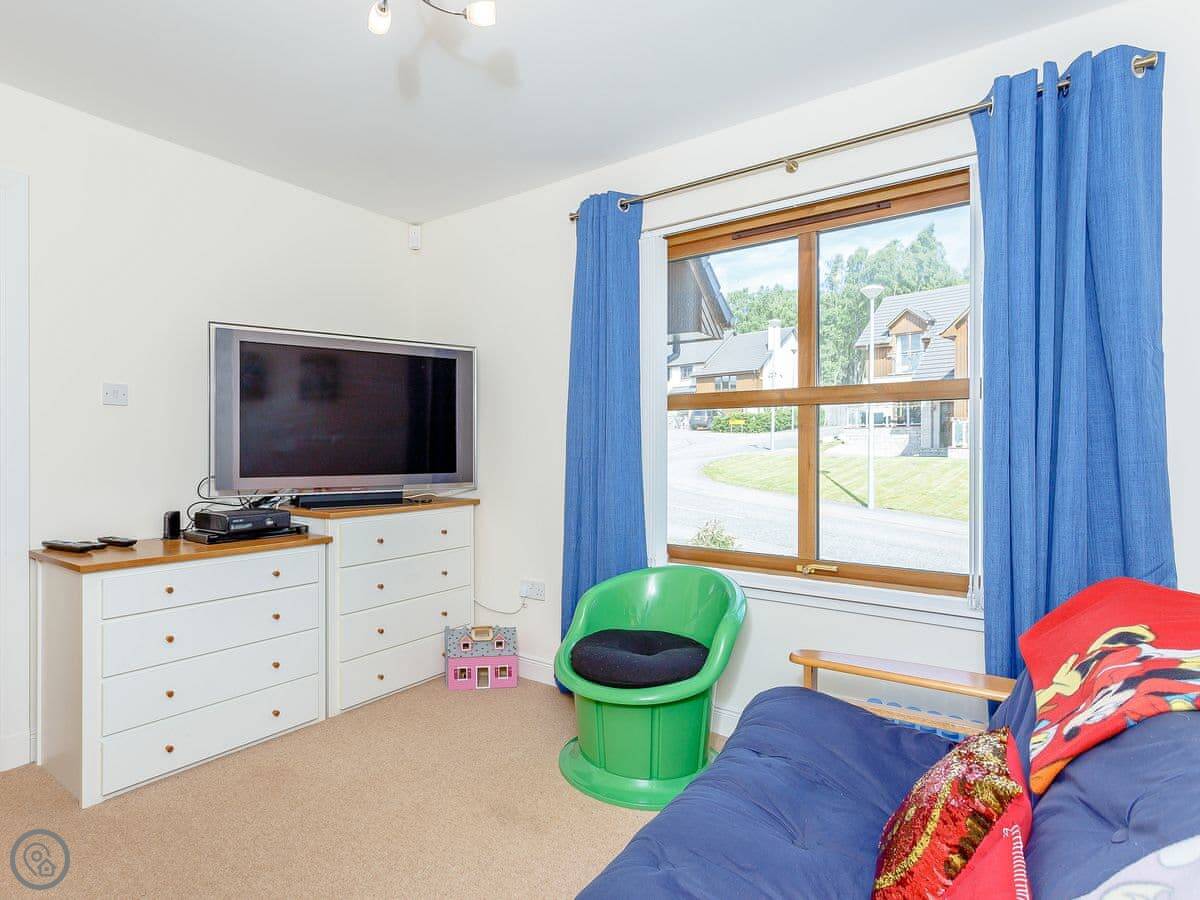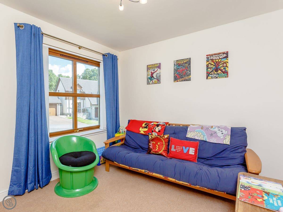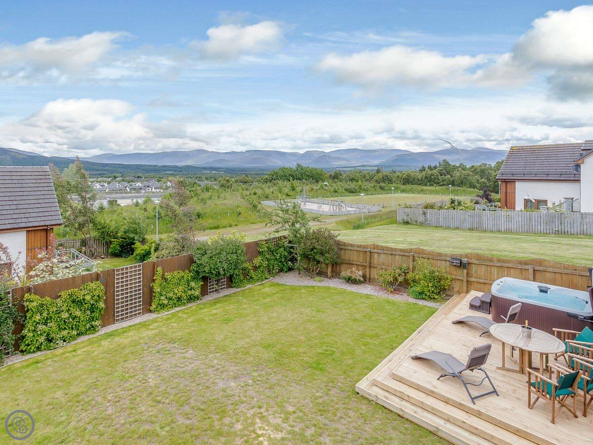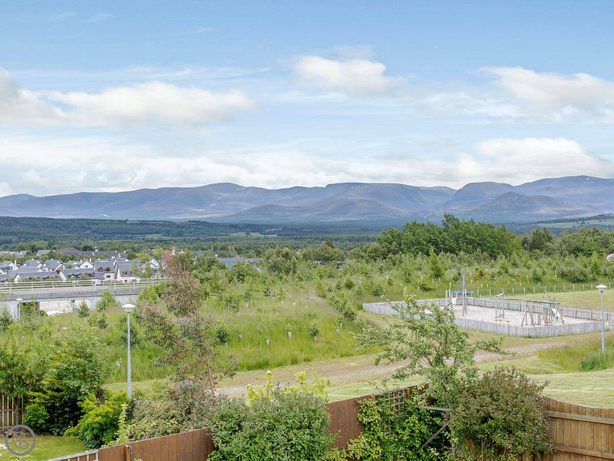 The house is on a quiet road next to a children's play park. You can walk into the town centre in about fifteen minutes. There's a shop, pub, and restaurants about a quarter of a mile away. The views from the front are straight out over the fields to the Cairngorms.