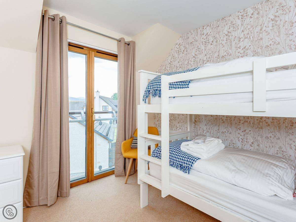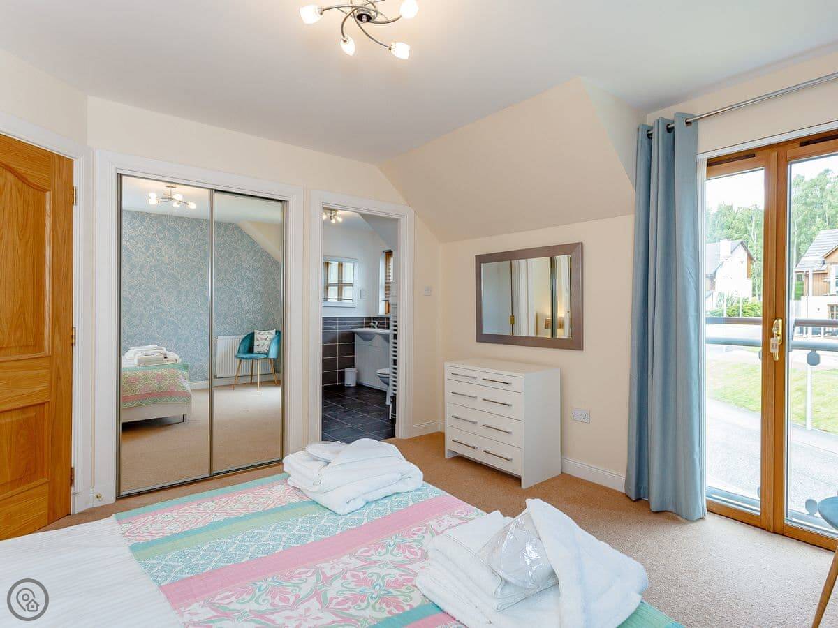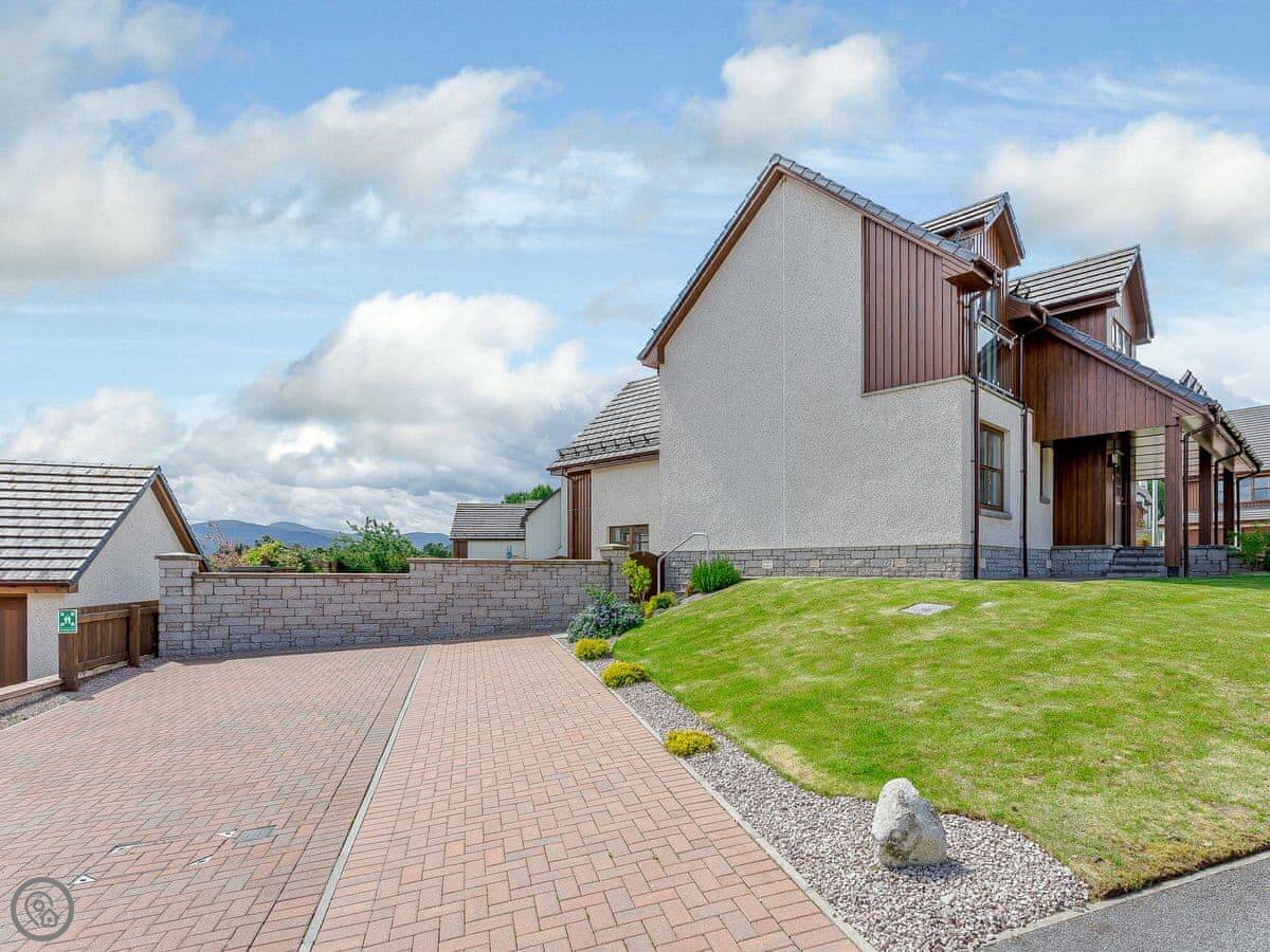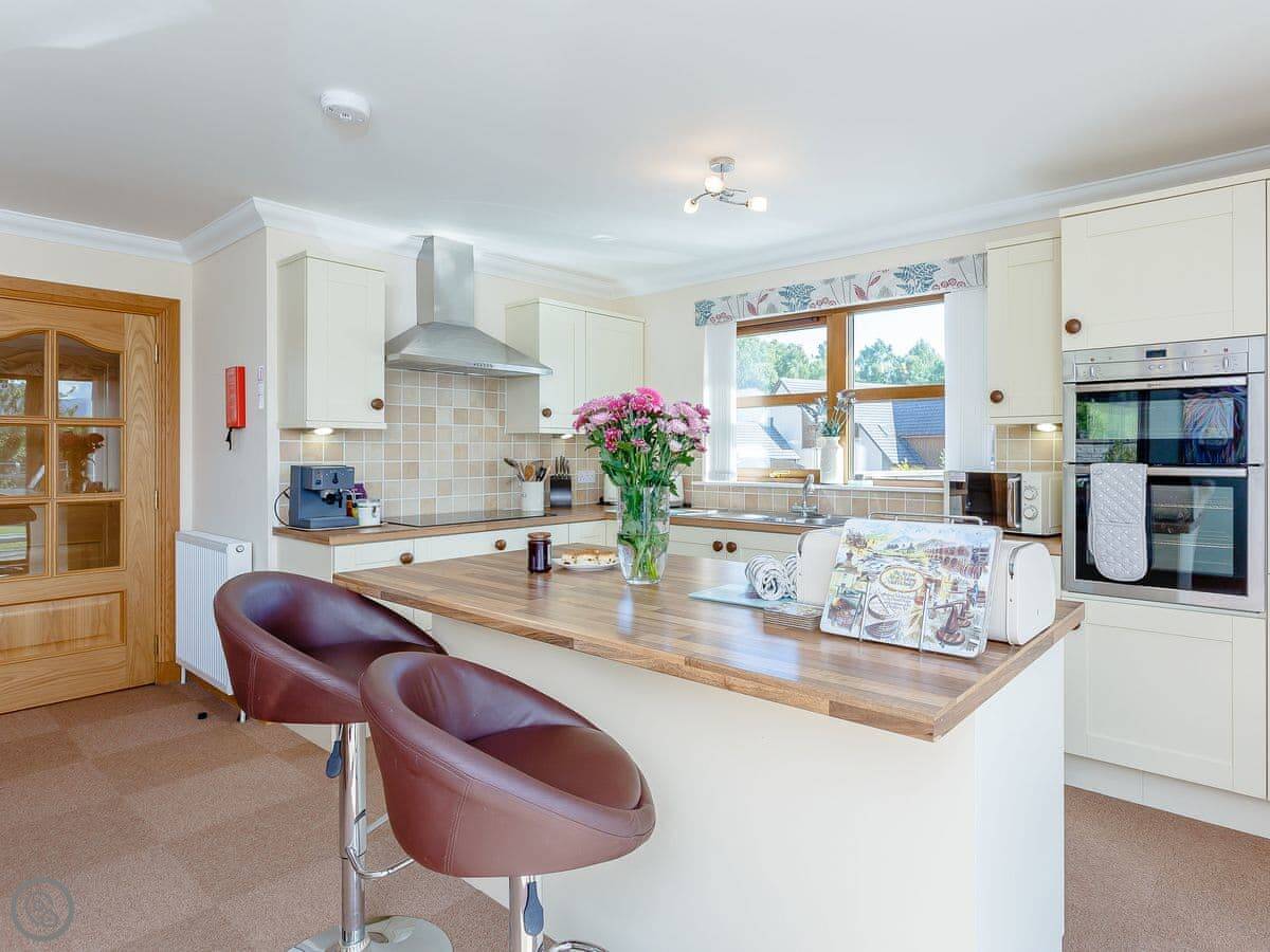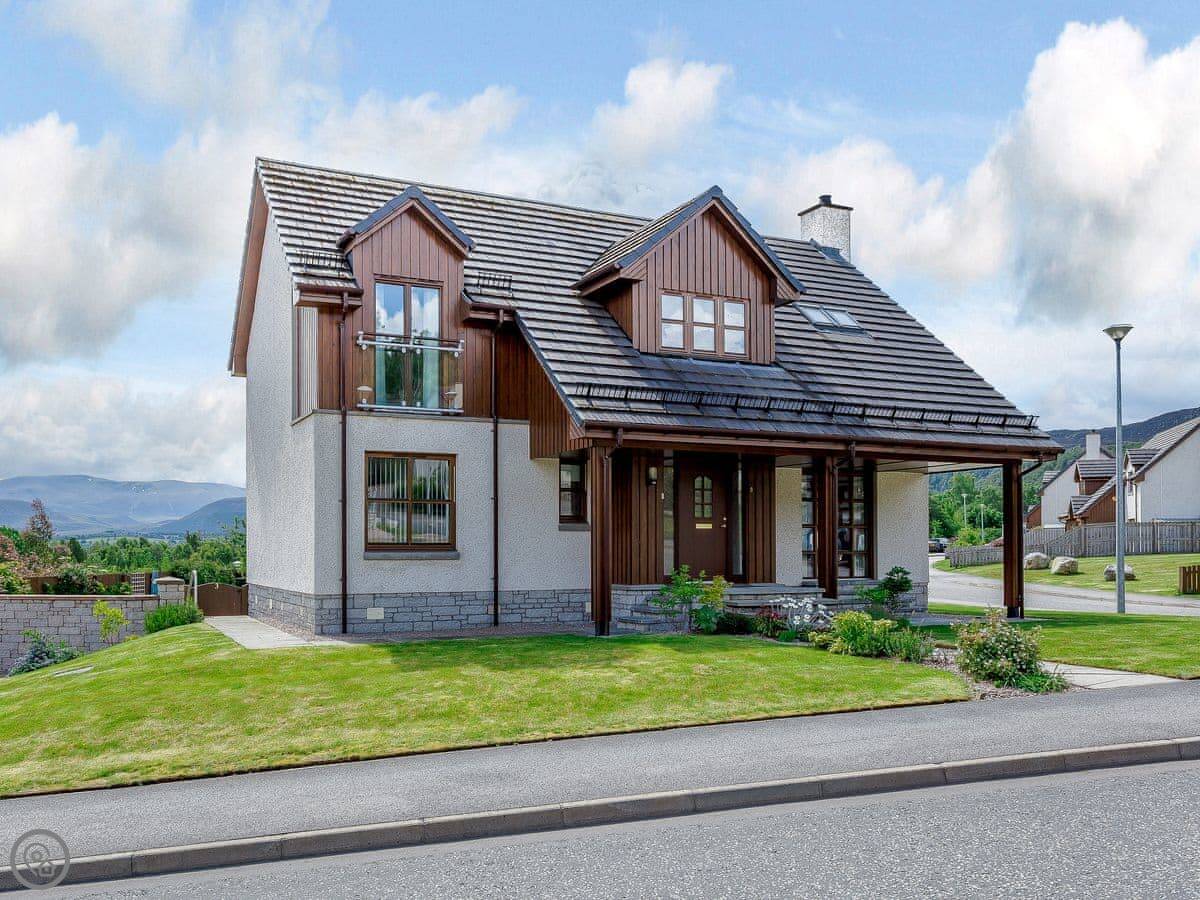 The house is on a quiet road next to a children's play park. You can walk into the town centre in about fifteen minutes. There's a shop, pub, and restaurants about a quarter of a mile away. The views from the front are straight out over the fields to the Cairngorms.