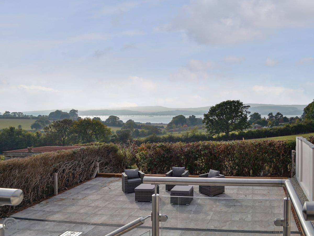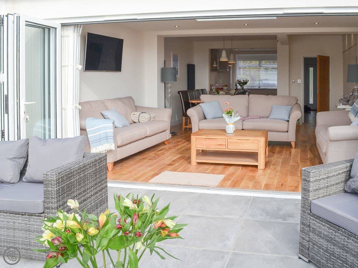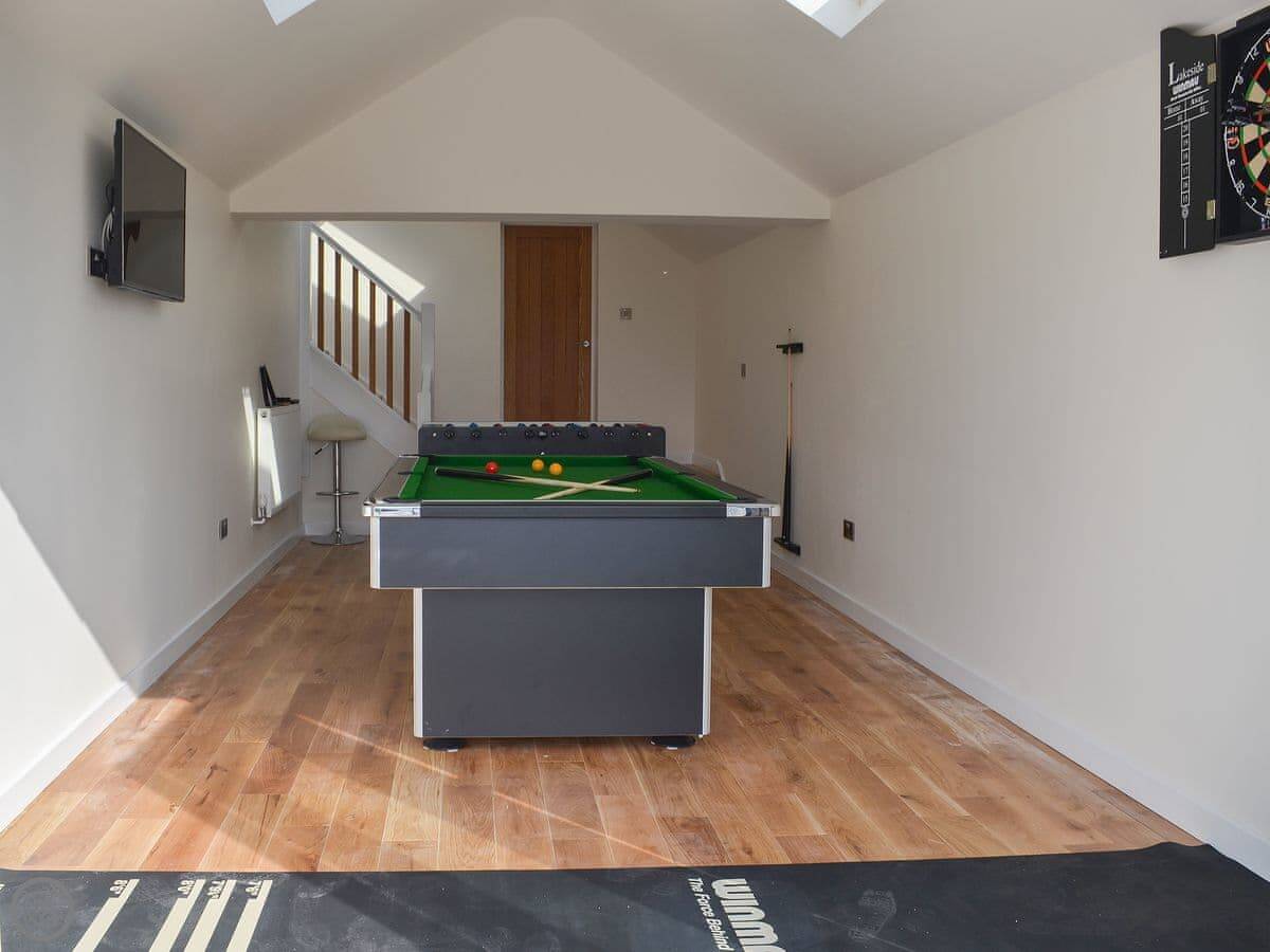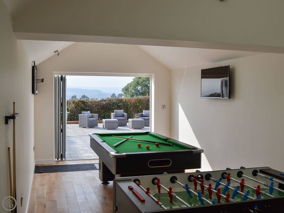 The living area has big doors that open onto a deck. You can sit out there. Downstairs there's a games room with a pool table and table football. There's also a table tennis table on the lower patio.