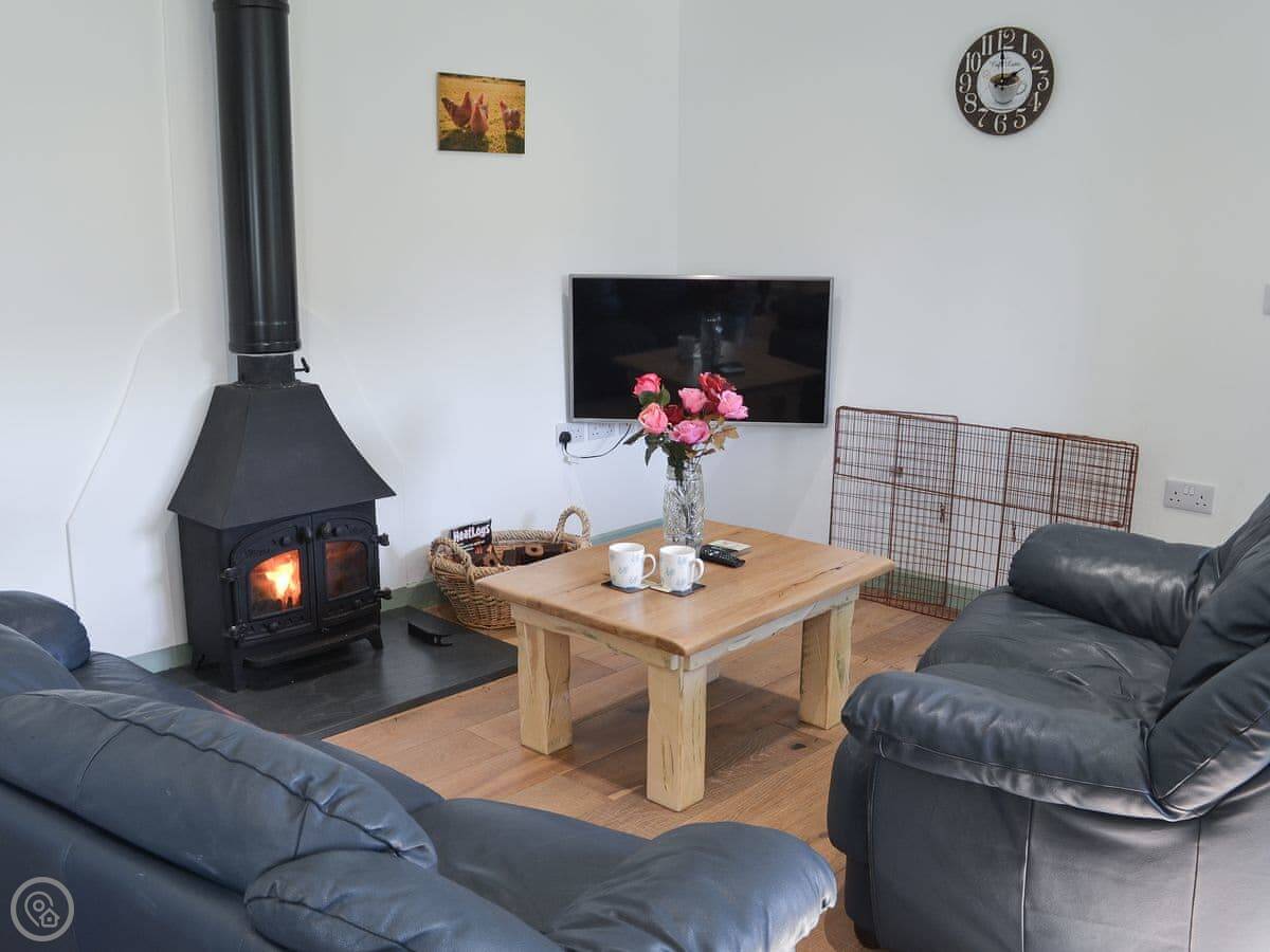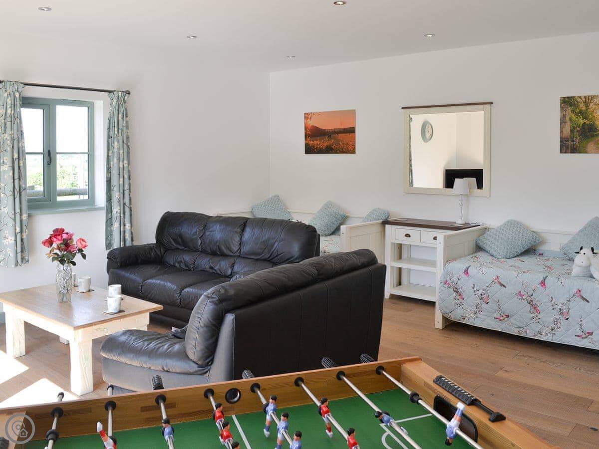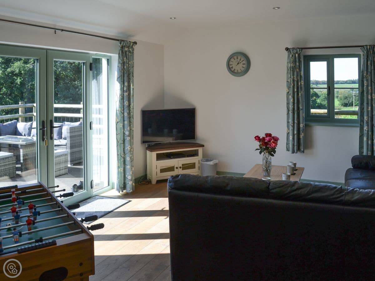 The main room is open plan, with a wood burner. There's a separate sitting room with a couple of day beds if you need them. That room has table football and doors out to the garden. The garden is enclosed and gets the sun. You can see the fields from there.