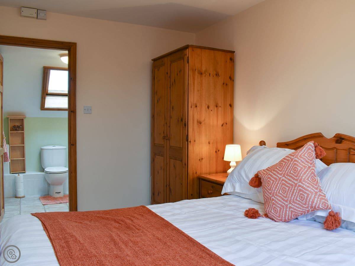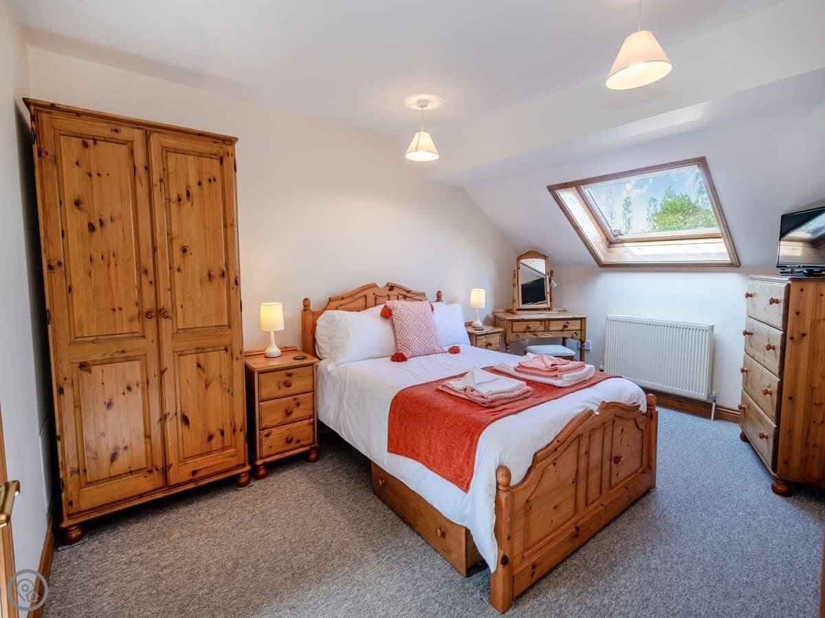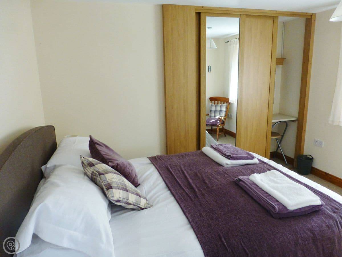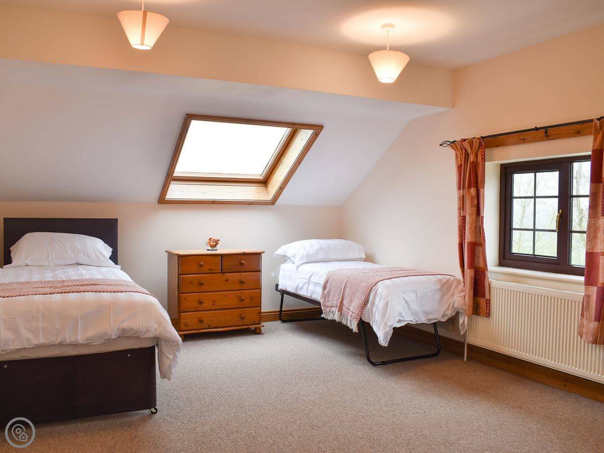 It sleeps six but there are only two bedrooms. One downstairs with a double bed and its own bathroom. Upstairs is the main bedroom with an en-suite, and it leads through to a small room with two single sofa beds. Fine for kids. The stairs are cottage stairs, so a bit steep.
