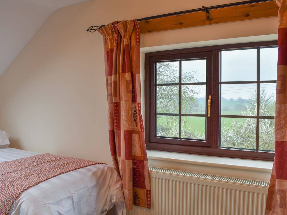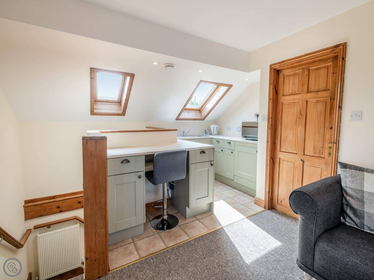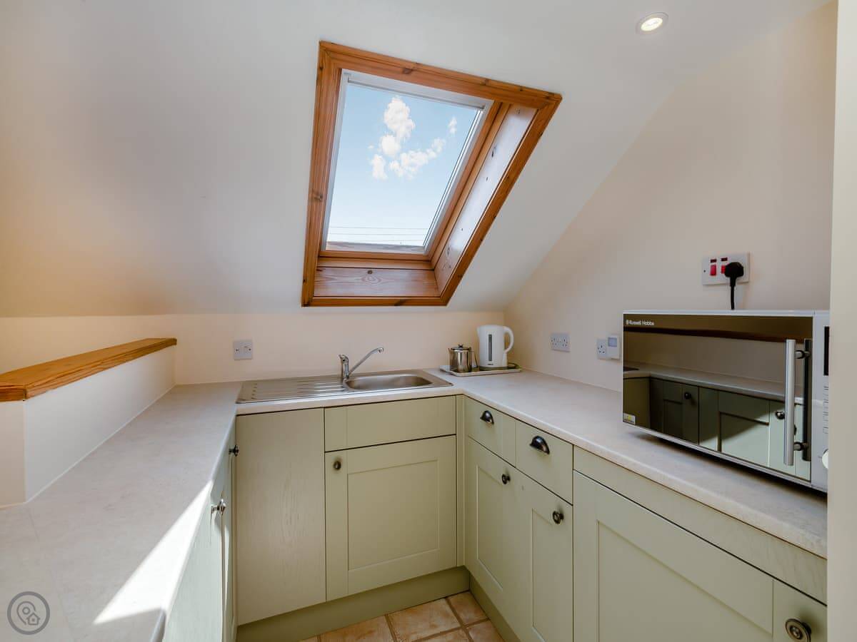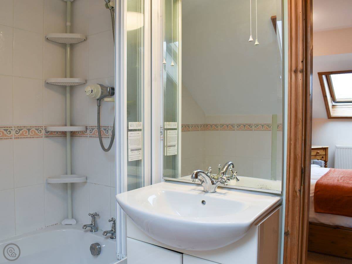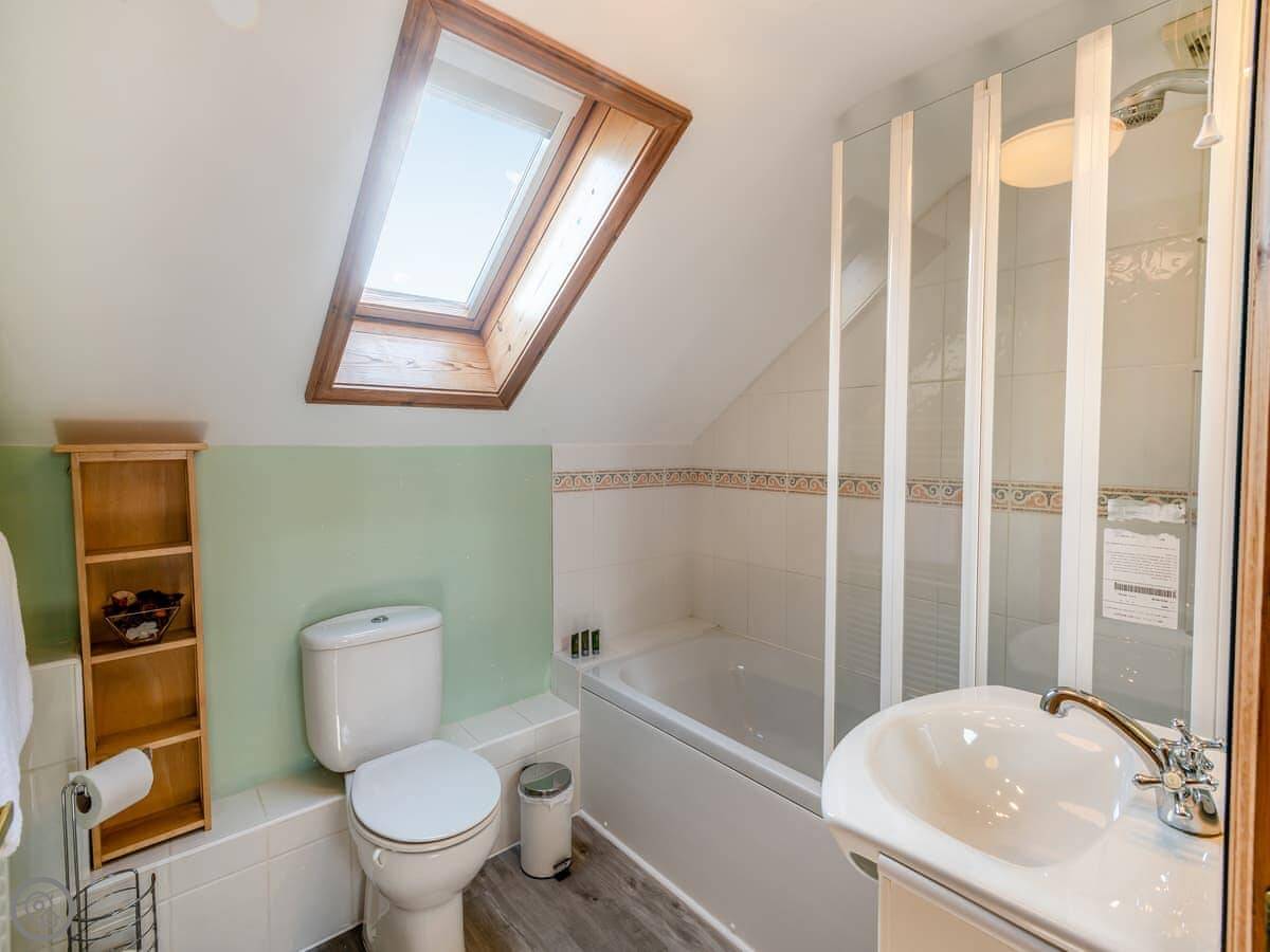 It sleeps six but there are only two bedrooms. One downstairs with a double bed and its own bathroom. Upstairs is the main bedroom with an en-suite, and it leads through to a small room with two single sofa beds. Fine for kids. The stairs are cottage stairs, so a bit steep.