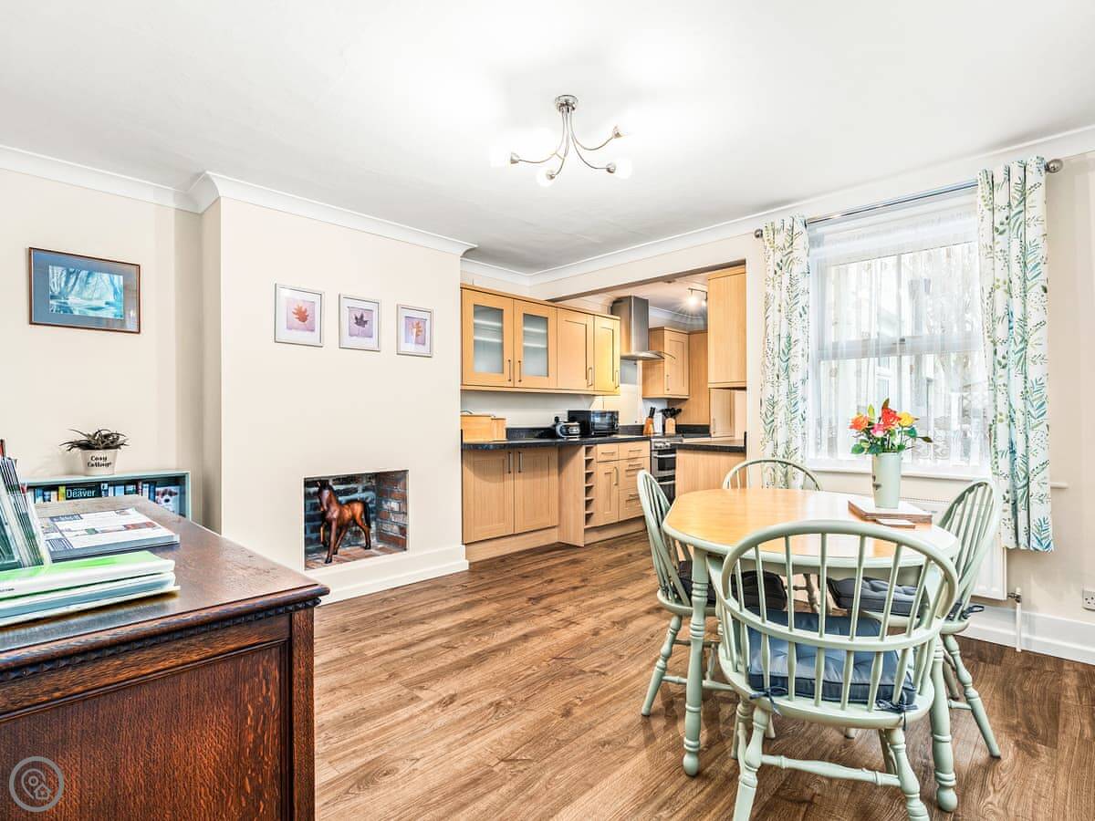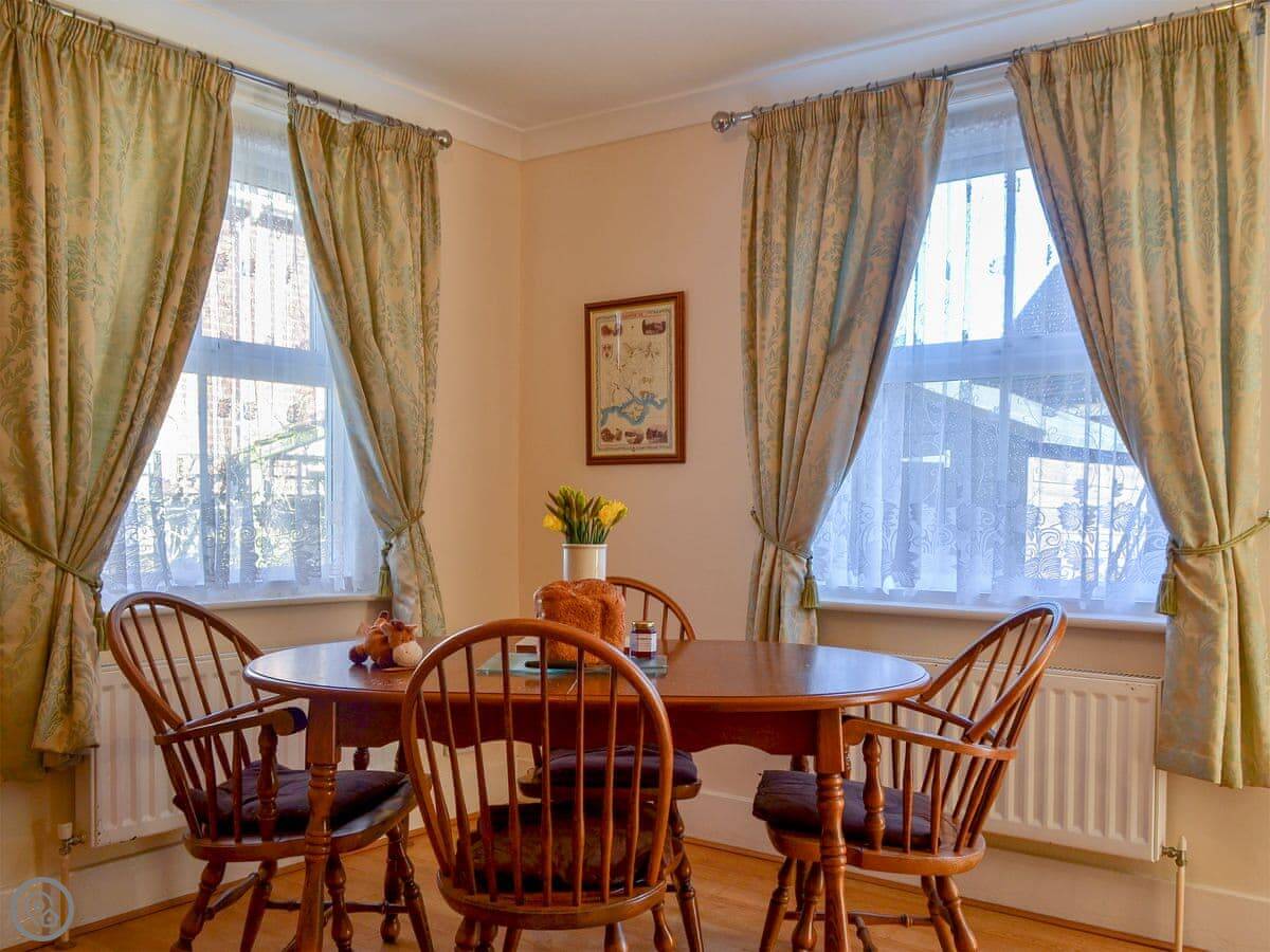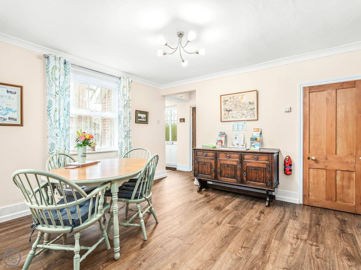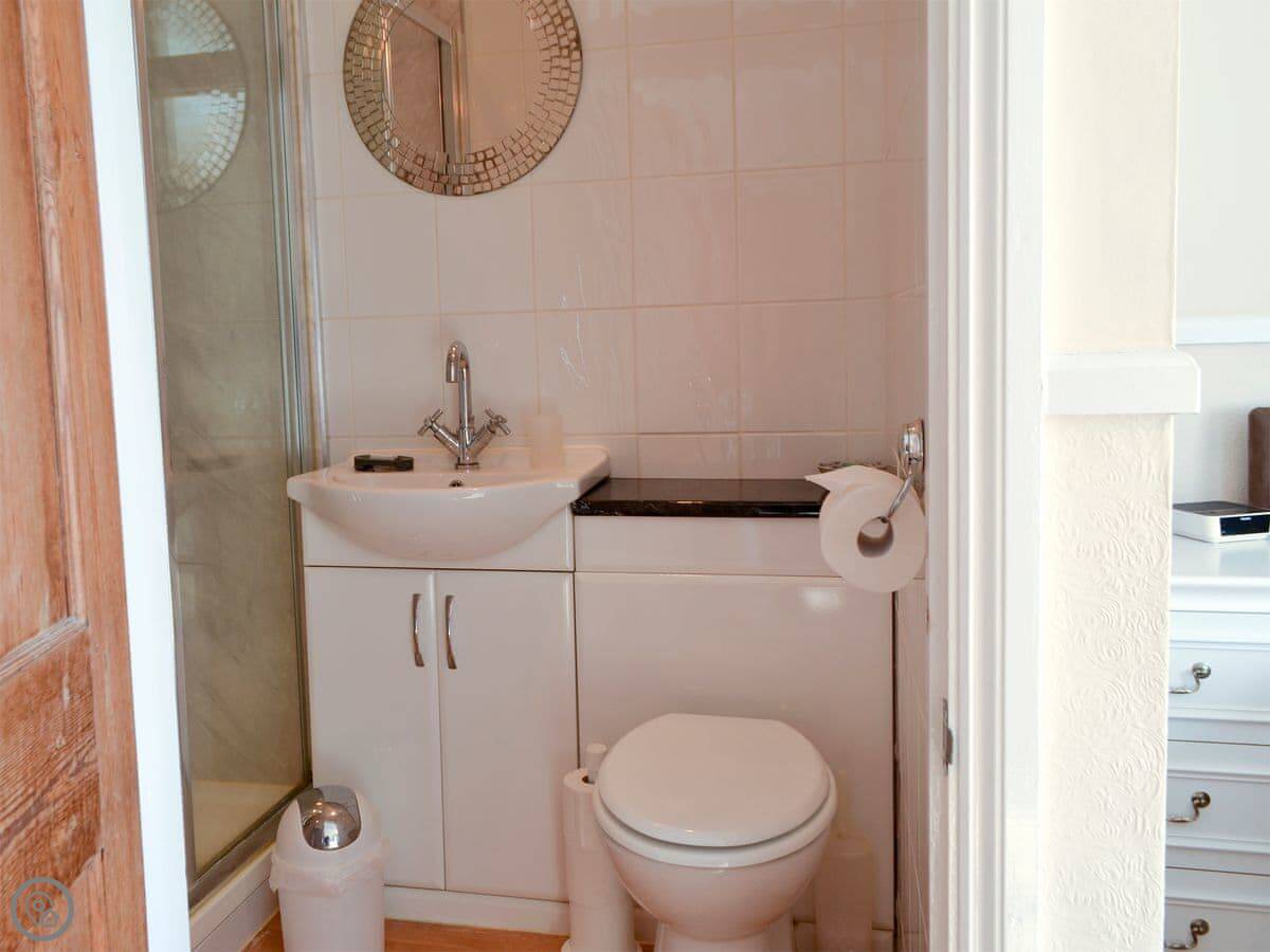 It sleeps four. Two bedrooms, both with their own ensuite shower rooms. It's got a 4 Star rating. That means it's well-equipped and comfortable. The layout is a bit different. The front door opens into the dining area. From there you go into the kitchen, then through to the living room. There's a toilet on the ground floor too.