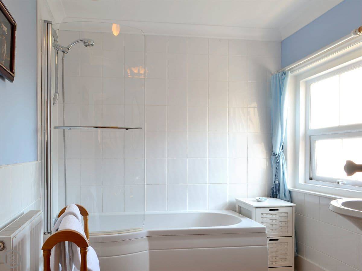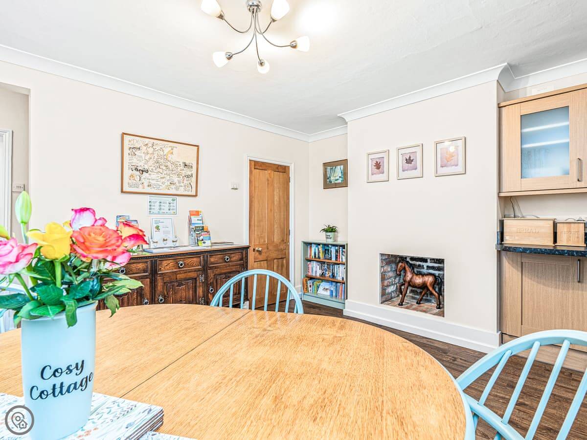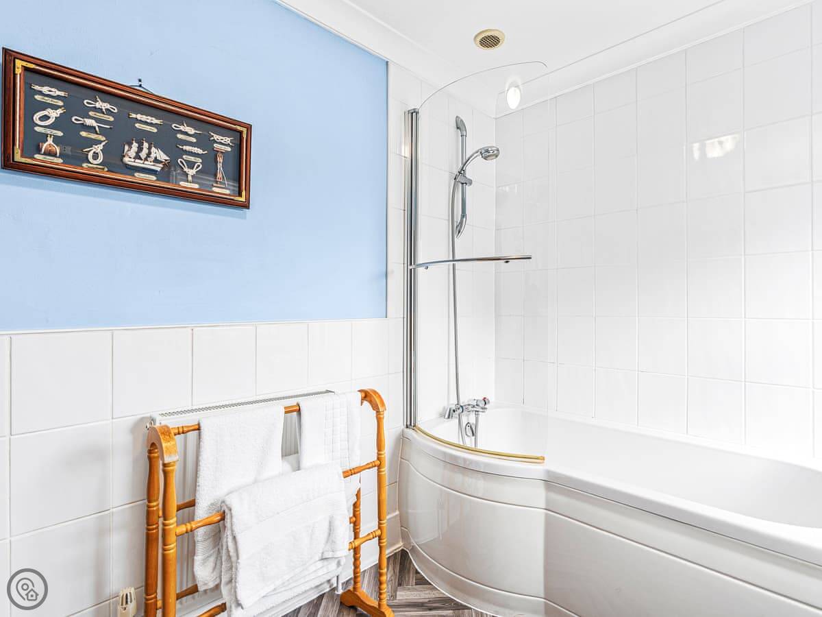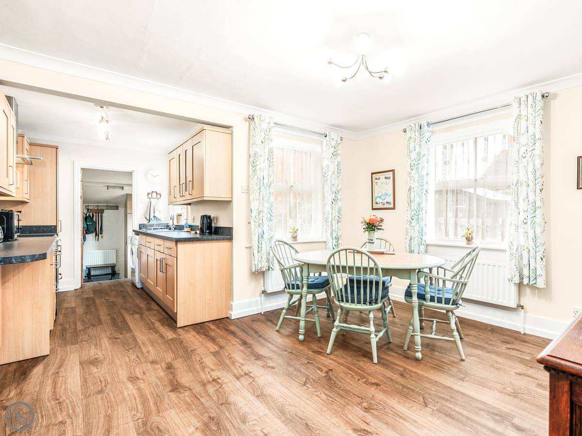 It sleeps four. Two bedrooms, both with their own ensuite shower rooms. It's got a 4 Star rating. That means it's well-equipped and comfortable. The layout is a bit different. The front door opens into the dining area. From there you go into the kitchen, then through to the living room. There's a toilet on the ground floor too.