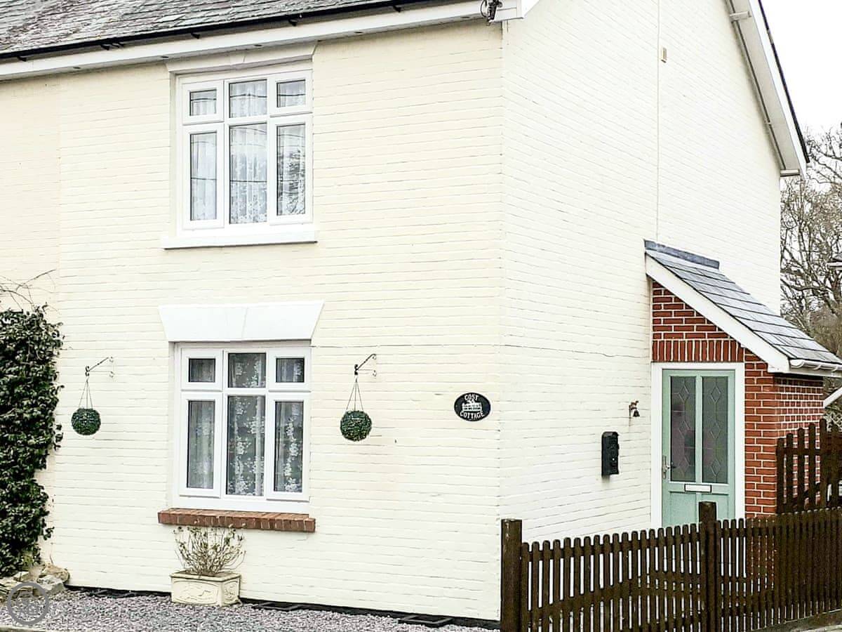 Cosy Cottage is on Flora Road in Lyndhurst. It's a semi-detached cottage. From the front it looks like most houses on the street, which is a quiet one.