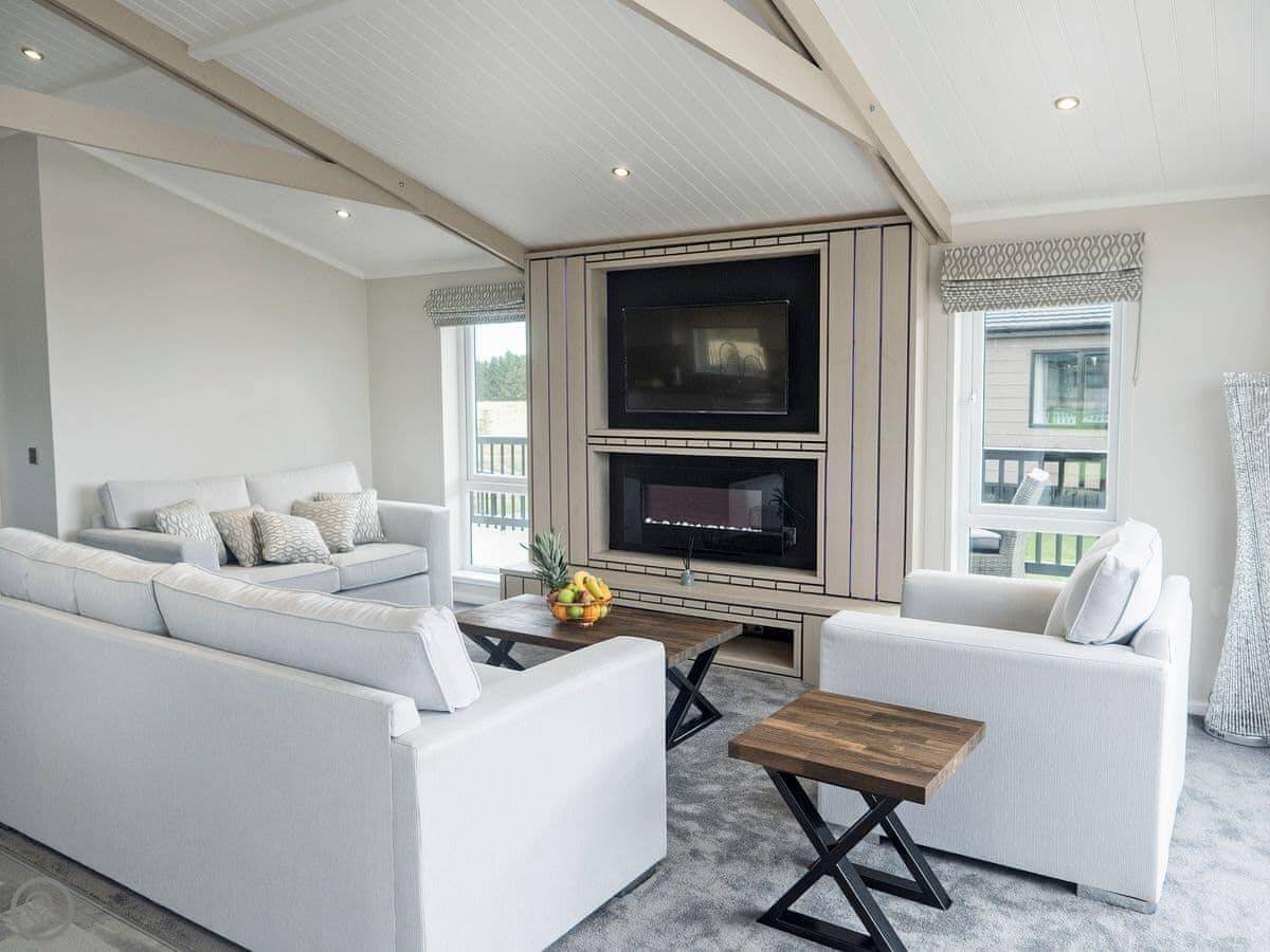 It sleeps six, with three bedrooms and two bathrooms. It's a 5 Star lodge, so it's well-equipped and finished to a high standard. You get a hot tub on the deck, and a wood burner inside for cooler evenings.