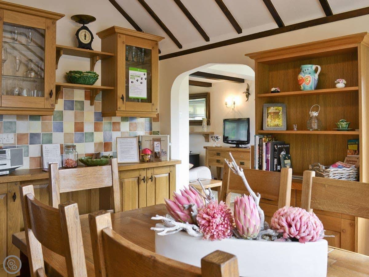 It's got a 5 Star rating. That means it's well equipped and finished to a high standard. You get a washing machine, dishwasher, WiFi, and TV. The garden is enclosed. Bedding is included. There's a cot and highchair if you need them. You can bring up to two dogs.