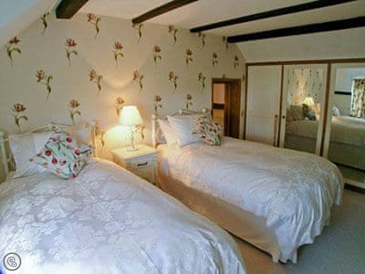 It sleeps six, in three bedrooms. Two of them are upstairs, one is on the ground floor. There are two bathrooms, one upstairs and one down. The stairs are the original cottage stairs. They're steep and a bit narrow.