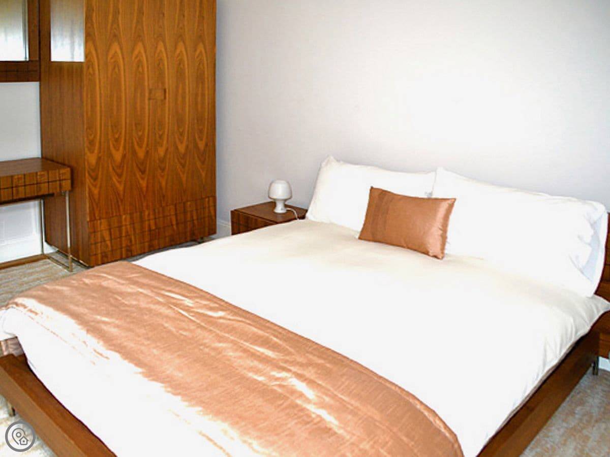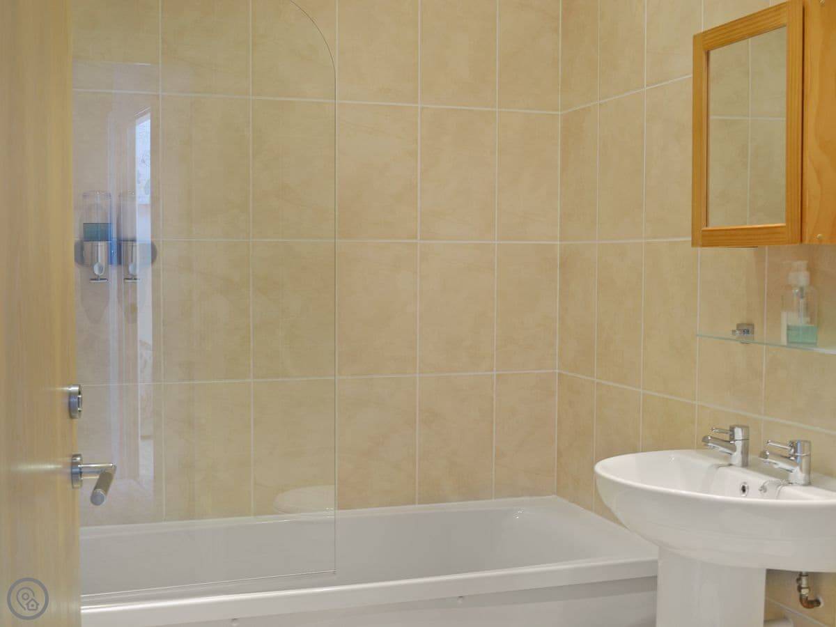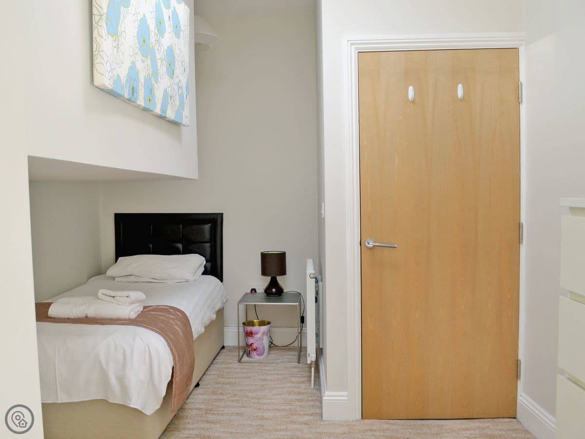 It sleeps six, with two bedrooms and one bathroom. The bathroom has a shower over the bath. It's got a 4 Star rating. It's modern and clean inside. The stairs up to the flat are the main building stairs.