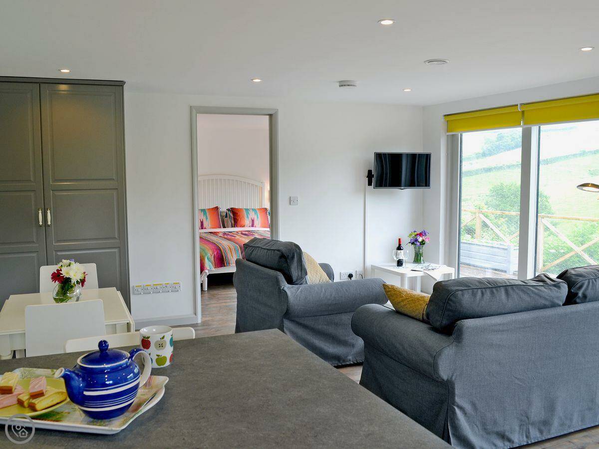 It's for two people. One bedroom, one bathroom. It's got a 4 Star rating. The main thing is the windows in the living area. They're full height. It feels a bit like sitting outside when you're inside.